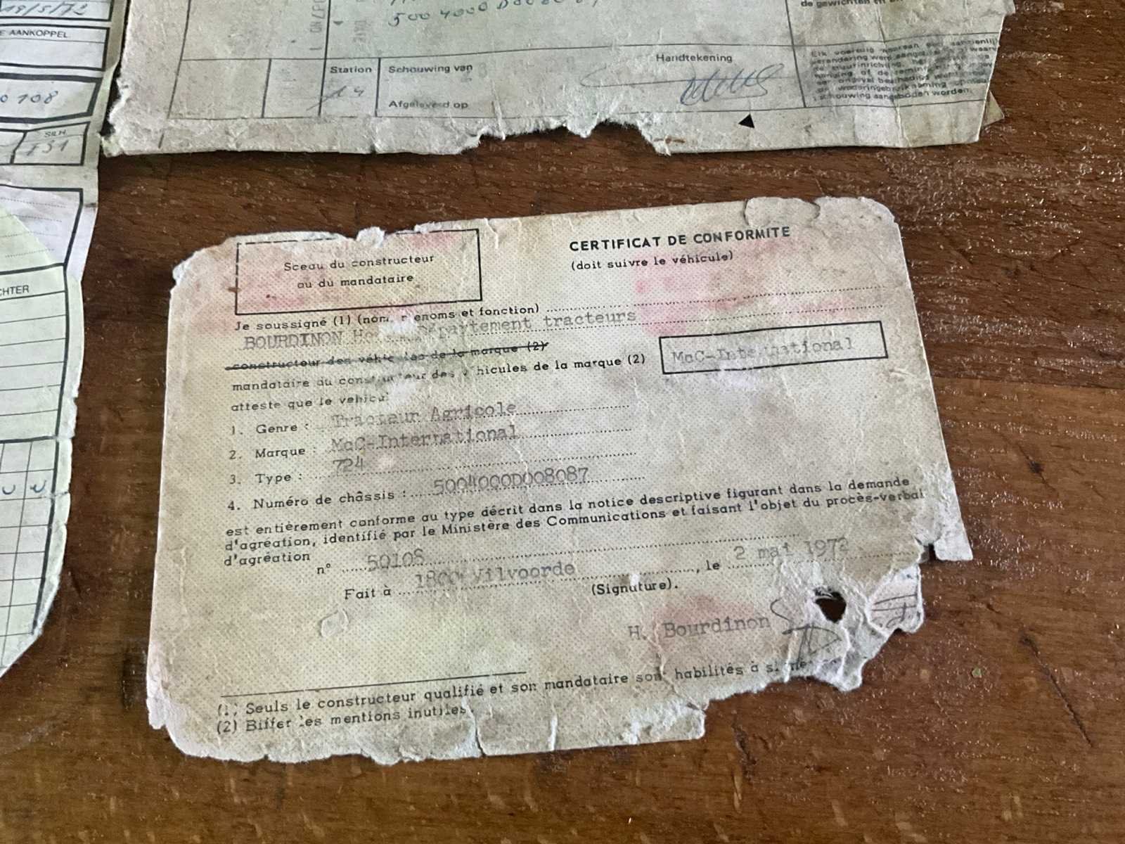 Aanwezige documenten:schouwingsbewijs, conformiteitsattest en identificatieverslag, Merk: McCormick Type: 724 Bouwjaar: 1972 Afgelezen urenstand: 7520 Cabine: true Chassisnummer: 5004000D008087 Datum eerste toelating: 19/05/1972 Nationaliteit documenten: Belgisch