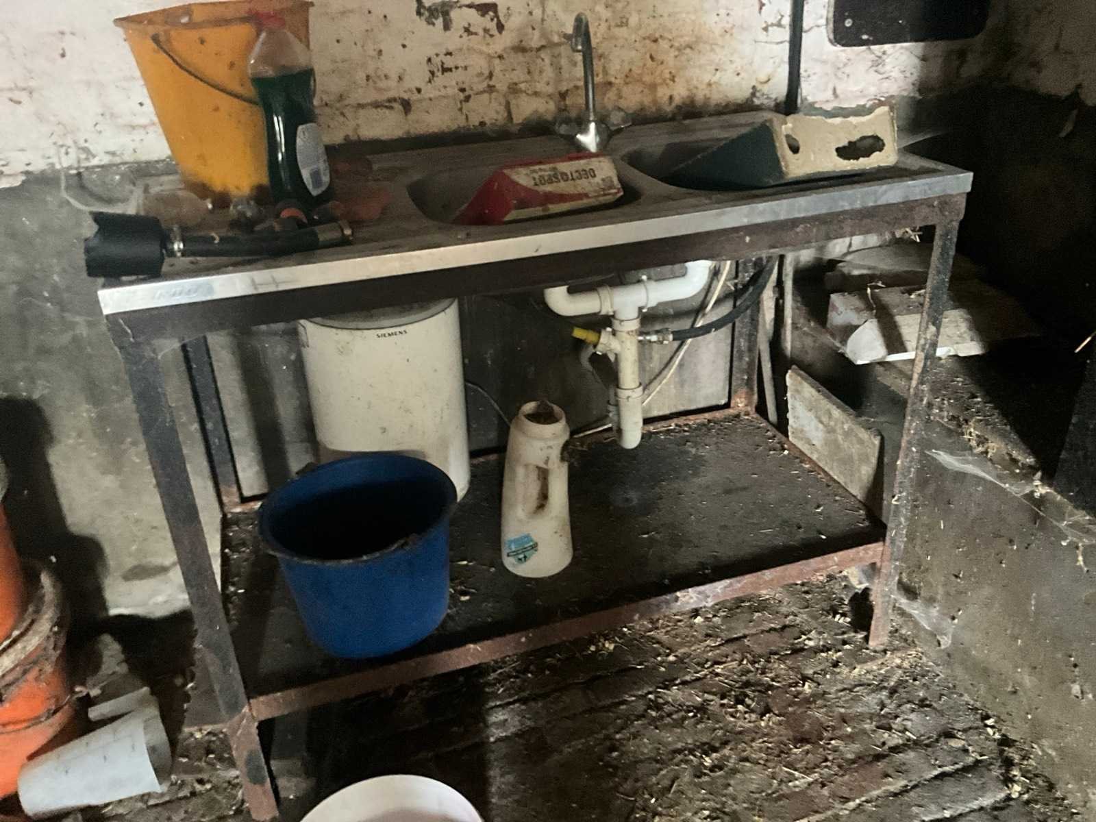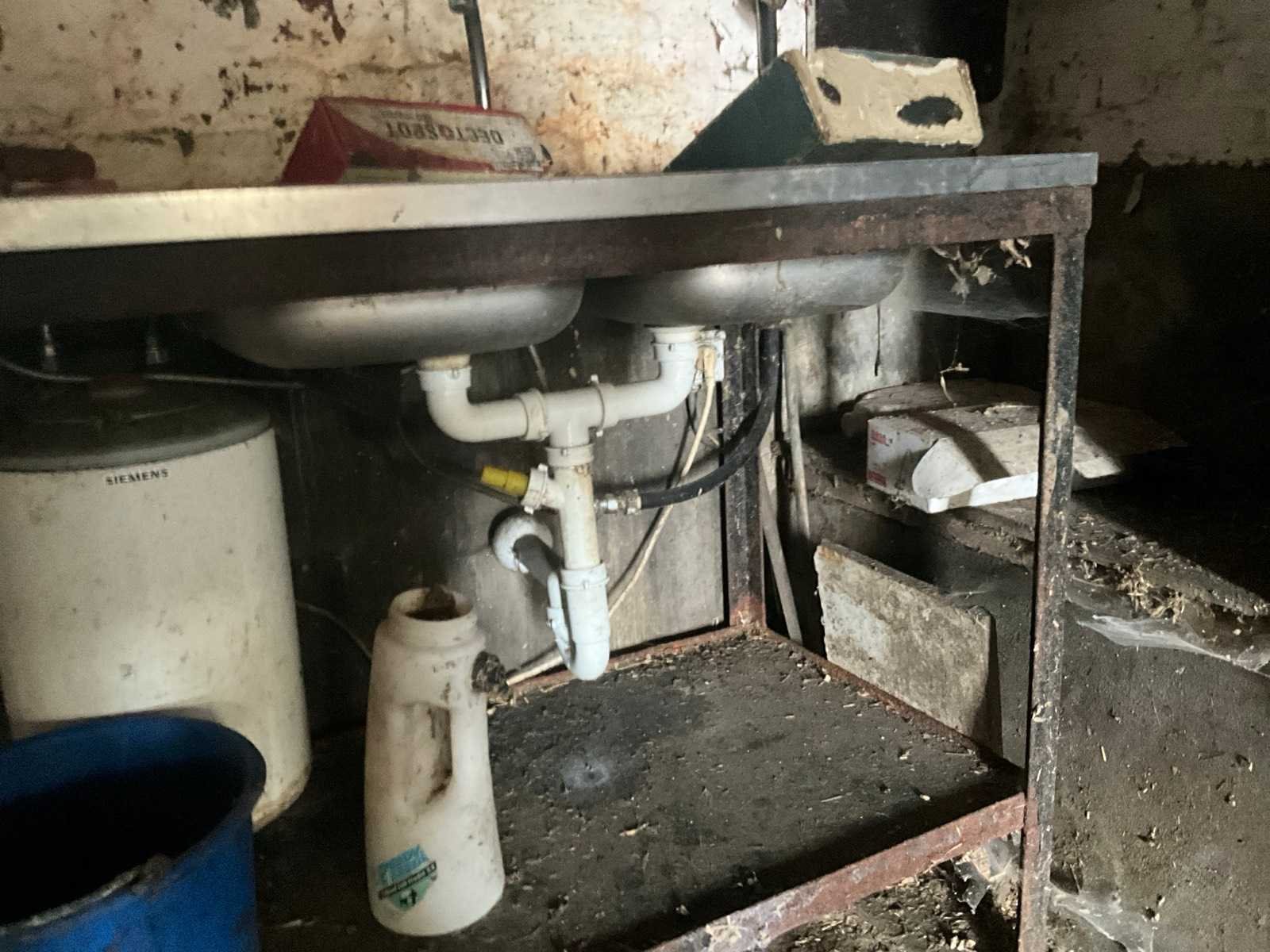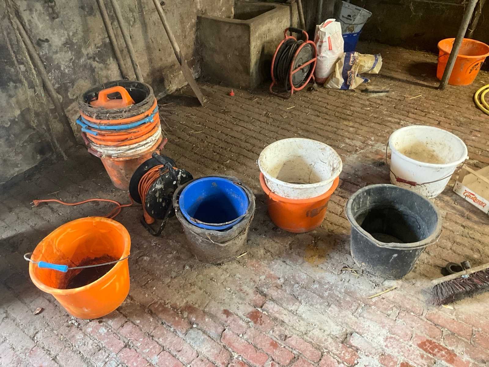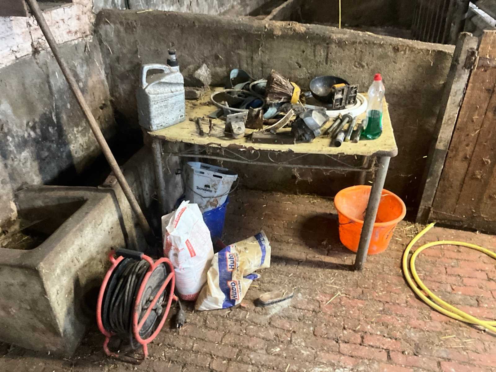 Inhoudende spoeltafel voorzien van kraan, diverse waterdarmen, diverse emmers en bakken, elektriciteitskabels, staaldraadlier, klauwbekapstoel, en diversen, mineraalvoeder, divers tuingereedschap, afgifte volgens aanwijzing