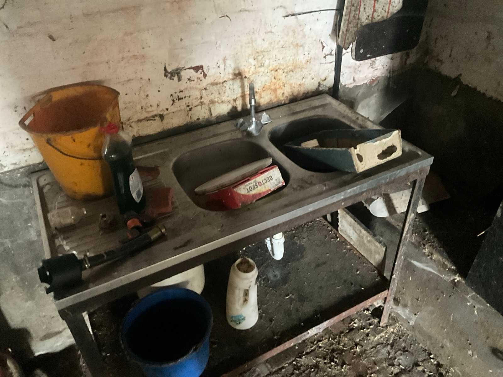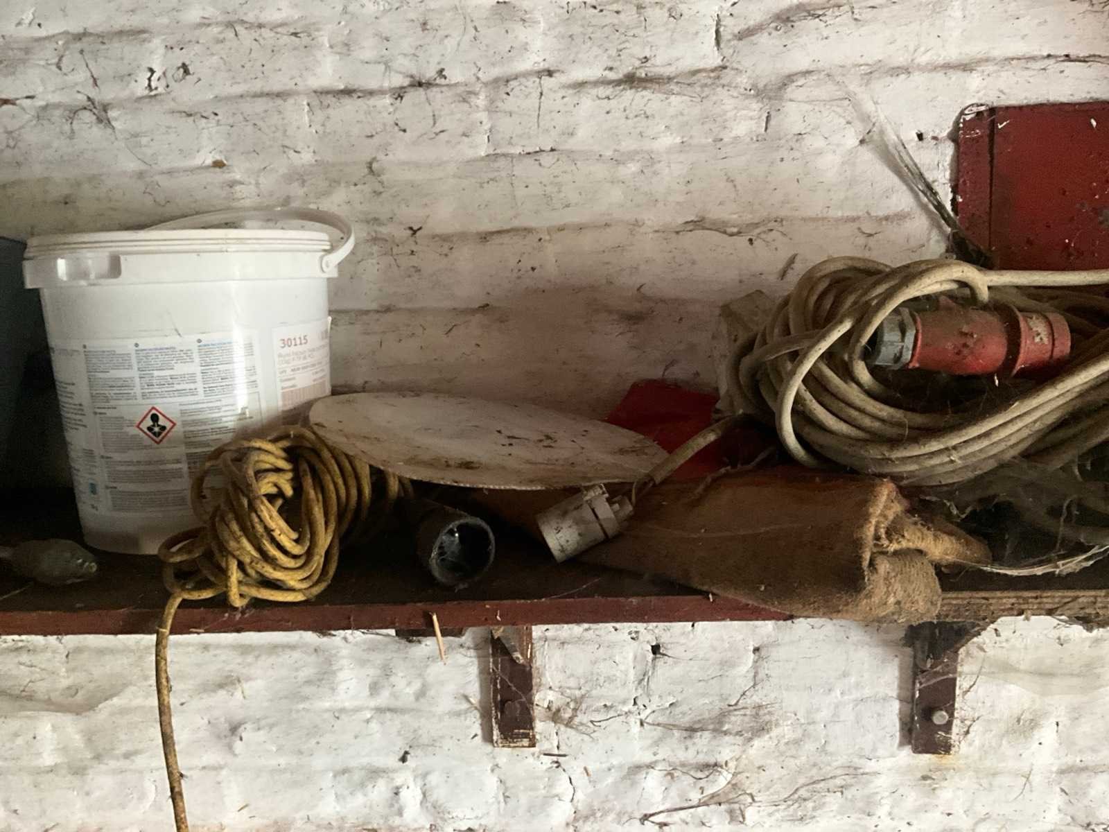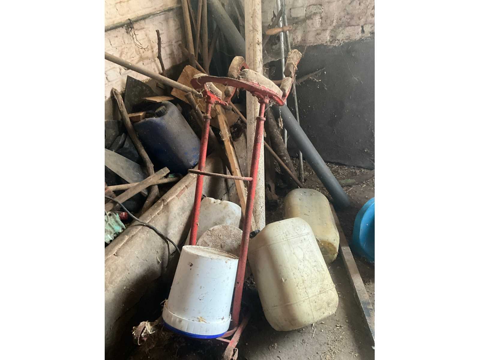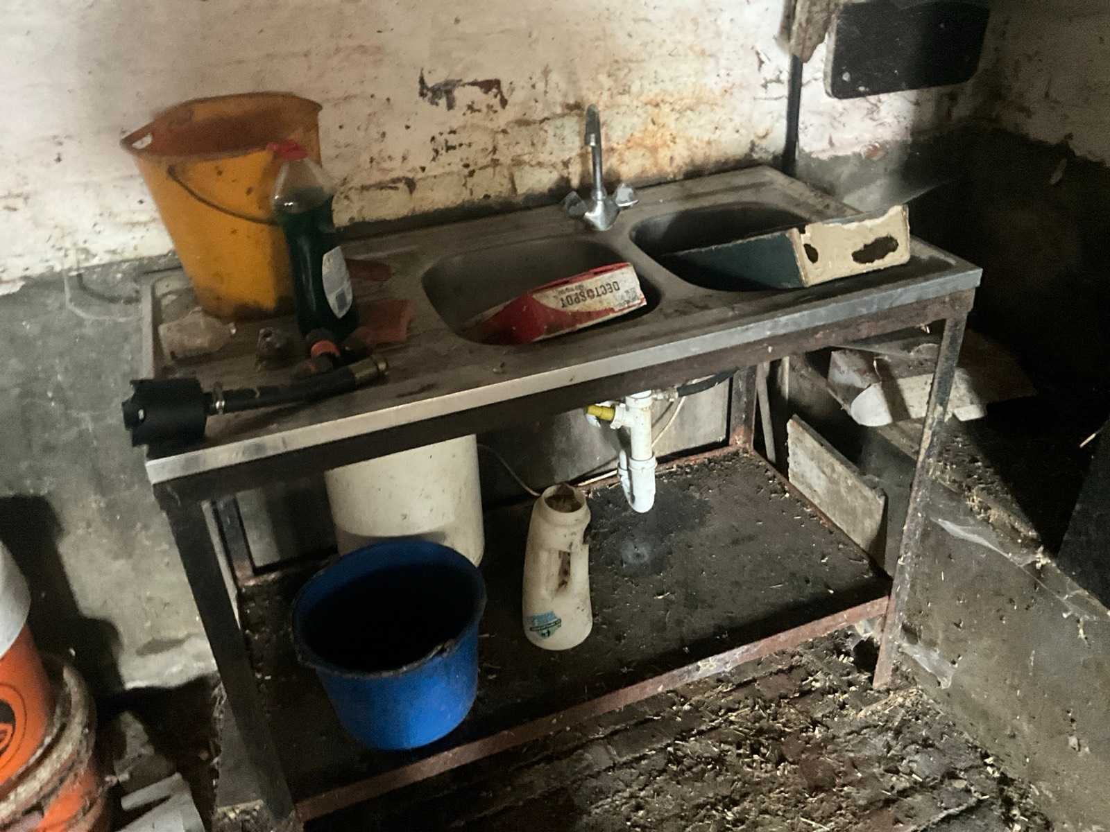 Inhoudende spoeltafel voorzien van kraan, diverse waterdarmen, diverse emmers en bakken, elektriciteitskabels, staaldraadlier, klauwbekapstoel, en diversen, mineraalvoeder, divers tuingereedschap, afgifte volgens aanwijzing