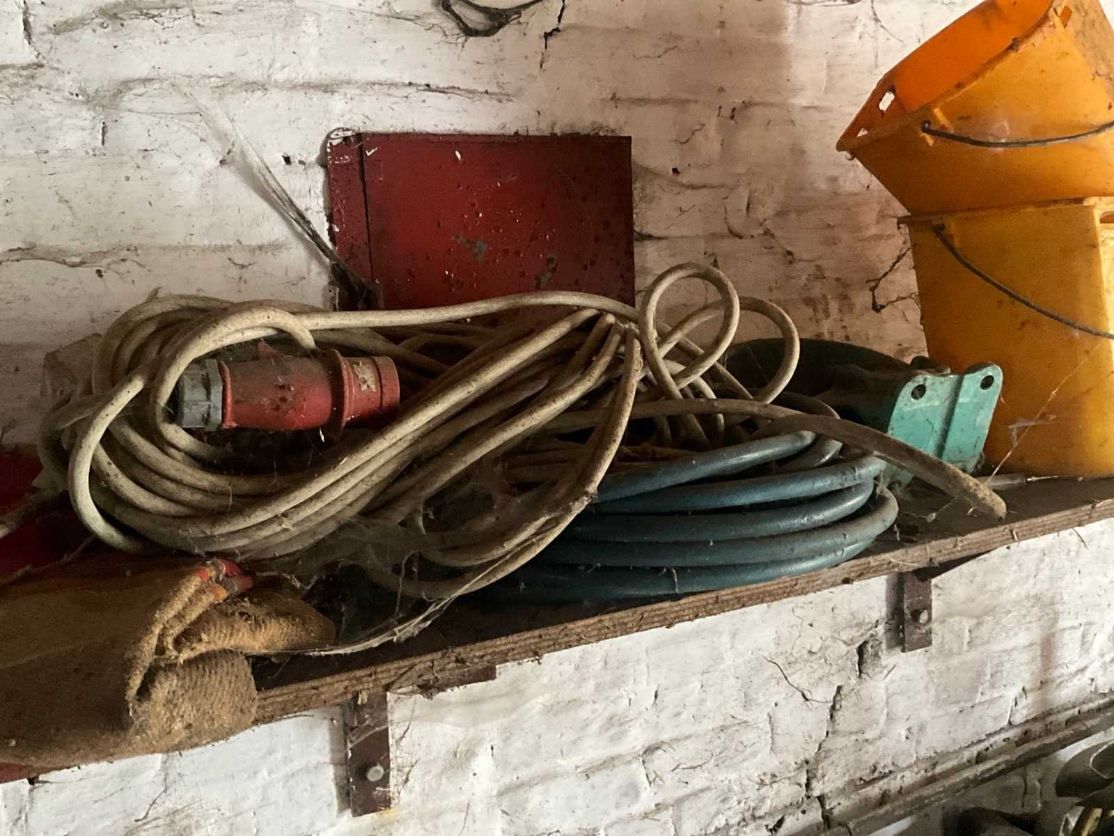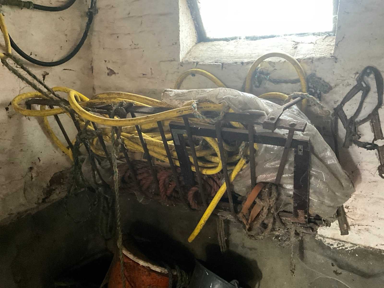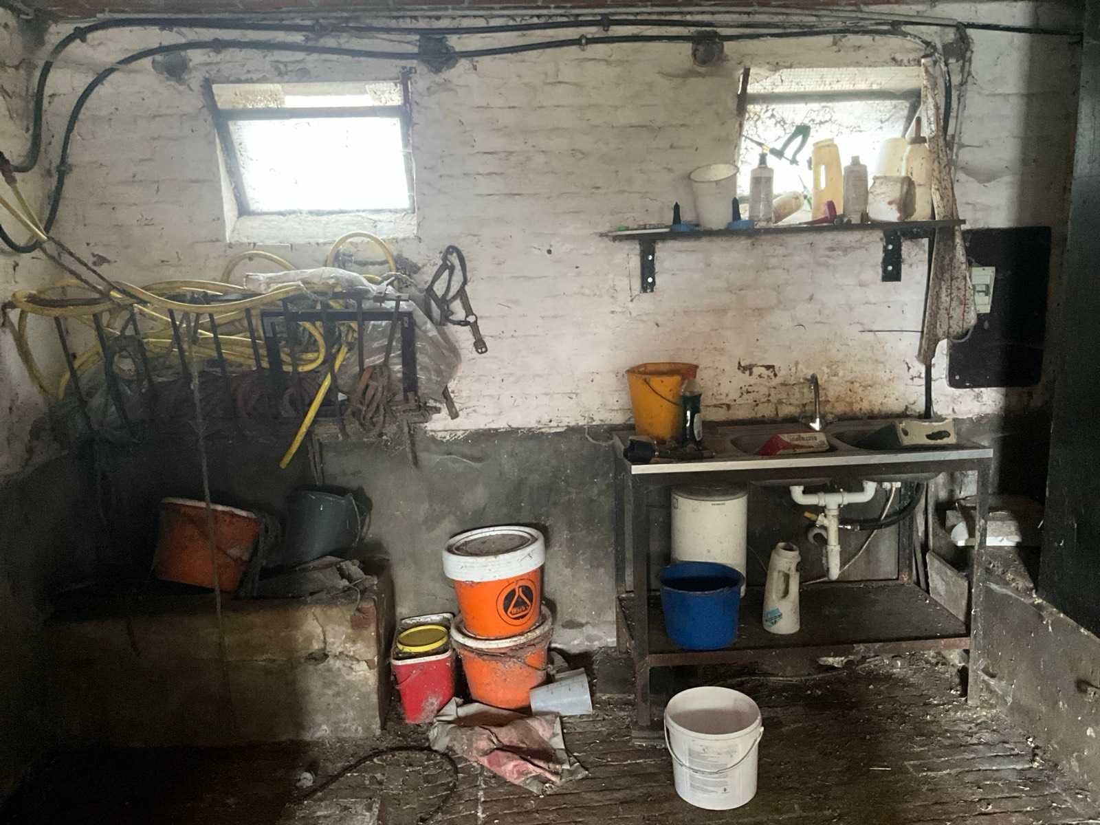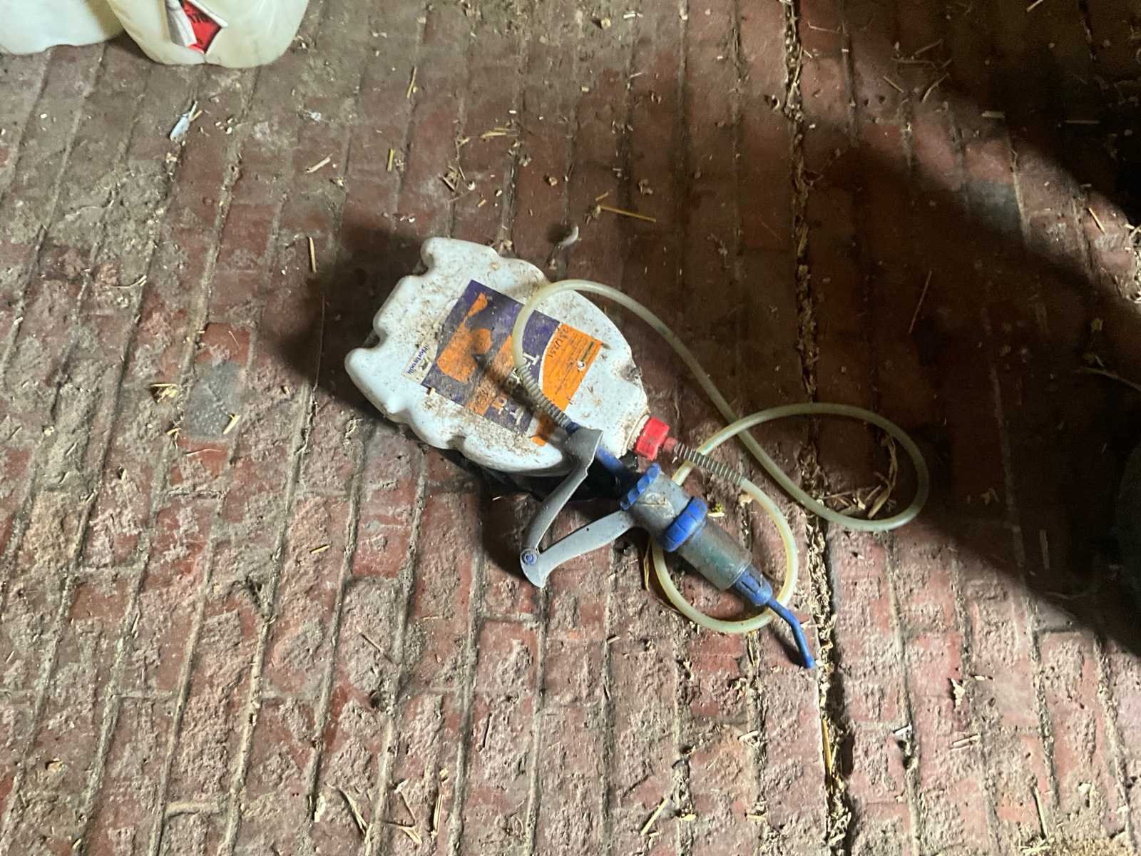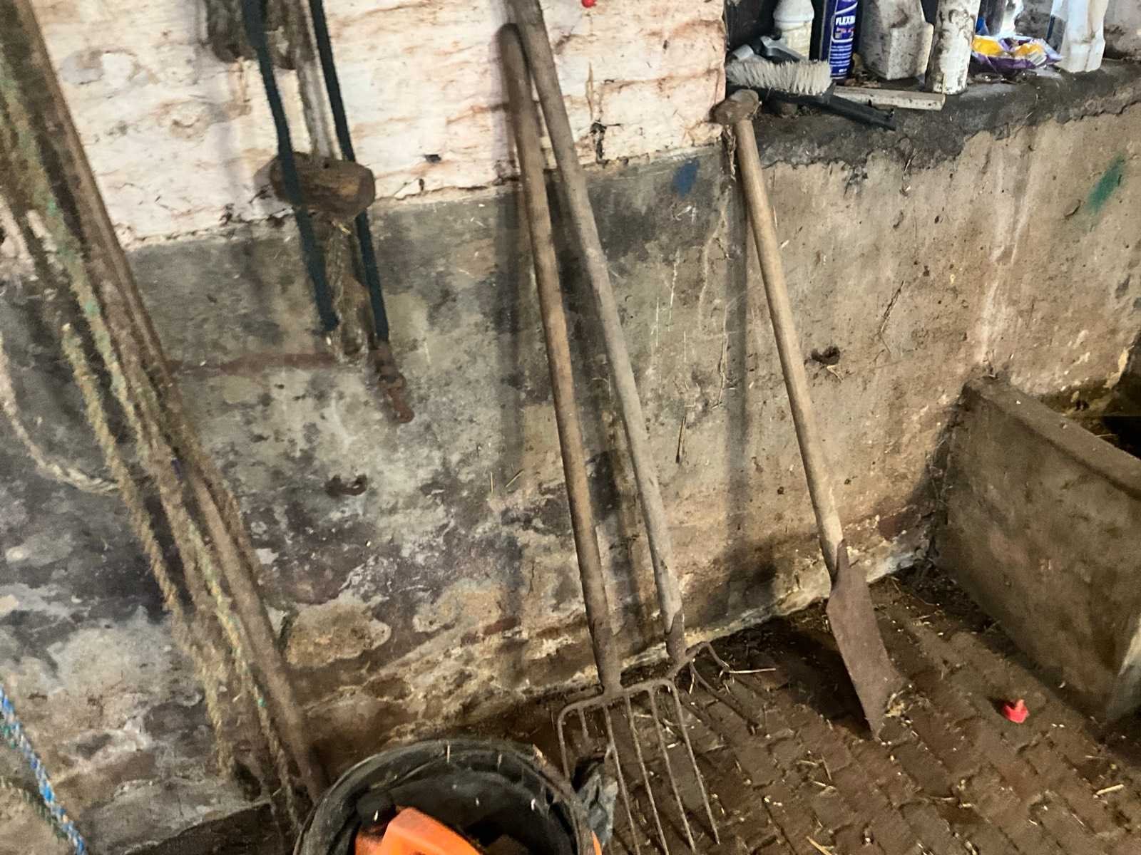 Inhoudende spoeltafel voorzien van kraan, diverse waterdarmen, diverse emmers en bakken, elektriciteitskabels, staaldraadlier, klauwbekapstoel, en diversen, mineraalvoeder, divers tuingereedschap, afgifte volgens aanwijzing