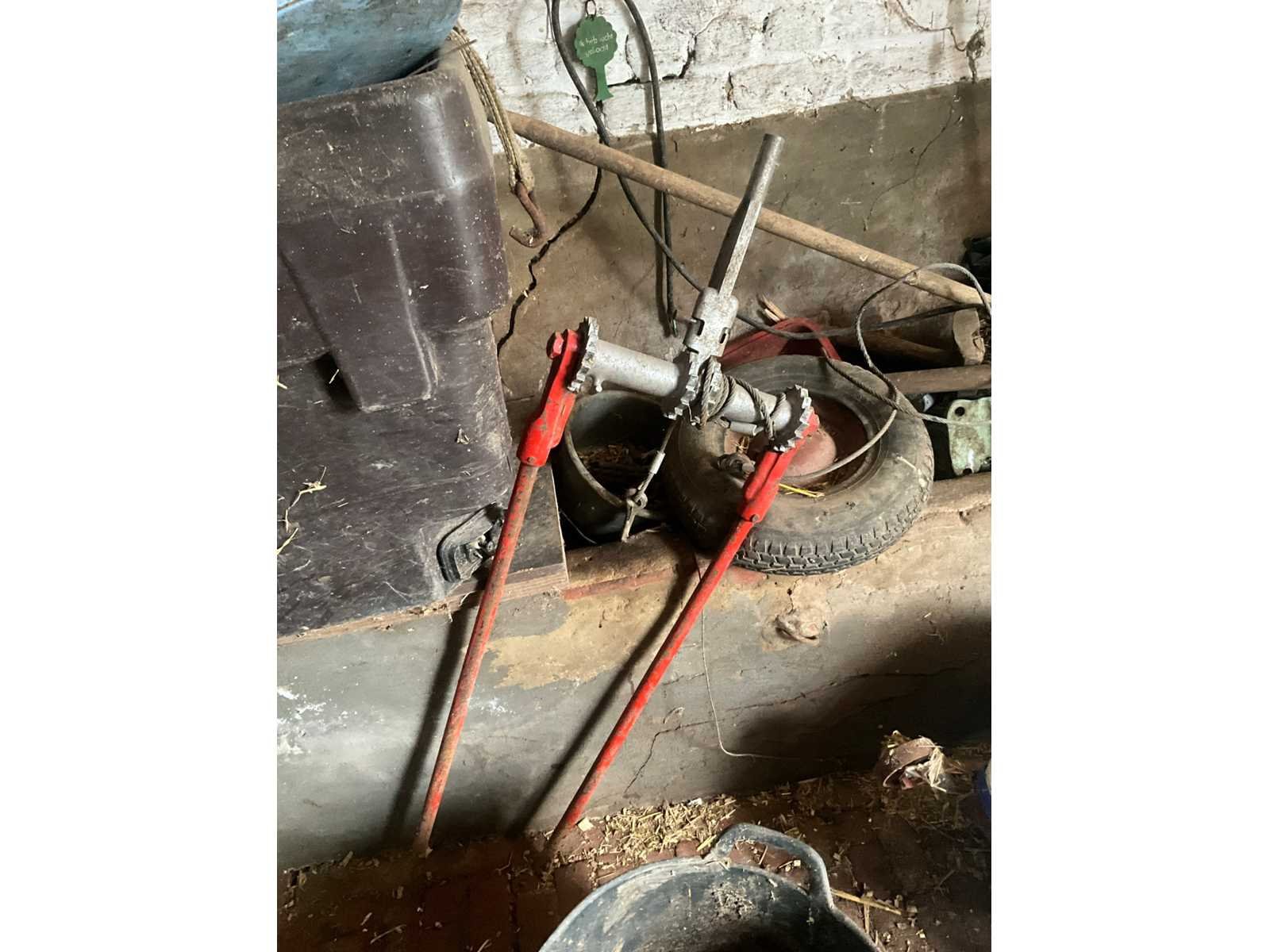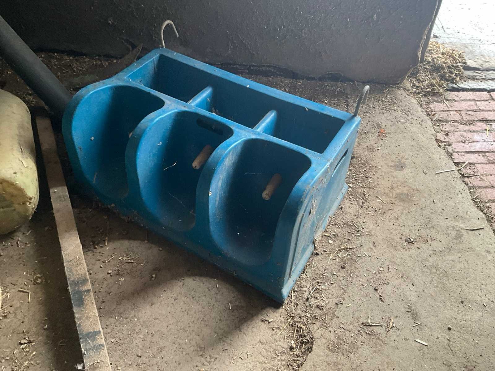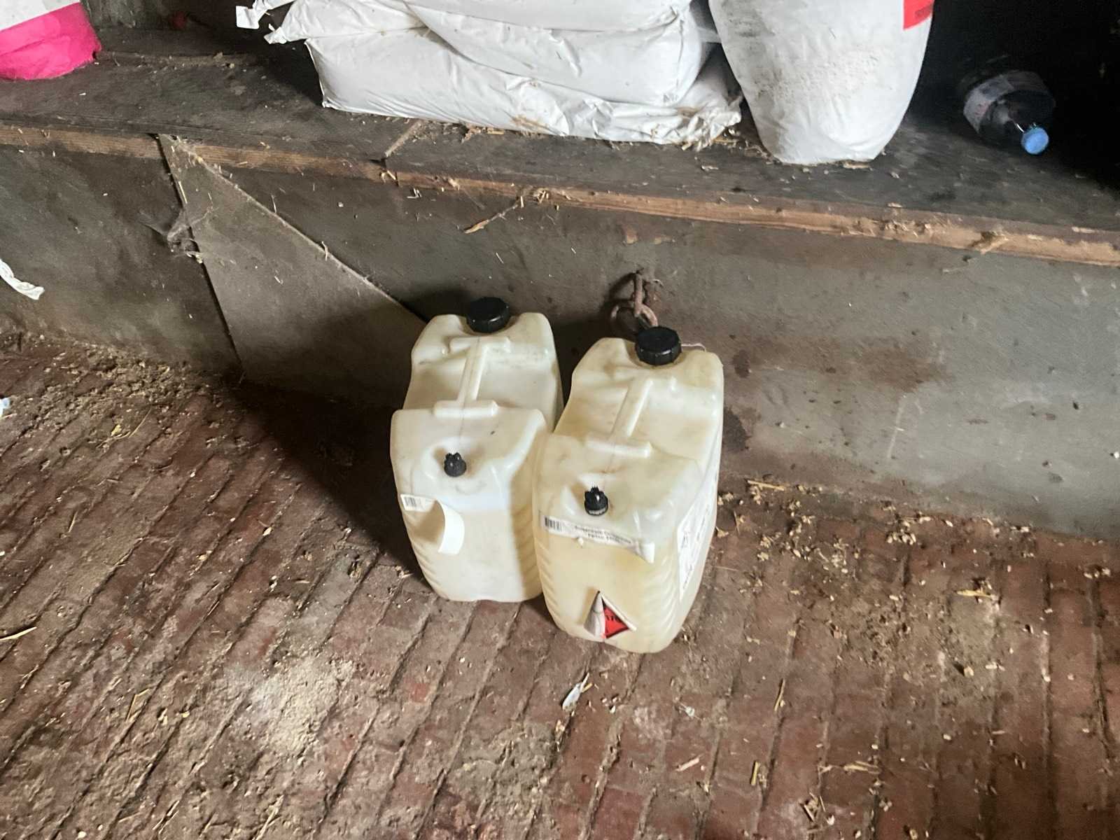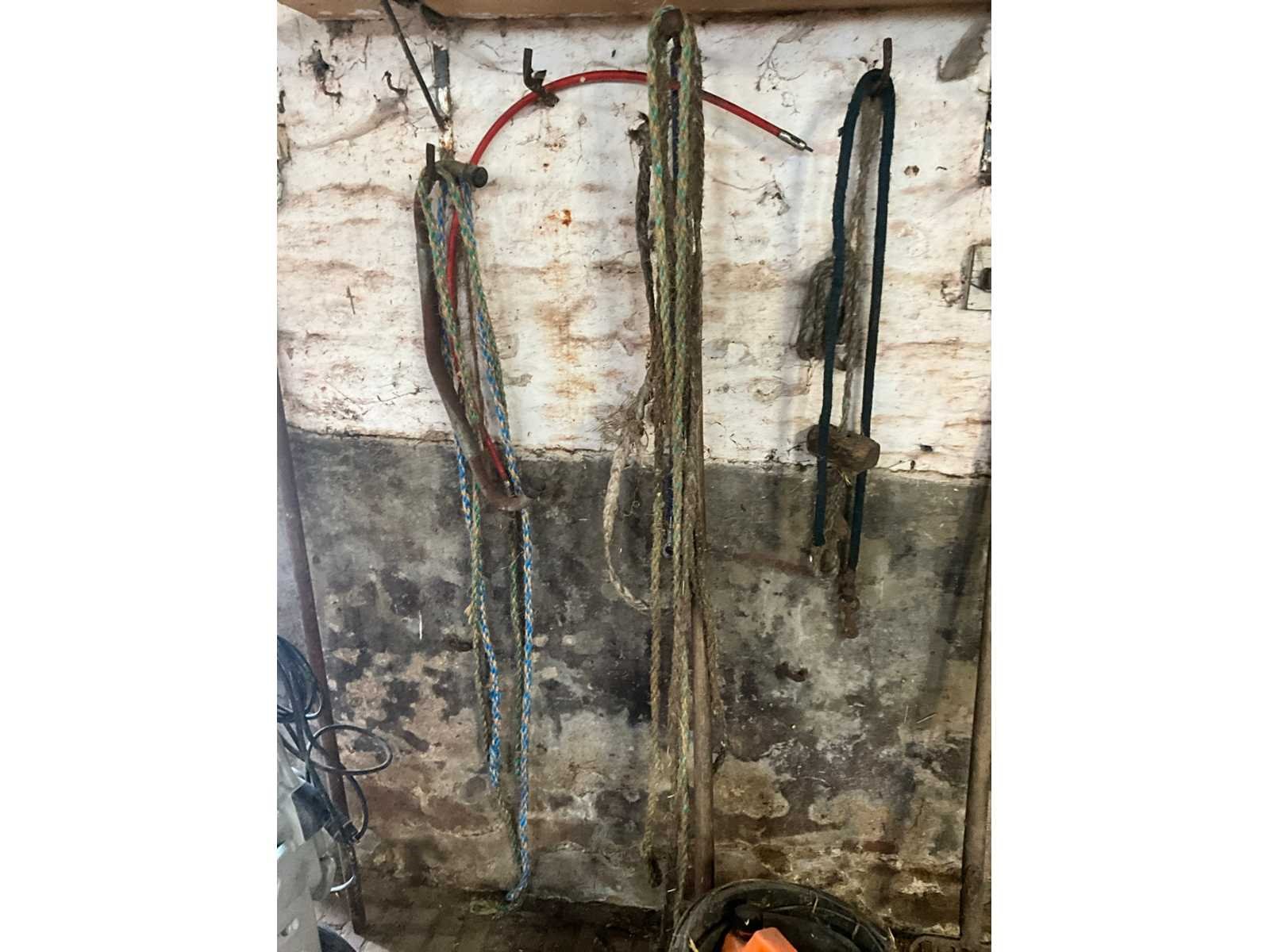 Inhoudende spoeltafel voorzien van kraan, diverse waterdarmen, diverse emmers en bakken, elektriciteitskabels, staaldraadlier, klauwbekapstoel, en diversen, mineraalvoeder, divers tuingereedschap, afgifte volgens aanwijzing