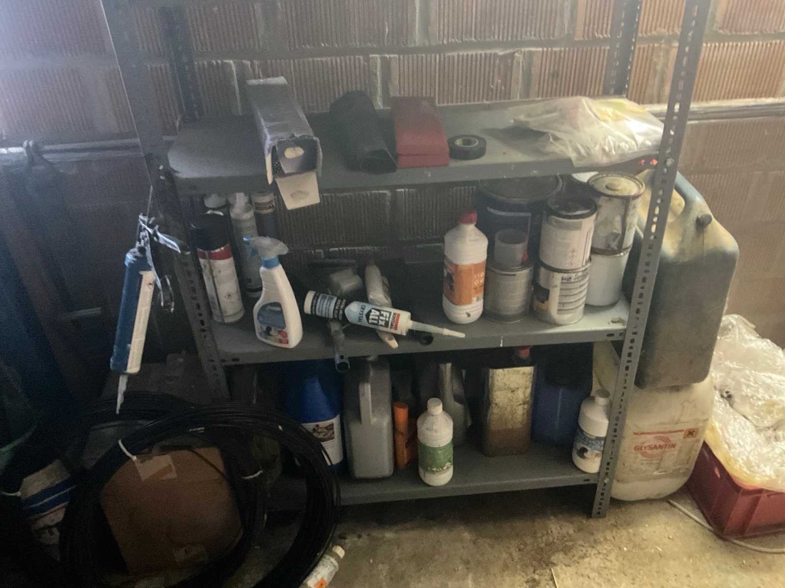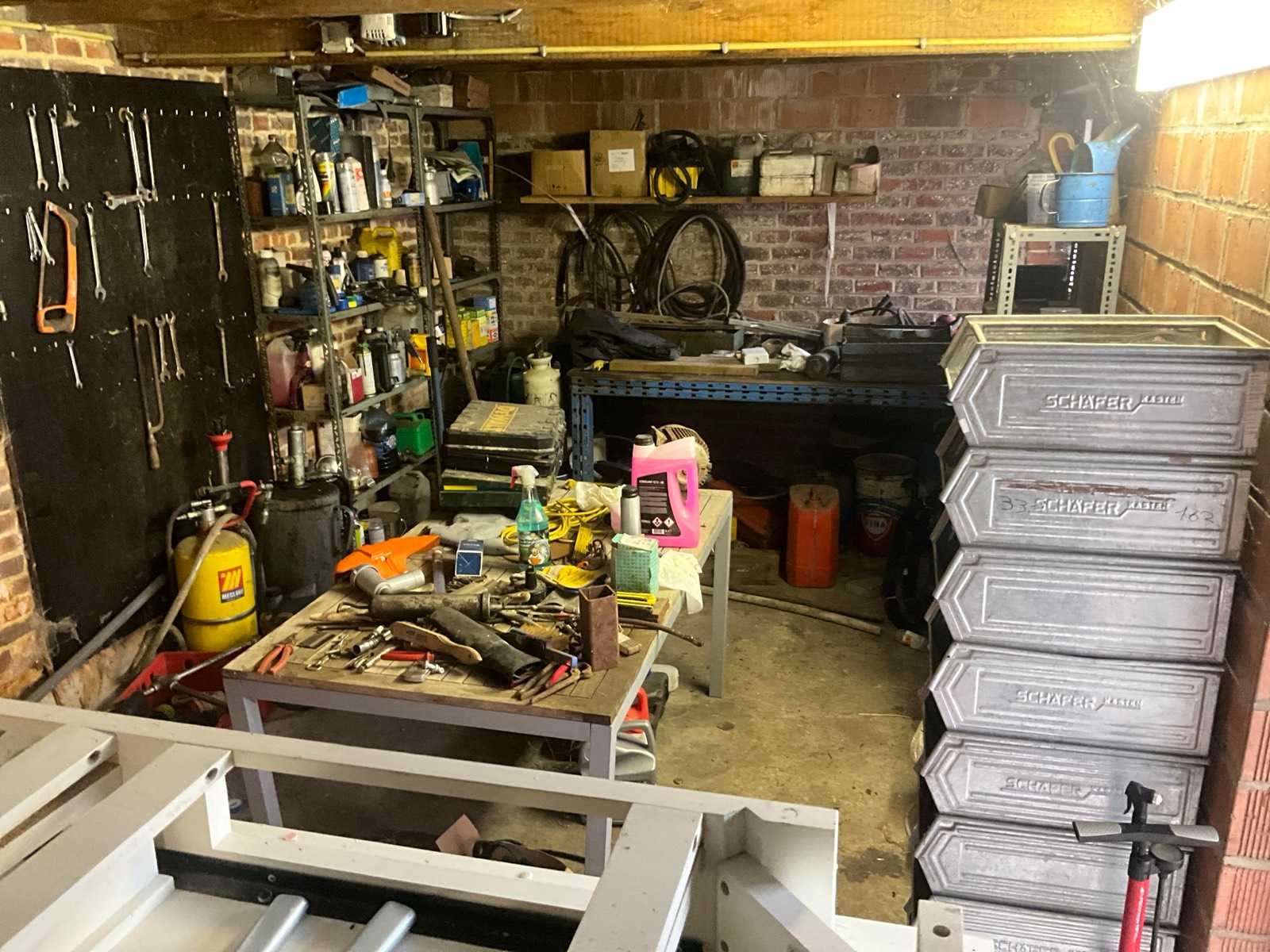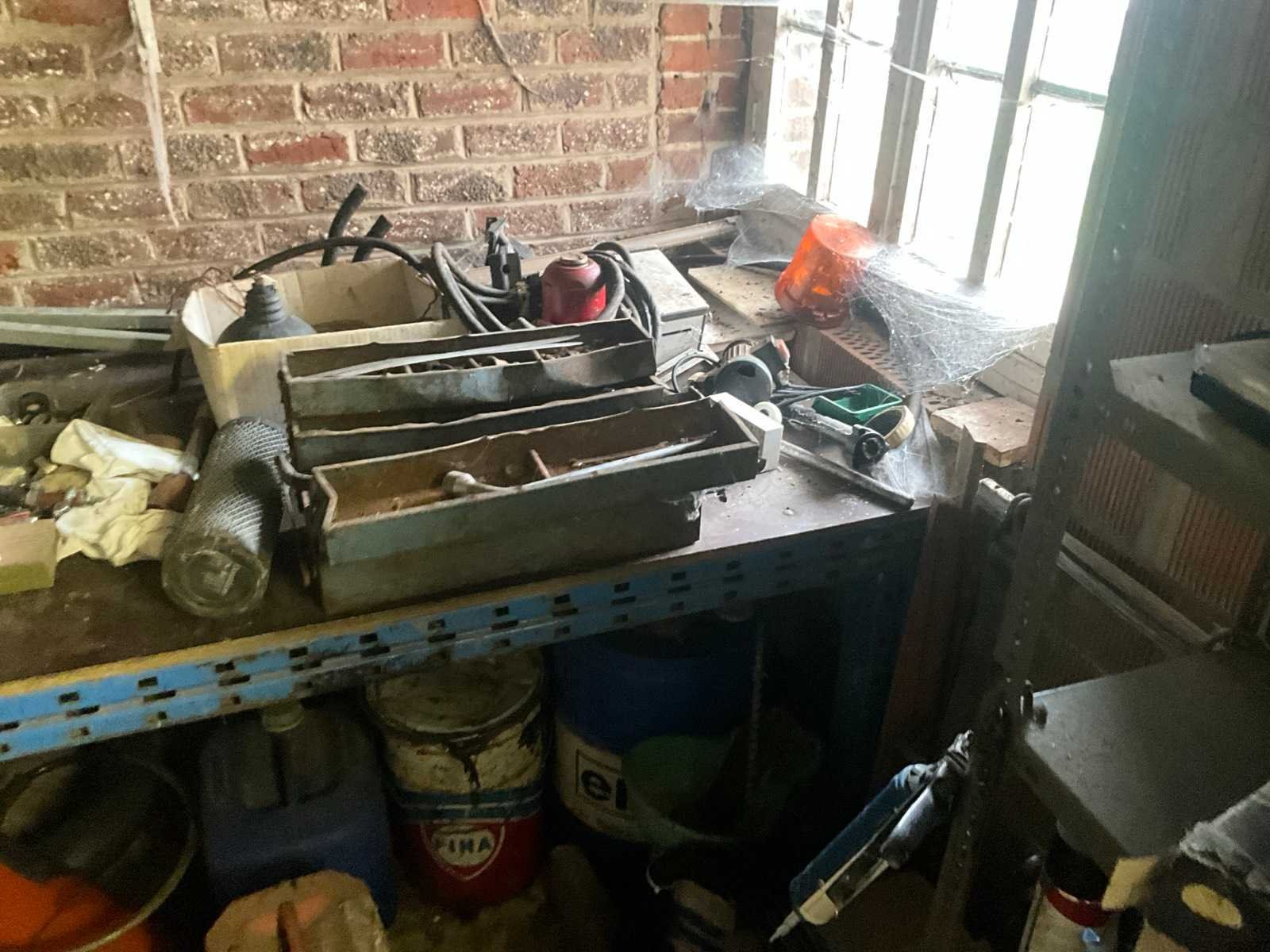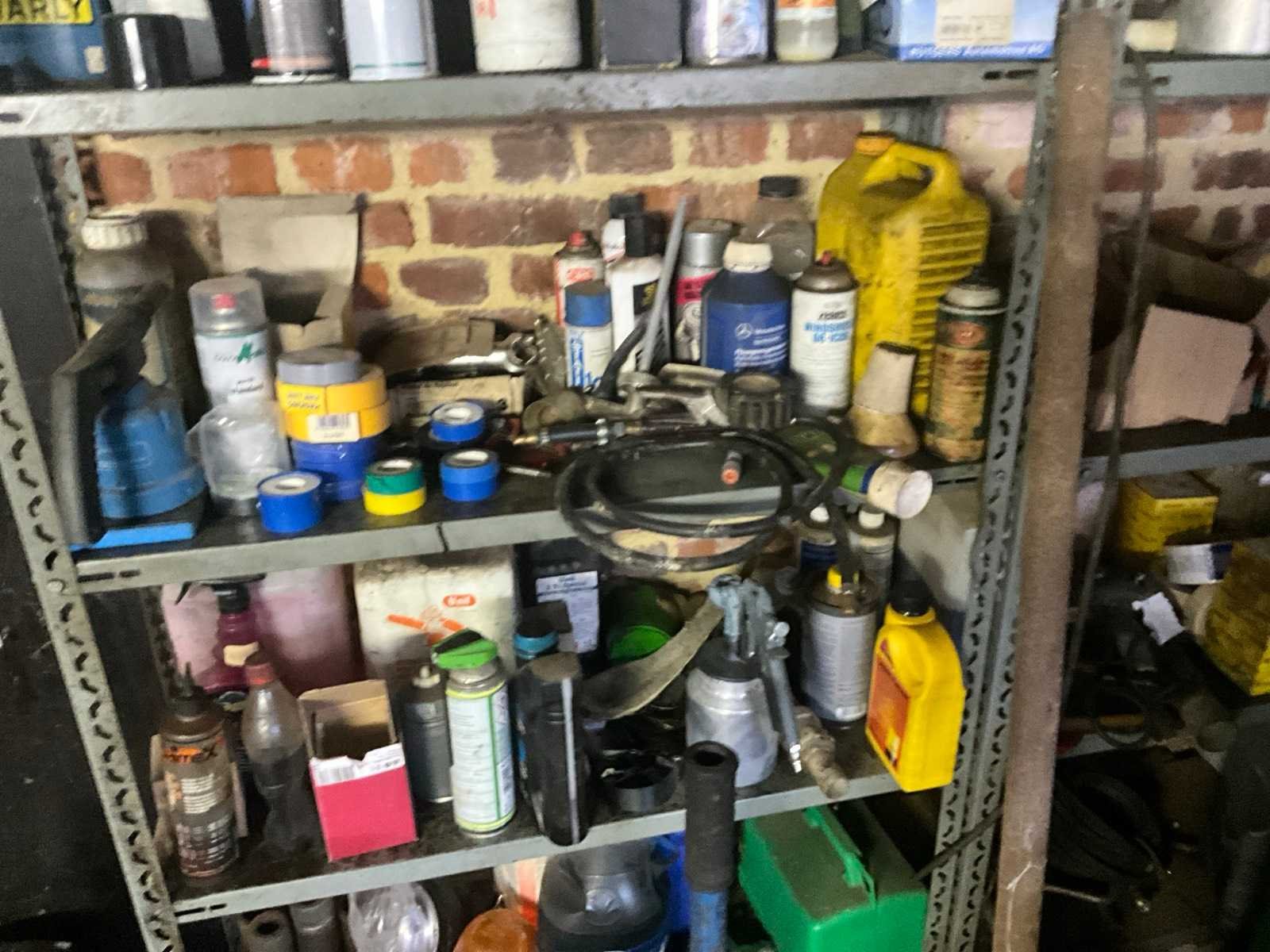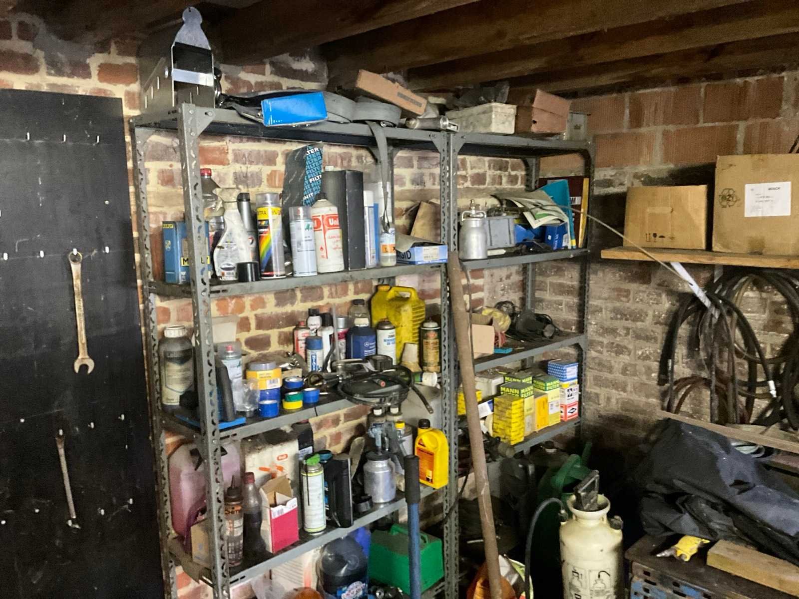 Inhoudende divers werkmateriaal waaronder divers handgereedschap, diverse opbergbakken waaronder in pvc en metaal, metalen opbergrekken, werktafel, diverse sprays, spuitpompen, jerrycans, werktafel, diverse riemen,…