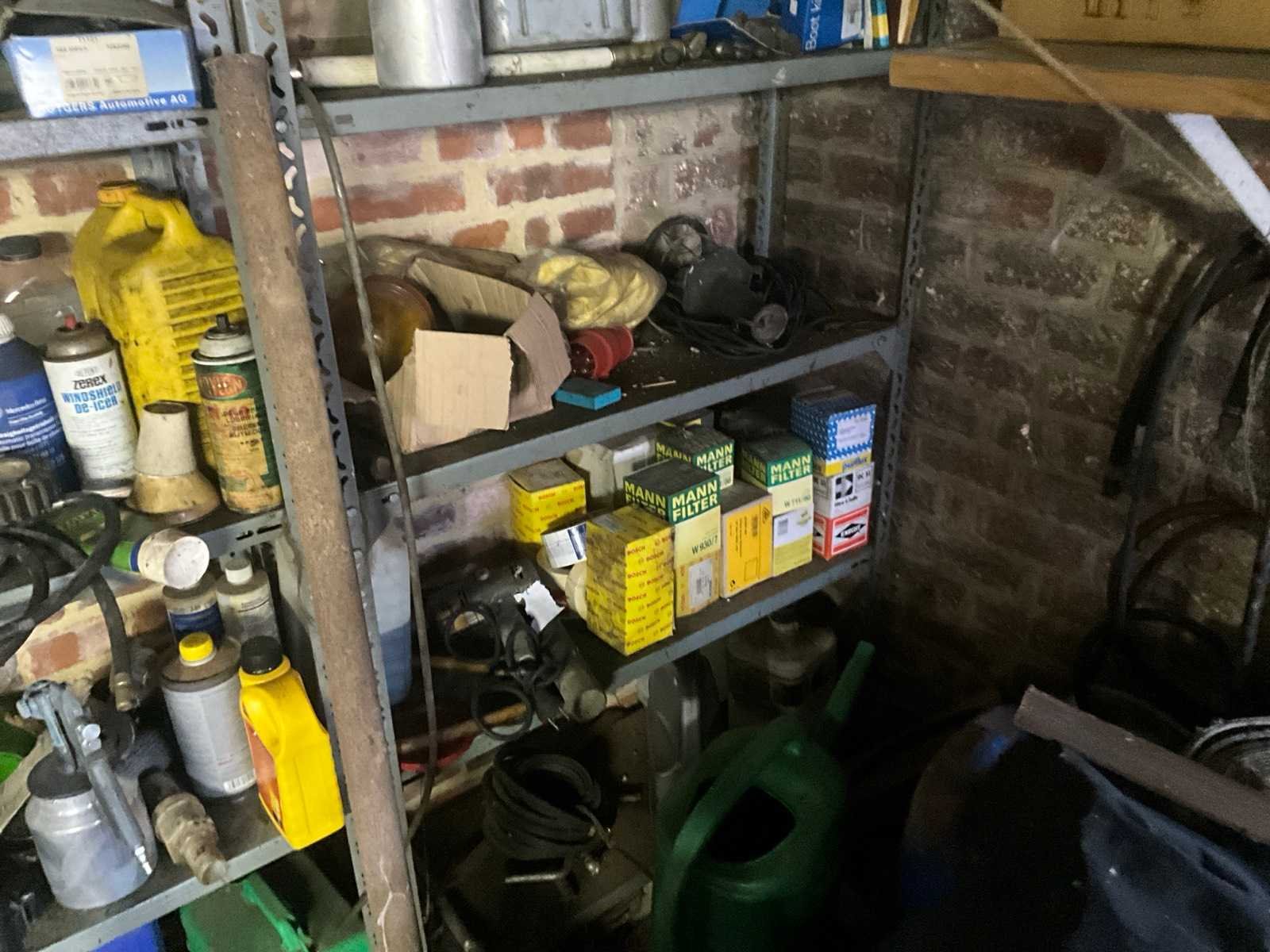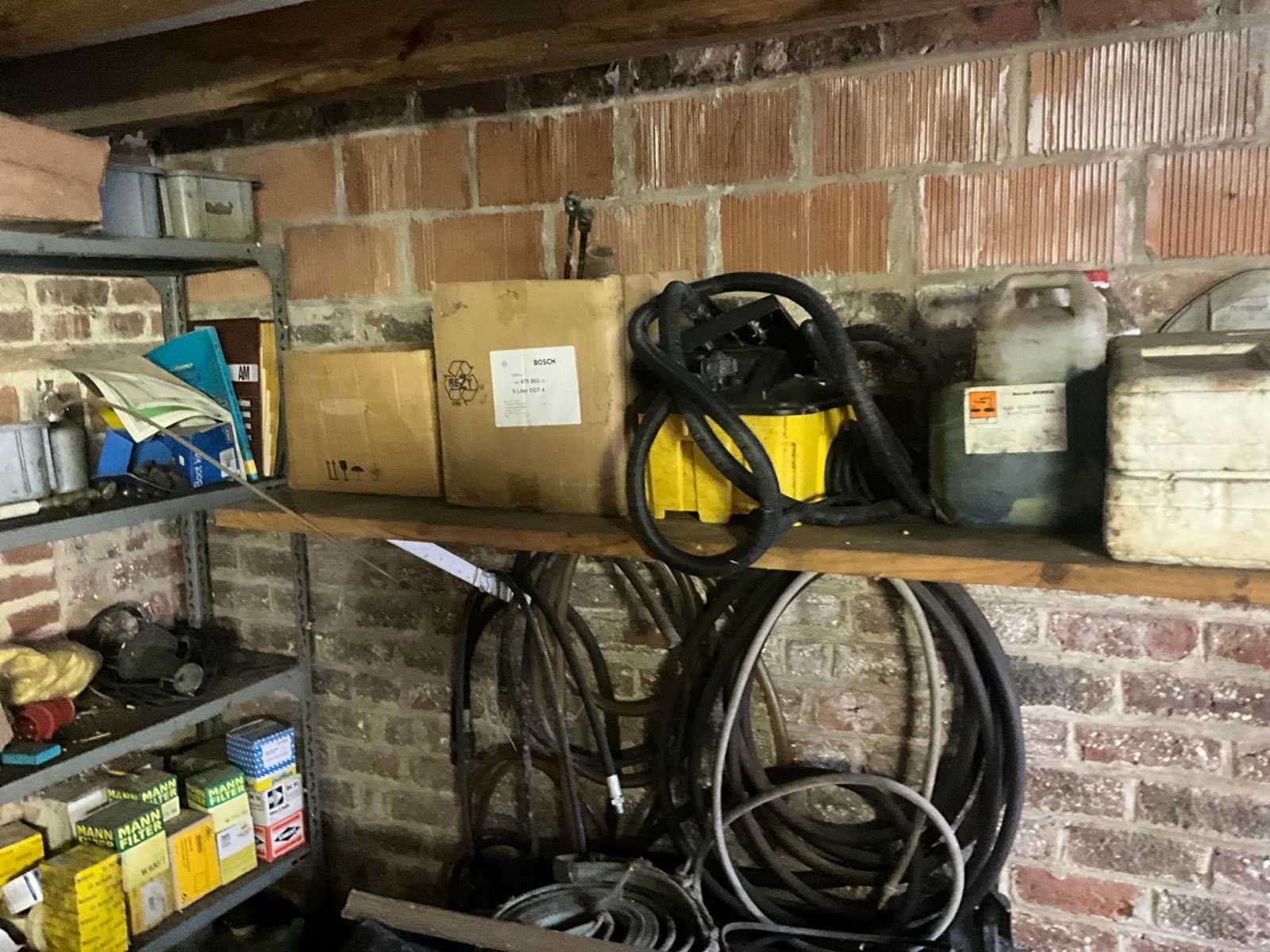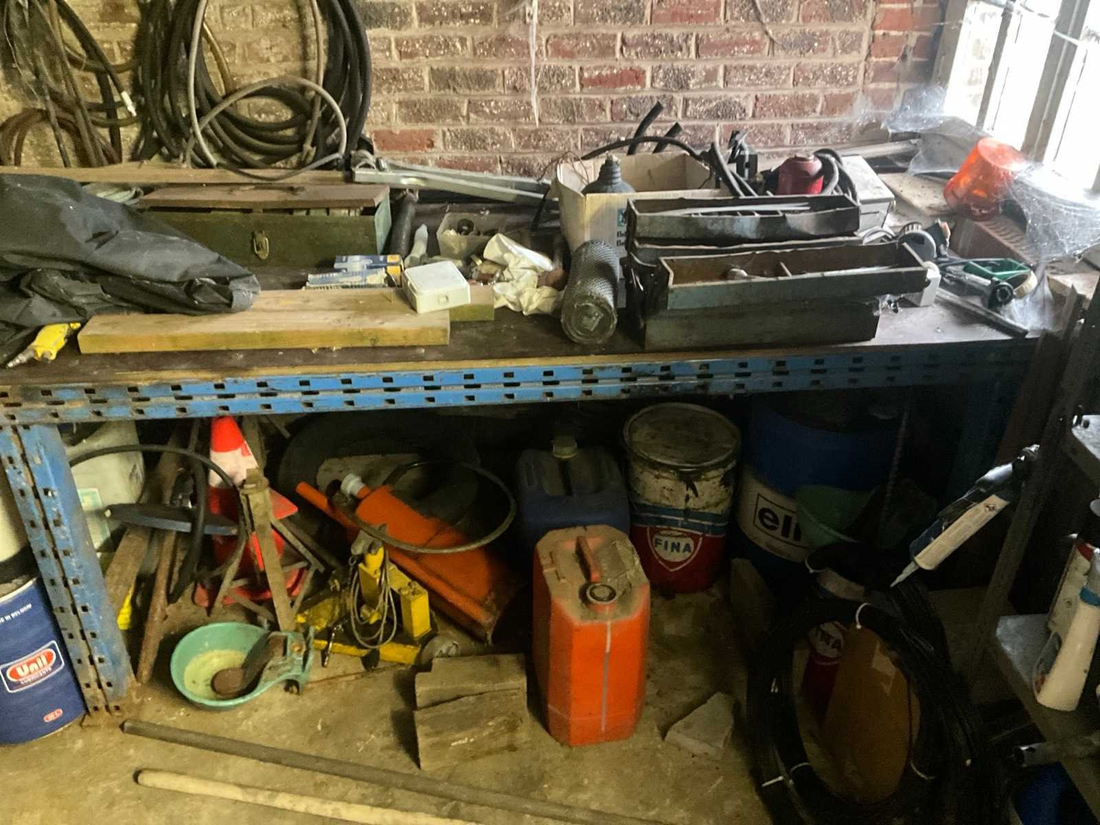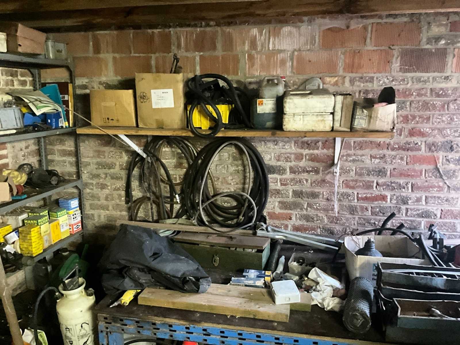 Inhoudende divers werkmateriaal waaronder divers handgereedschap, diverse opbergbakken waaronder in pvc en metaal, metalen opbergrekken, werktafel, diverse sprays, spuitpompen, jerrycans, werktafel, diverse riemen,…