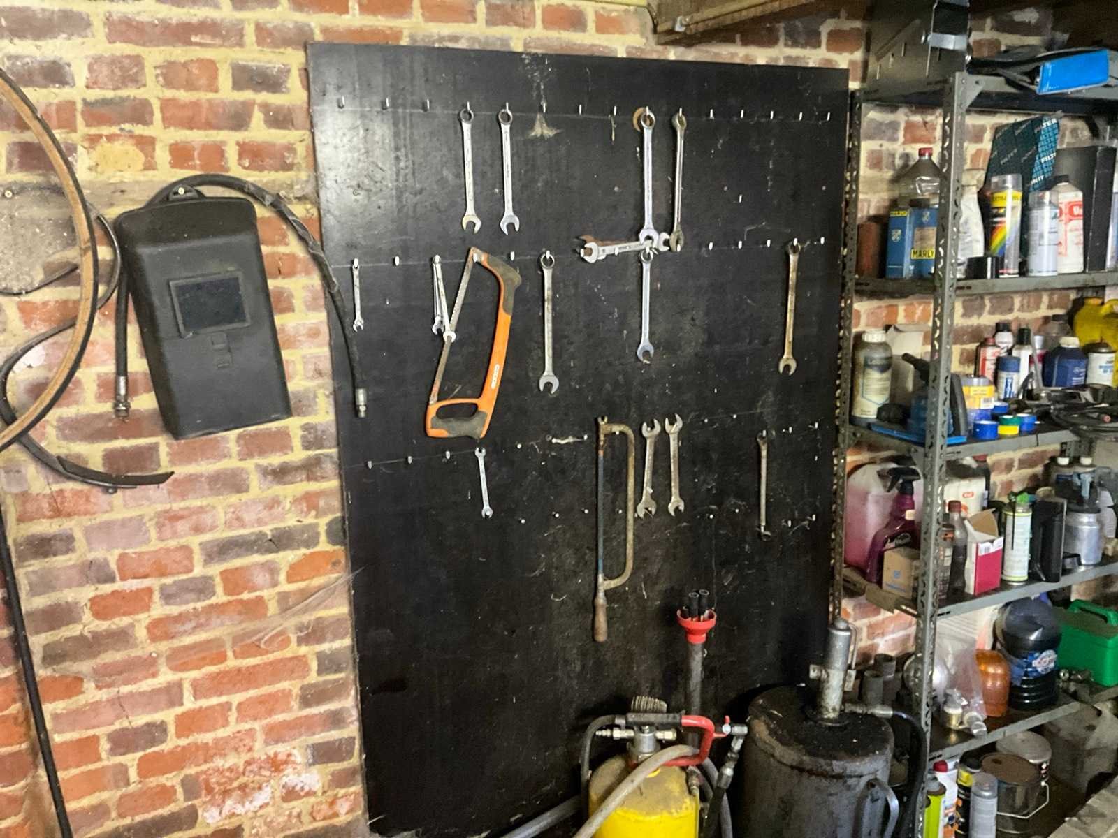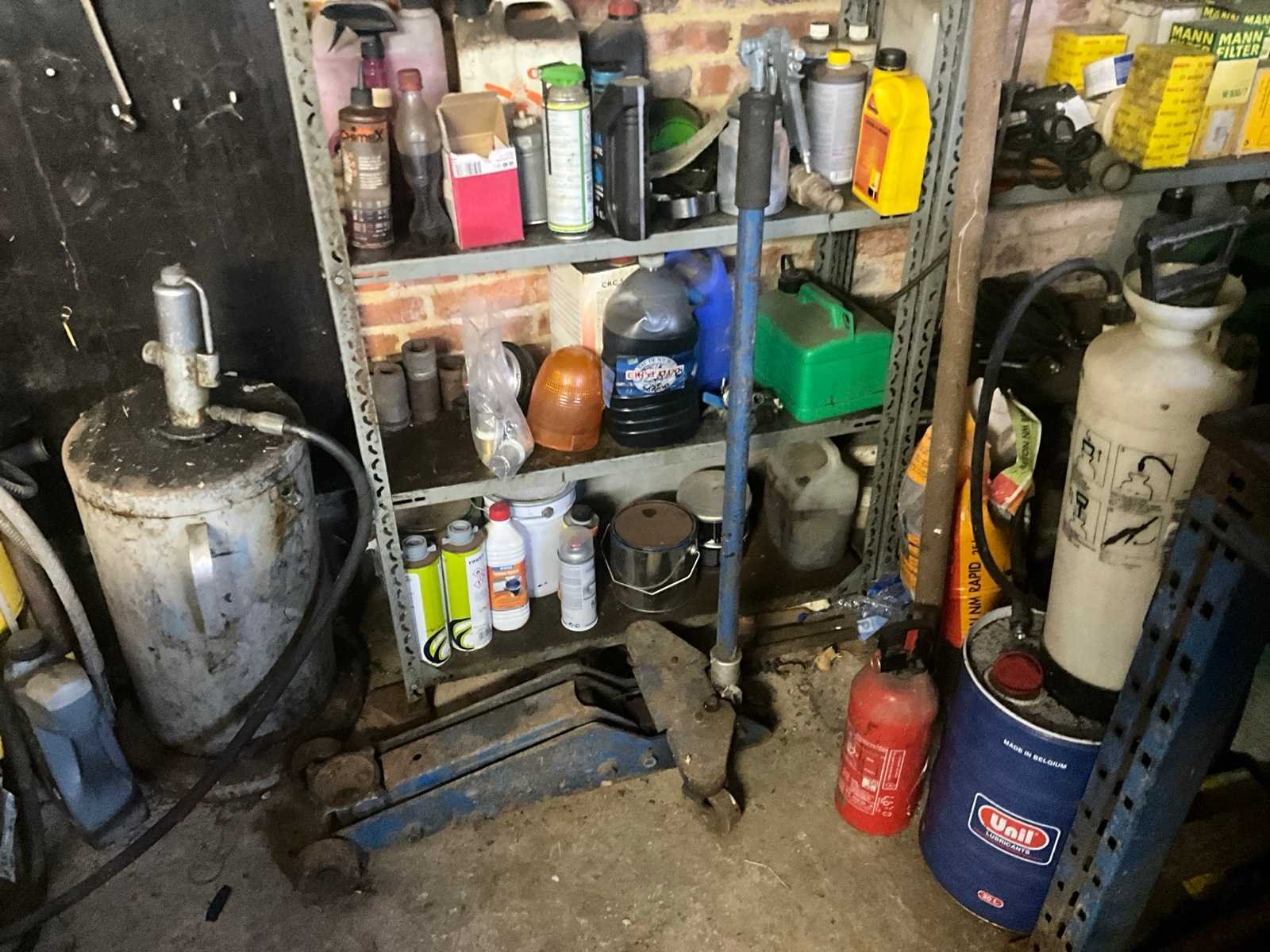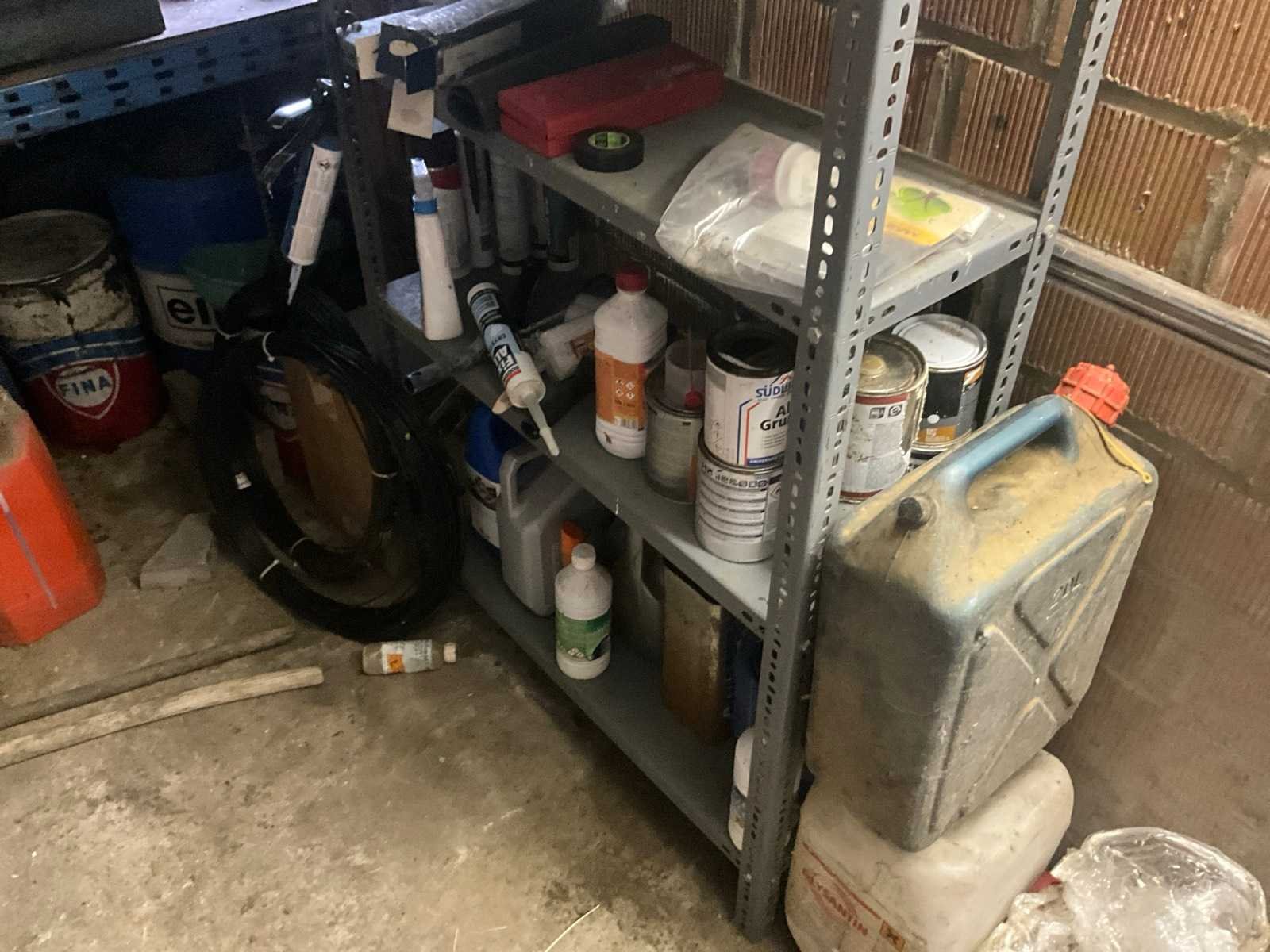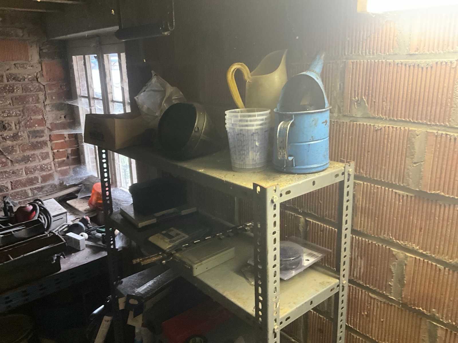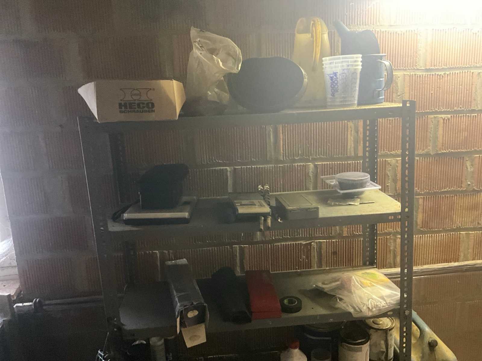 Inhoudende divers werkmateriaal waaronder divers handgereedschap, diverse opbergbakken waaronder in pvc en metaal, metalen opbergrekken, werktafel, diverse sprays, spuitpompen, jerrycans, werktafel, diverse riemen,…