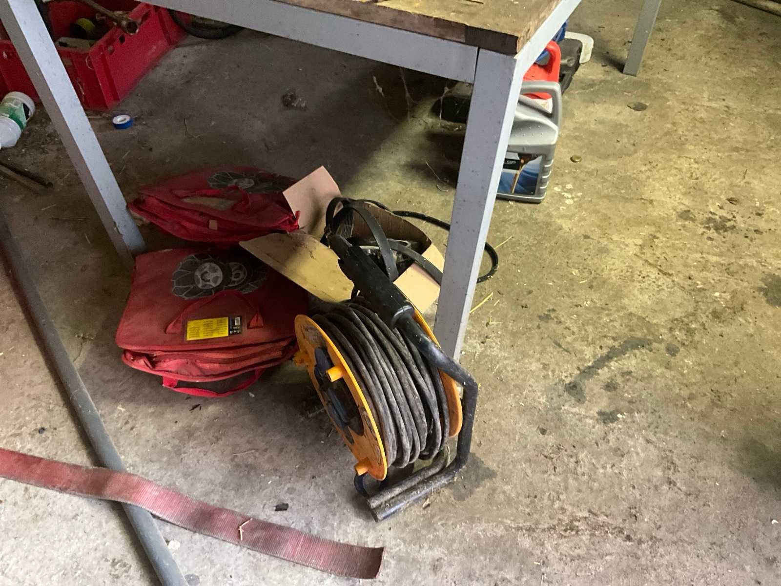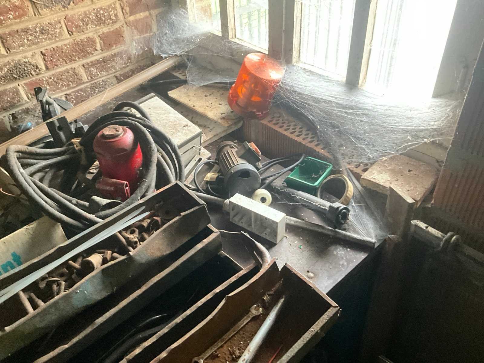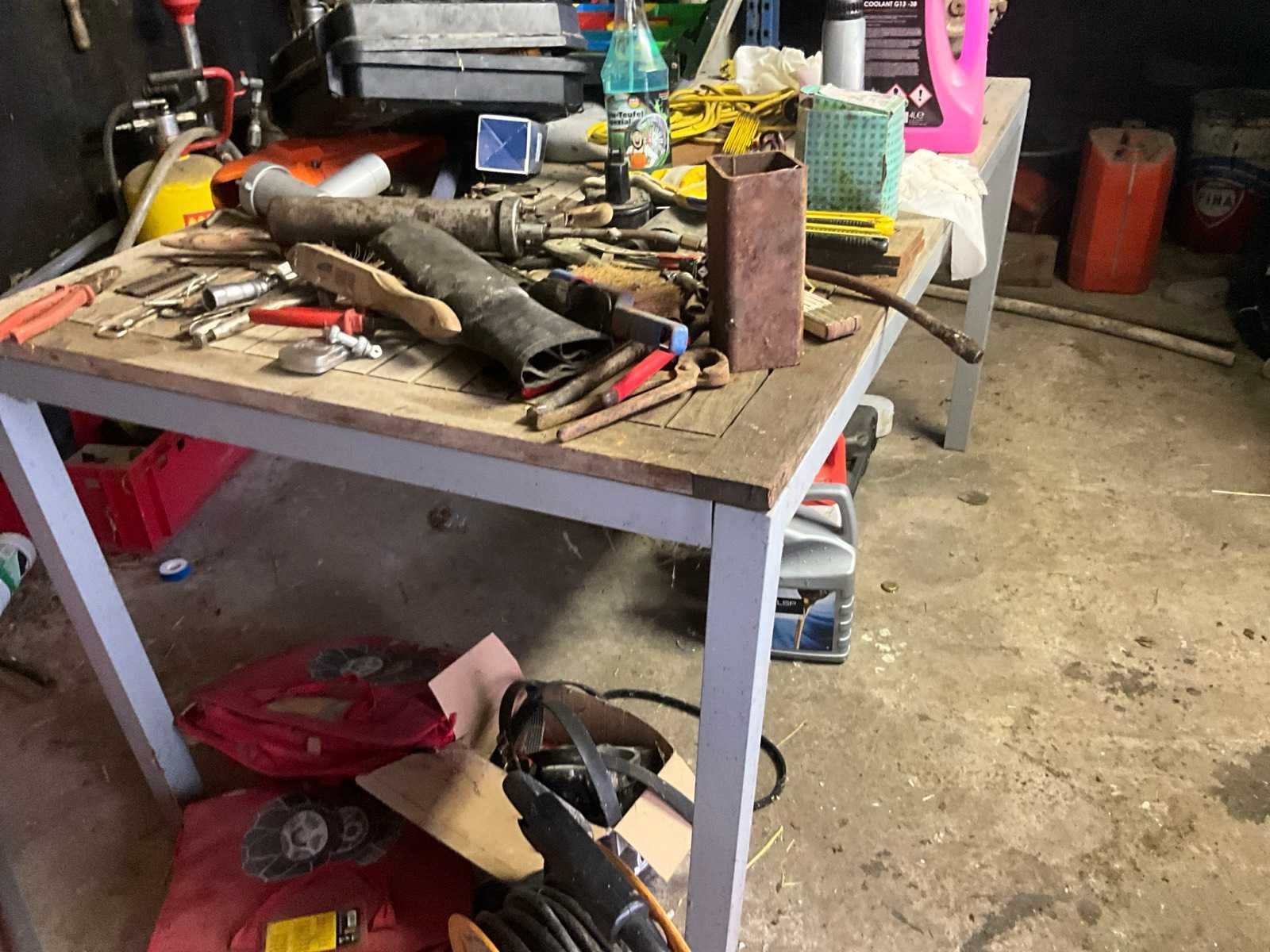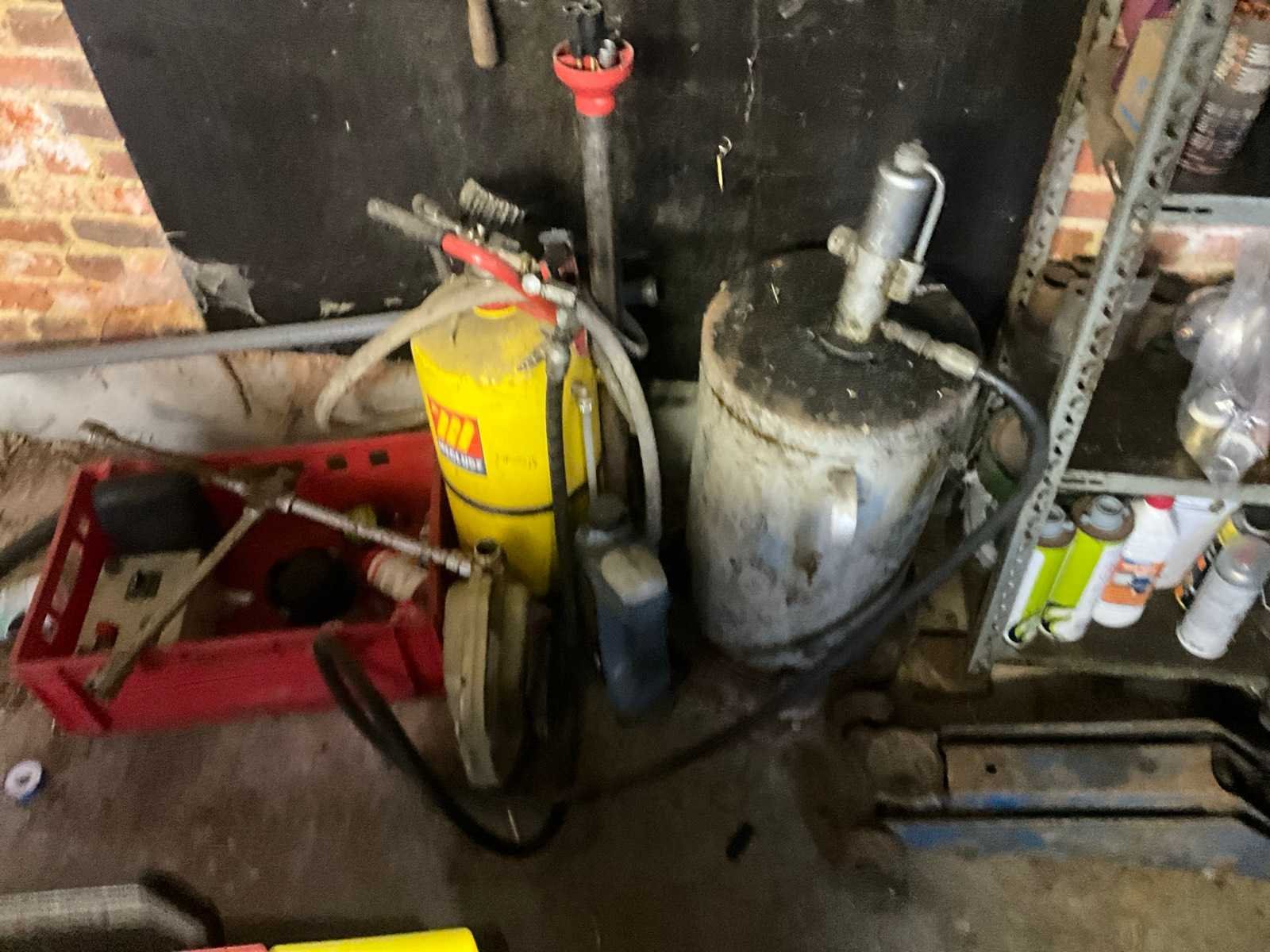 Inhoudende divers werkmateriaal waaronder divers handgereedschap, diverse opbergbakken waaronder in pvc en metaal, metalen opbergrekken, werktafel, diverse sprays, spuitpompen, jerrycans, werktafel, diverse riemen,…