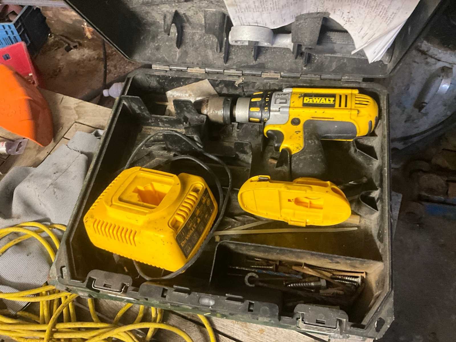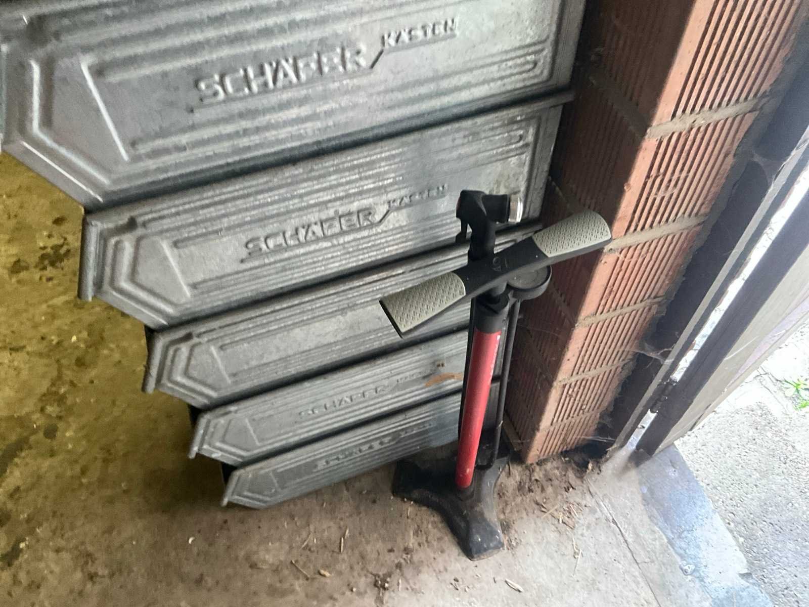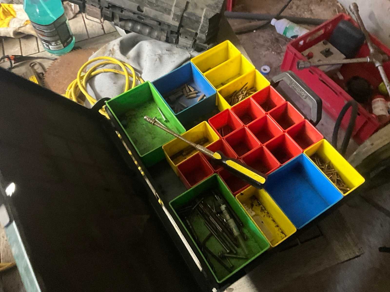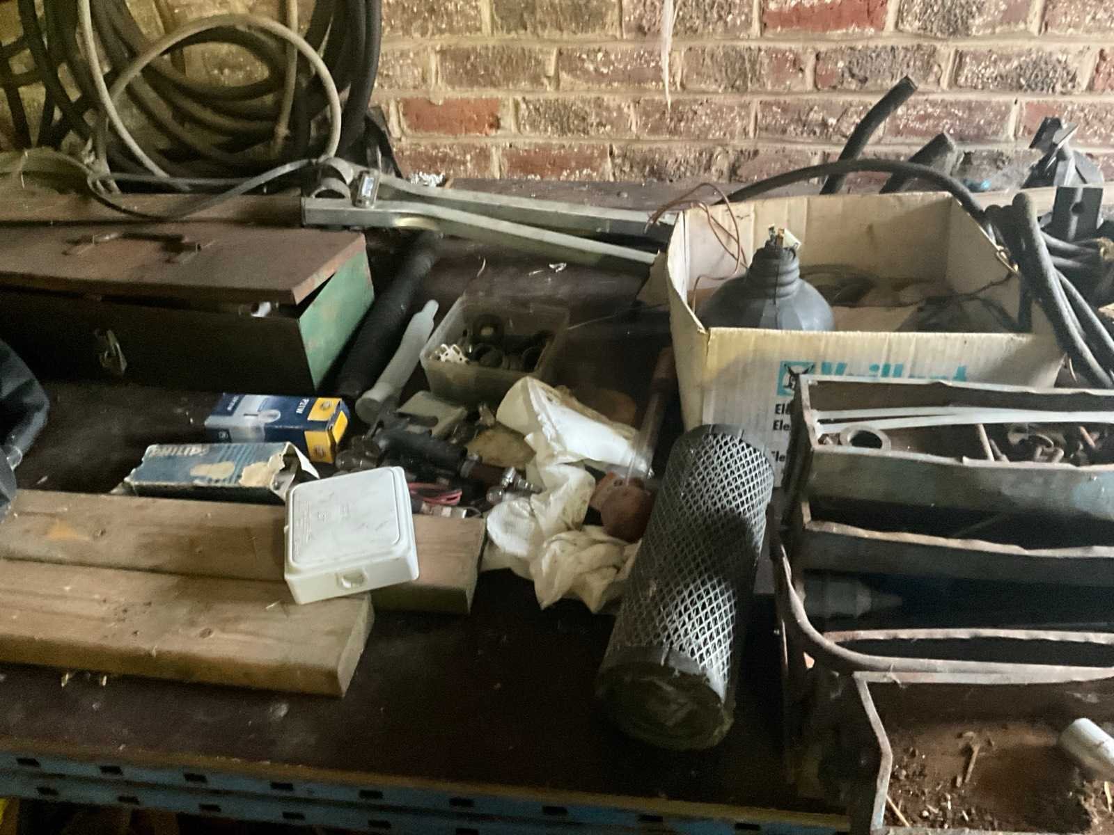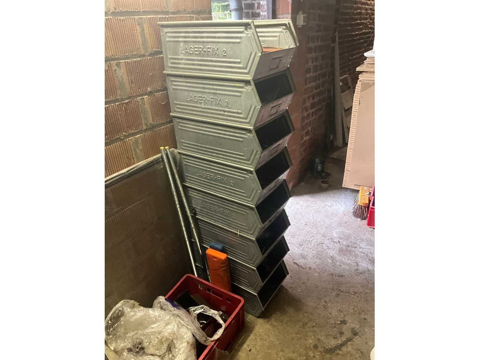 Inhoudende divers werkmateriaal waaronder divers handgereedschap, diverse opbergbakken waaronder in pvc en metaal, metalen opbergrekken, werktafel, diverse sprays, spuitpompen, jerrycans, werktafel, diverse riemen,…