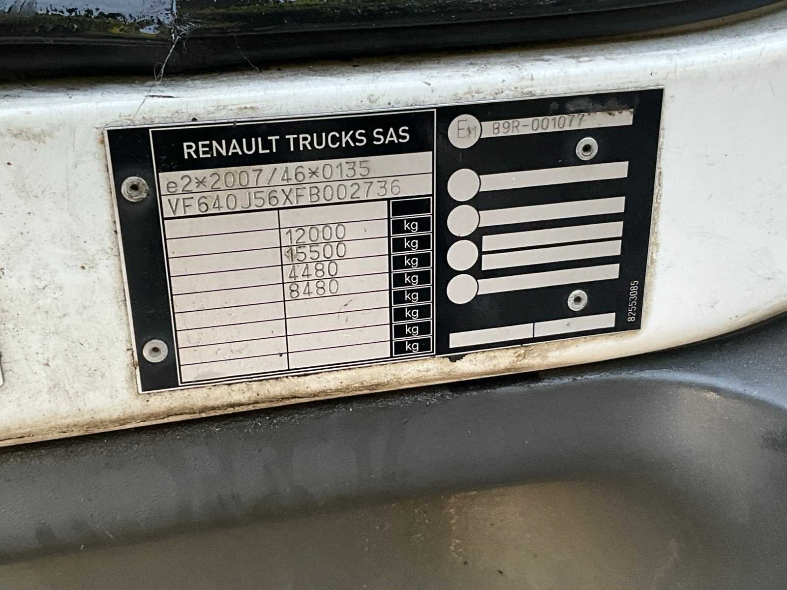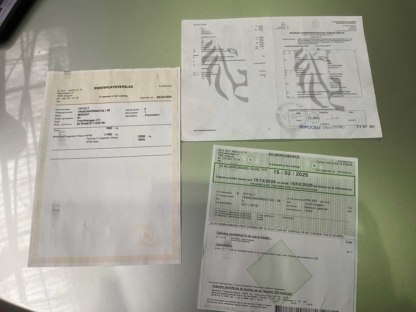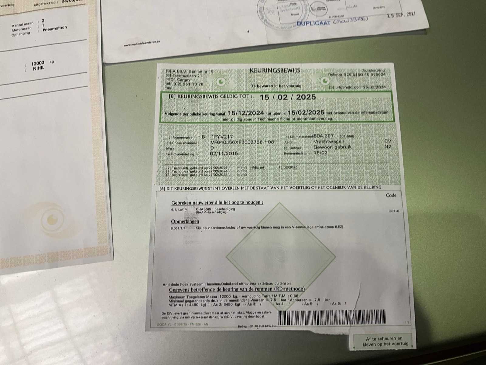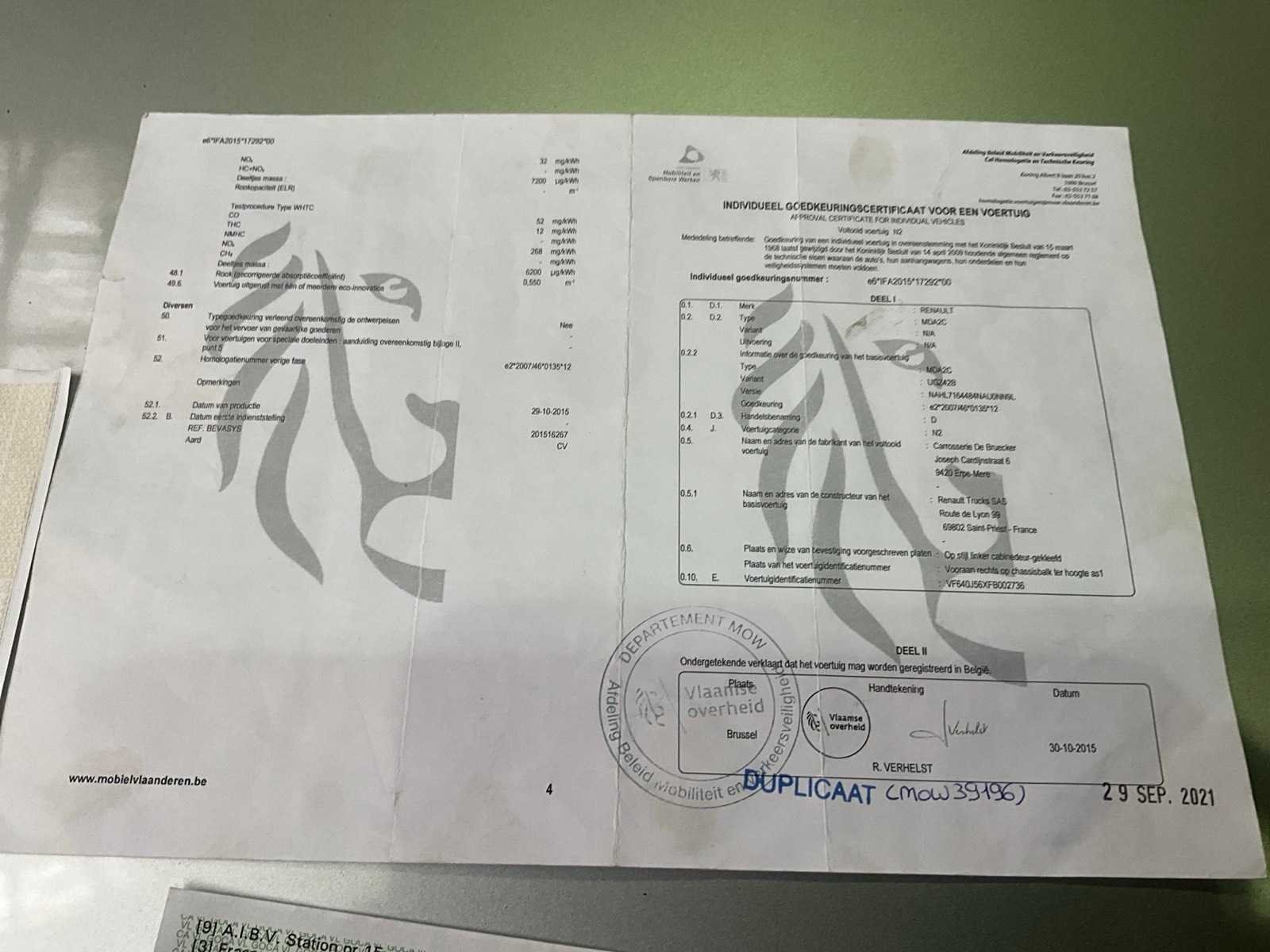 Aanwezige boordocumenten: inschrijvingsbewijs deel I en II, identificatieverslag, keuringsbewijs, conformiteitscertificaat Non Merk: Renault Type: D12 comfort Bouwjaar: 2015 Chassisnummer VIN: VF640J56XFB002736 Cilinderinhoud: 5132cc Datum eerste toelating: 02/11/15 Type transmissie: Automatisch Aantal assen: 2 Fuel Type: Diesel Aantal sleutels: 1 Emissieklasse: Euro 6 Hydraulische laadklep: true Startinformatie: Start mits boosten Afgelezen kilometerstand: 512038km Nationaliteit documenten: Belgisch Aantal zitplaatsen: 2 Automaat: true Diesel: true