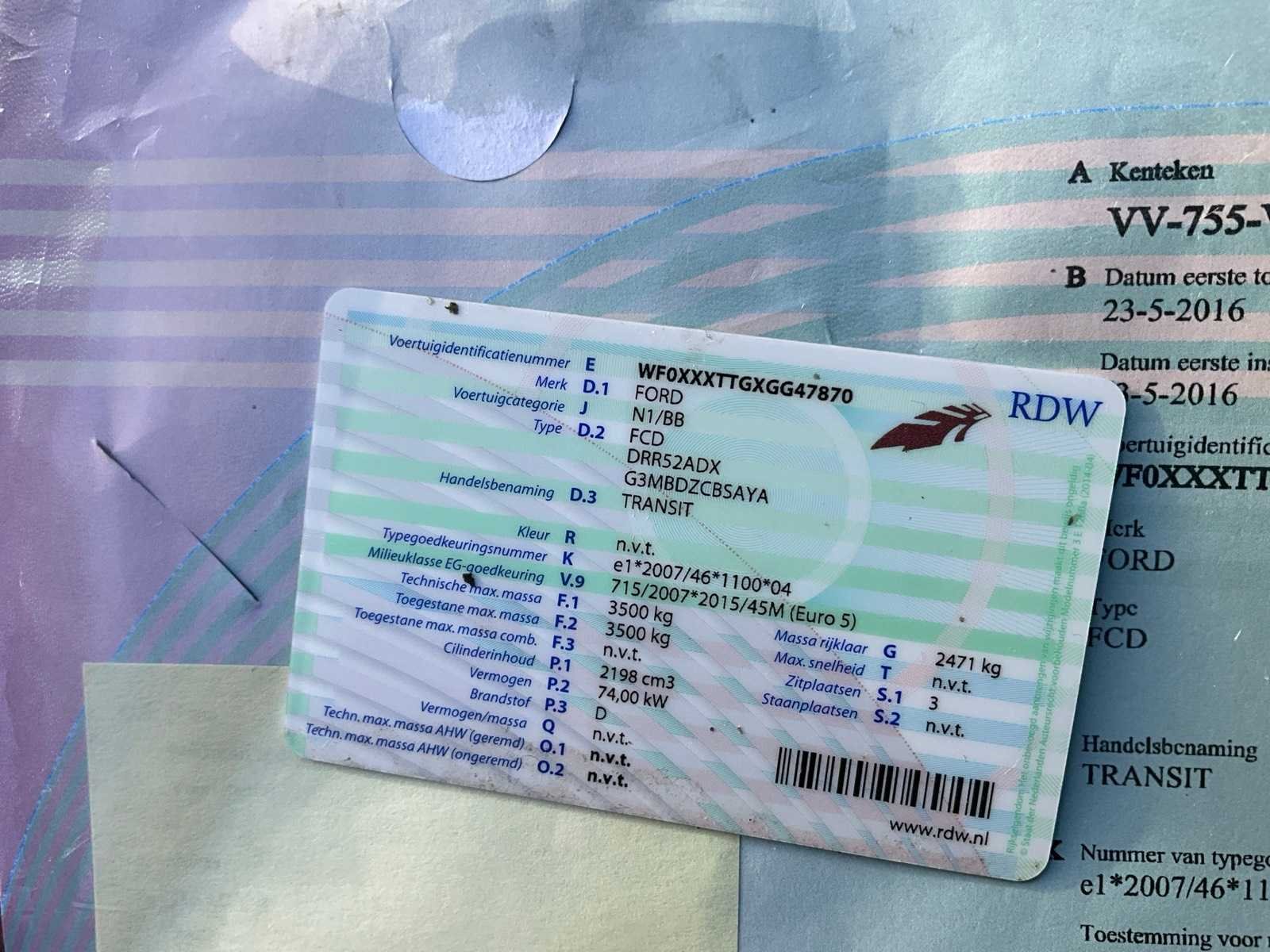 Aanwezige boorddocumenten:kentekenbewijs deel I en II Non Merk: Ford Model: Transit Type: Transit Bouwjaar: 2016 Afgelezen kilometerstand: 90124km Cilinderinhoud: 2198cc Vermogen (kW): 74kW Brandstof: diesel Chassisnummer: WFOXXXTTGXGG4787 Datum eerste toelating: 23/05/2016 Aantal zitplaatsen: 3 Transmissie: Handgeschakeld Emissieklasse: Euro 5 Aantal deuren: 4 Aantal sleutels: 1 Nationaliteit documenten: Nederland Start en rijdt: Ja startinformatie : Ja Vavato voert geen technische keuring uit.: true