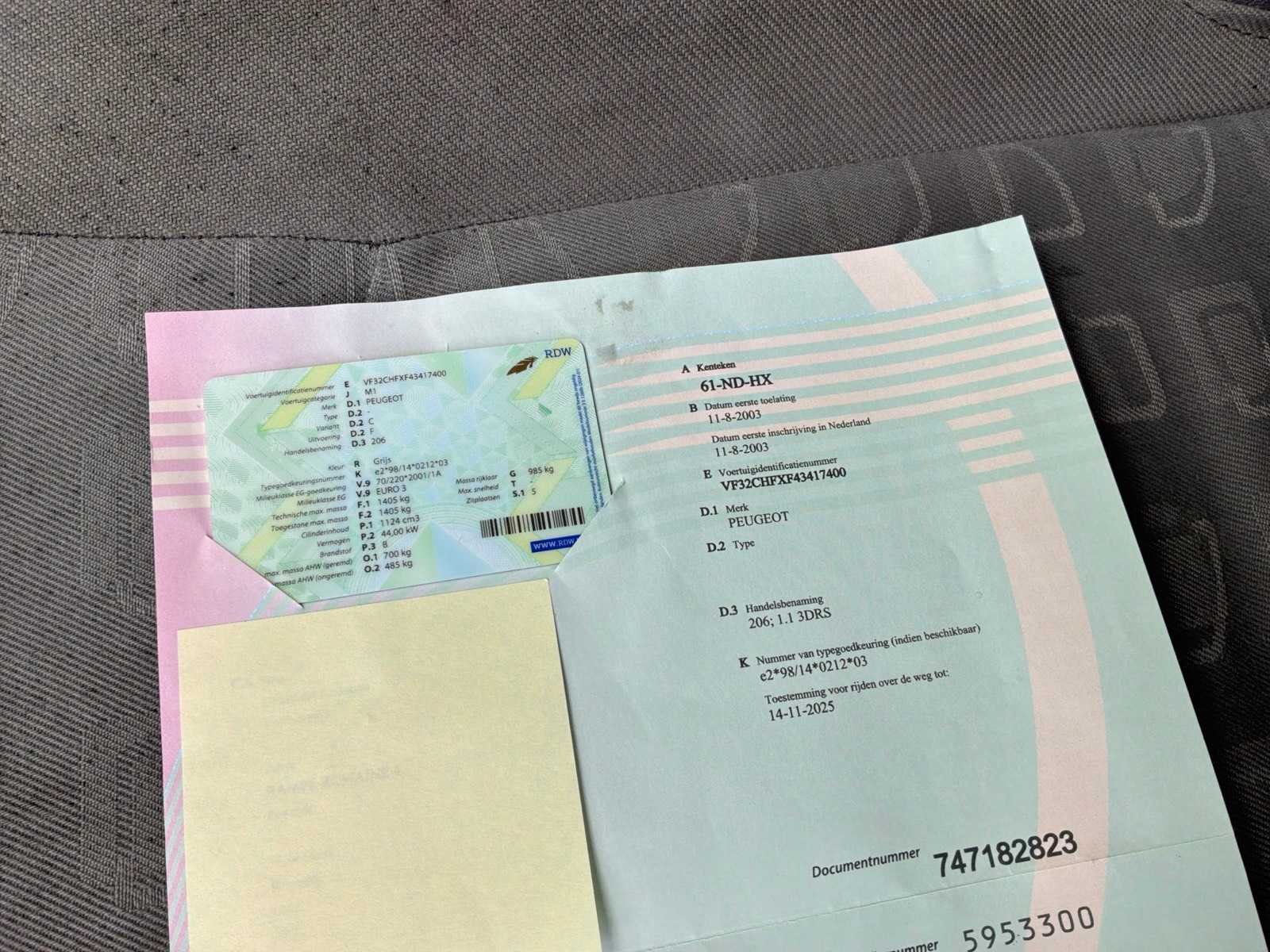 Non Merk: Peugeot Model: 206 Bouwjaar: 2003 Afgelezen kilometerstand: 209207km Cilinderinhoud: 1124cc Vermogen (kW): 44kW Brandstof: benzine Chassisnummer: VF32CHFXF43417400 Aantal zitplaatsen: 5 Transmissie: Handgeschakeld Emissieklasse: Euro3 Aantal deuren: 3 Aantal sleutels: 1 Nationaliteit documenten: Nederland Vavato voert geen technische keuring uit.: true Inschrijvingsbewijs - deel 1 : Aanwezig Inschrijvingsbewijs - deel 2: Aanwezig