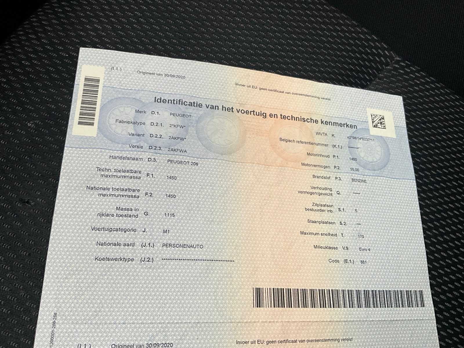 Non Merk: Peugeot Model: 206 Bouwjaar: 2008 Afgelezen kilometerstand: 122504km Cilinderinhoud: 1400cc Vermogen (kW): 55kW Brandstof: benzine Chassisnummer: VF32AKFWA47785619 Datum eerste toelating (NL): 22/04/2008 Aantal zitplaatsen: 5 Transmissie: Handgeschakeld Emissieklasse: 4 Aantal deuren: 5 Aantal sleutels: 2 Nationaliteit documenten: Belgisch Vavato voert geen technische keuring uit.: true Inschrijvingsbewijs - deel 1 : Aanwezig Inschrijvingsbewijs - deel 2: Aanwezig
