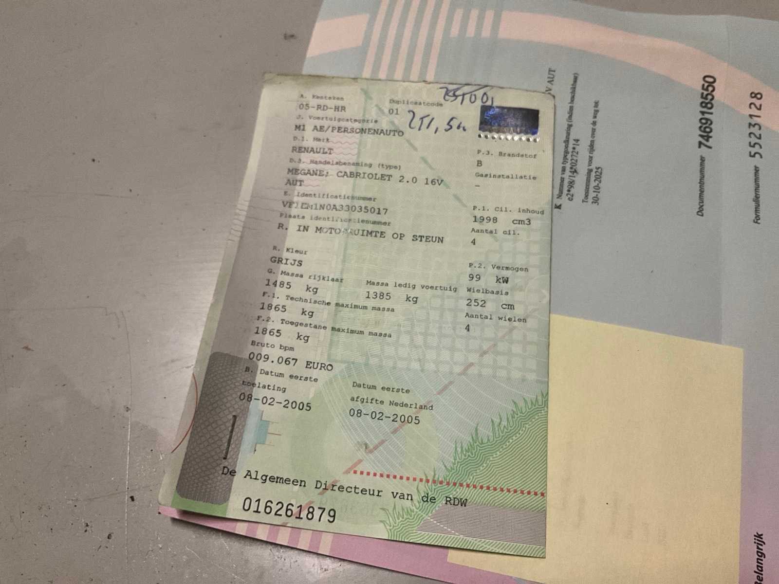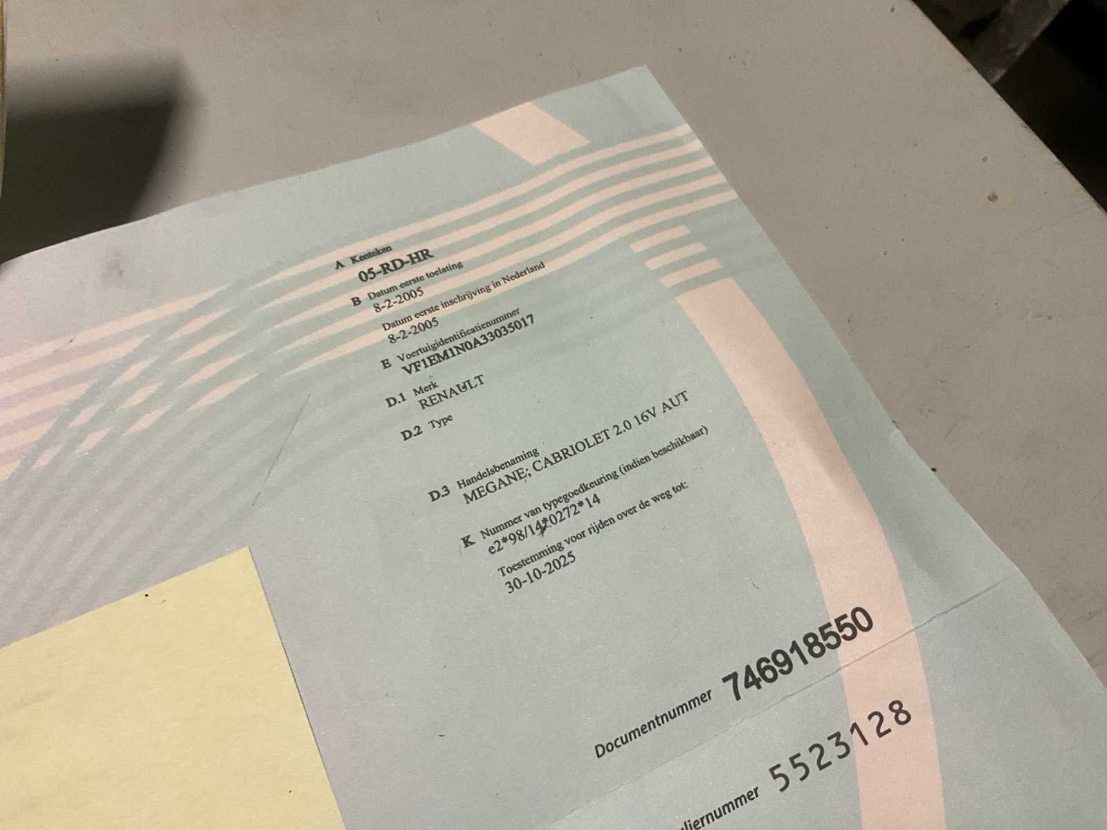 Sleutel aanwezig maar maakt geen contact Non Merk: Renault Model: Megane Bouwjaar: 2005 Cilinderinhoud: 1998cc Vermogen (kW): 99kW Brandstof: benzine Chassisnummer: VF1EM1N0A33035017 Datum eerste toelating (NL): 08/02/2005 Aantal zitplaatsen: 4 Transmissie: Automaat Aantal deuren: 2 Aantal sleutels: 1 Carrosserie: Cabrio Start en rijdt: Neen startinformatie : Start niet maar rijdt Vavato voert geen technische keuring uit.: true Inschrijvingsbewijs - deel 1 : Aanwezig Inschrijvingsbewijs - deel 2: Aanwezig