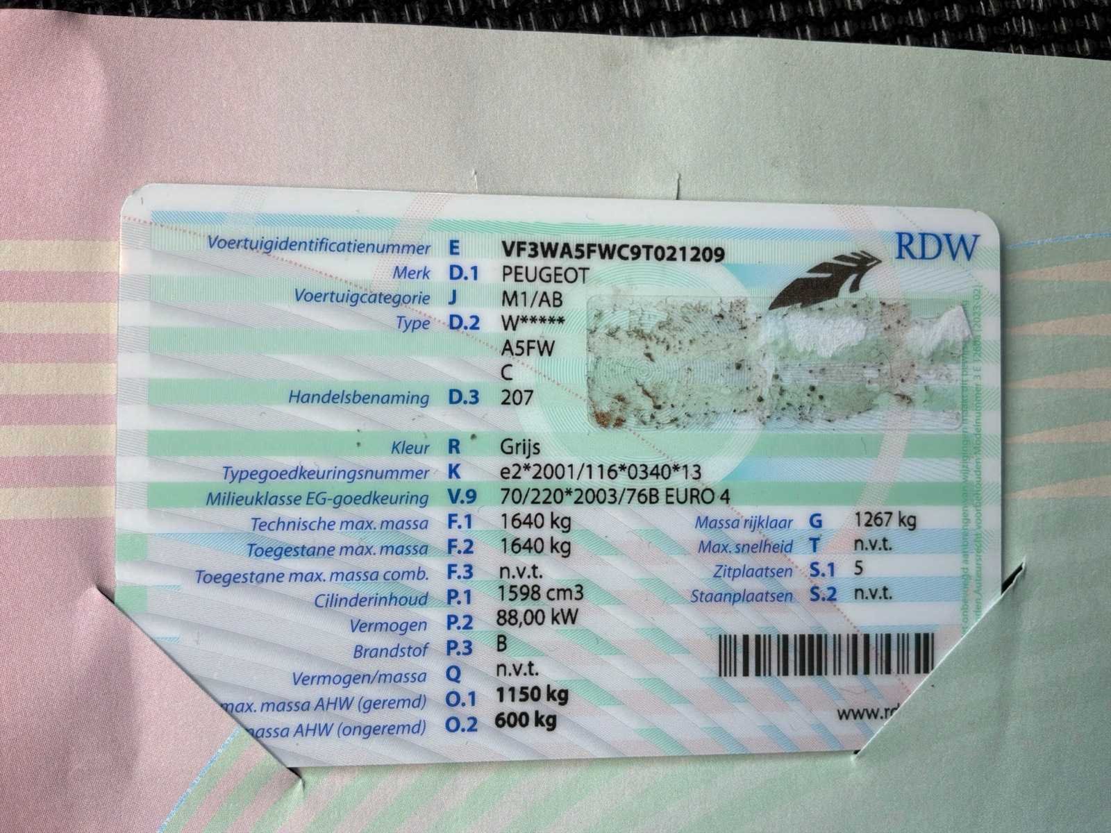 Non Merk: Peugeot Model: 207 Bouwjaar: 2009 Afgelezen kilometerstand: 192214km Cilinderinhoud: 1598cc Vermogen (kW): 88kW Brandstof: benzine Chassisnummer: VF3WA5FWC9T021209 Datum eerste toelating (NL): 11/04/2009 Aantal zitplaatsen: 5 Transmissie: Handgeschakeld Emissieklasse: Euro4 Aantal deuren: 3 Aantal sleutels: 2 Nationaliteit documenten: Nederland Start en rijdt: Ja startinformatie : Start en rijdt Inschrijvingsbewijs - deel 1 : Aanwezig Inschrijvingsbewijs - deel 2: Aanwezig