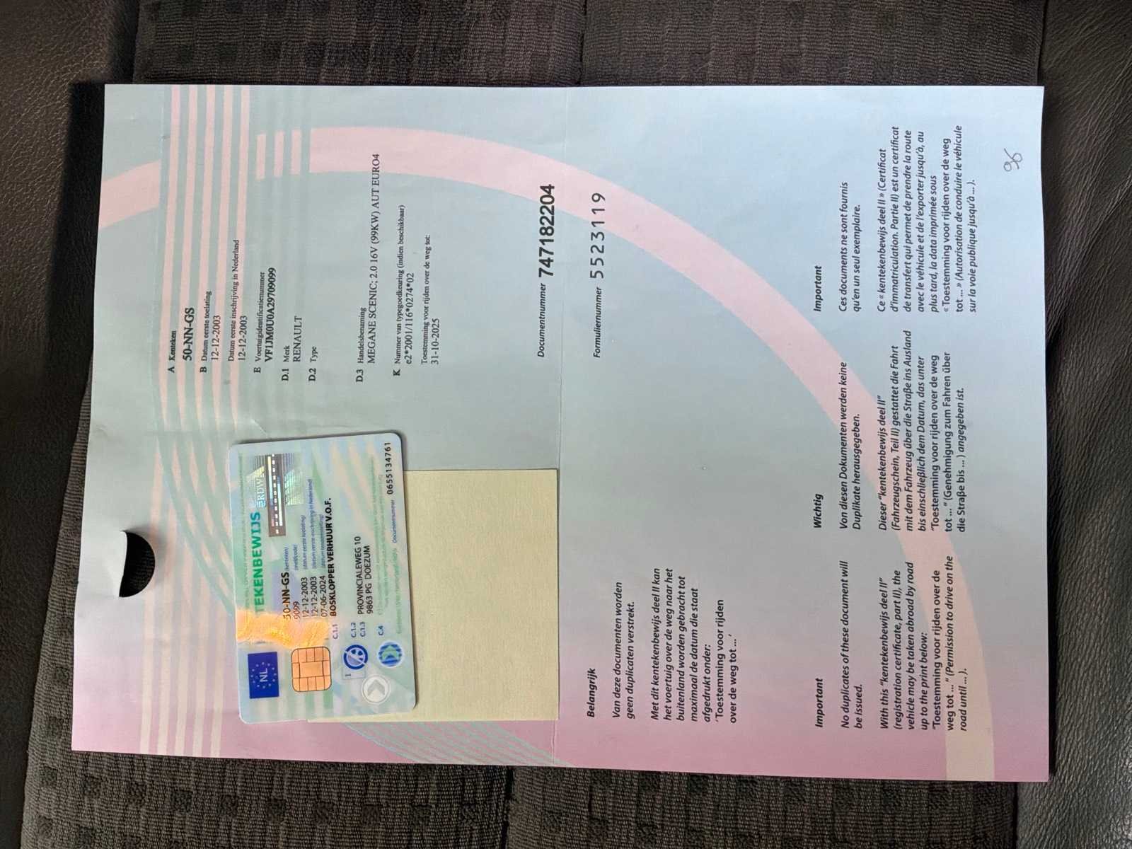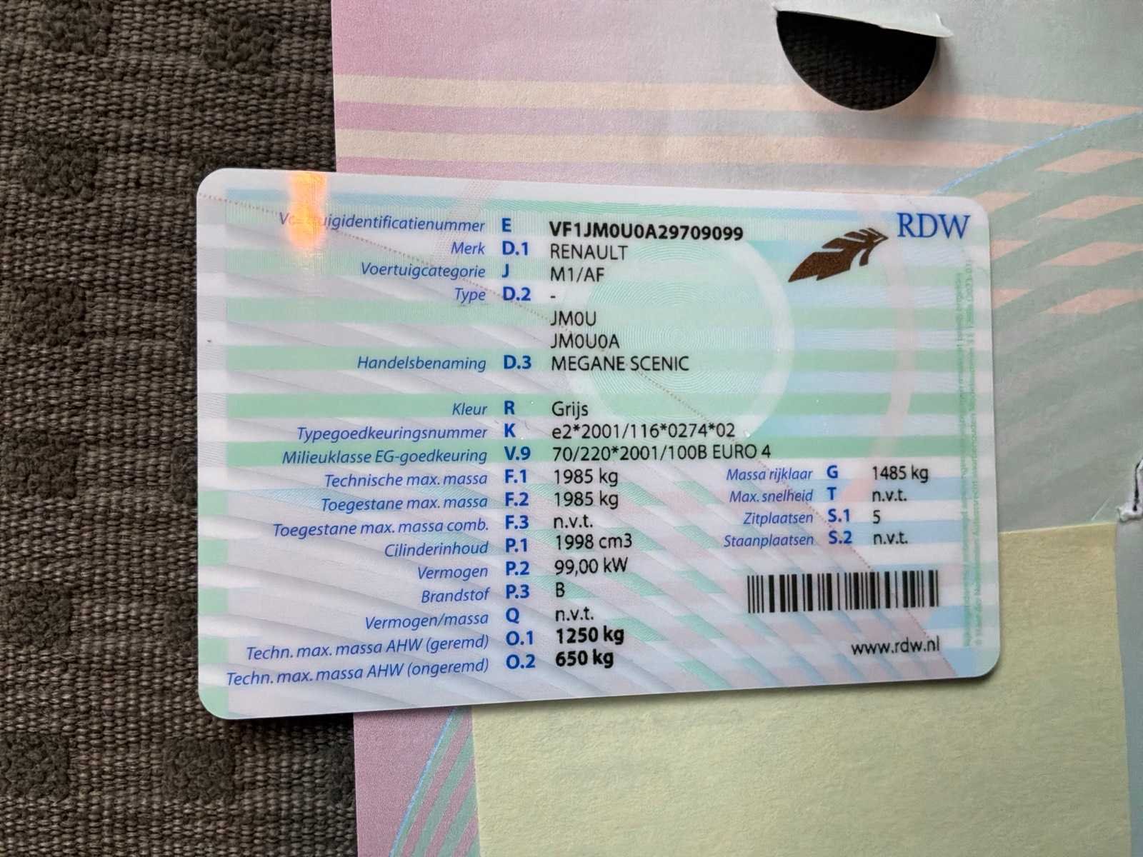 Non Merk: Renault Model: Megane Bouwjaar: 2003 Afgelezen kilometerstand: 184821km Cilinderinhoud: 1998cc Vermogen (kW): 99kW Brandstof: benzine Chassisnummer: VF1JM0U0A29709099 Datum eerste toelating: 12-12-2003 Energielabel: 4 Aantal zitplaatsen: 5 Aantal sleutels: 1 Nationaliteit documenten: Nederland Start en rijdt: Ja startinformatie : Start en rijd Inschrijvingsbewijs - deel 1 : Aanwezig Inschrijvingsbewijs - deel 2: Aanwezig
