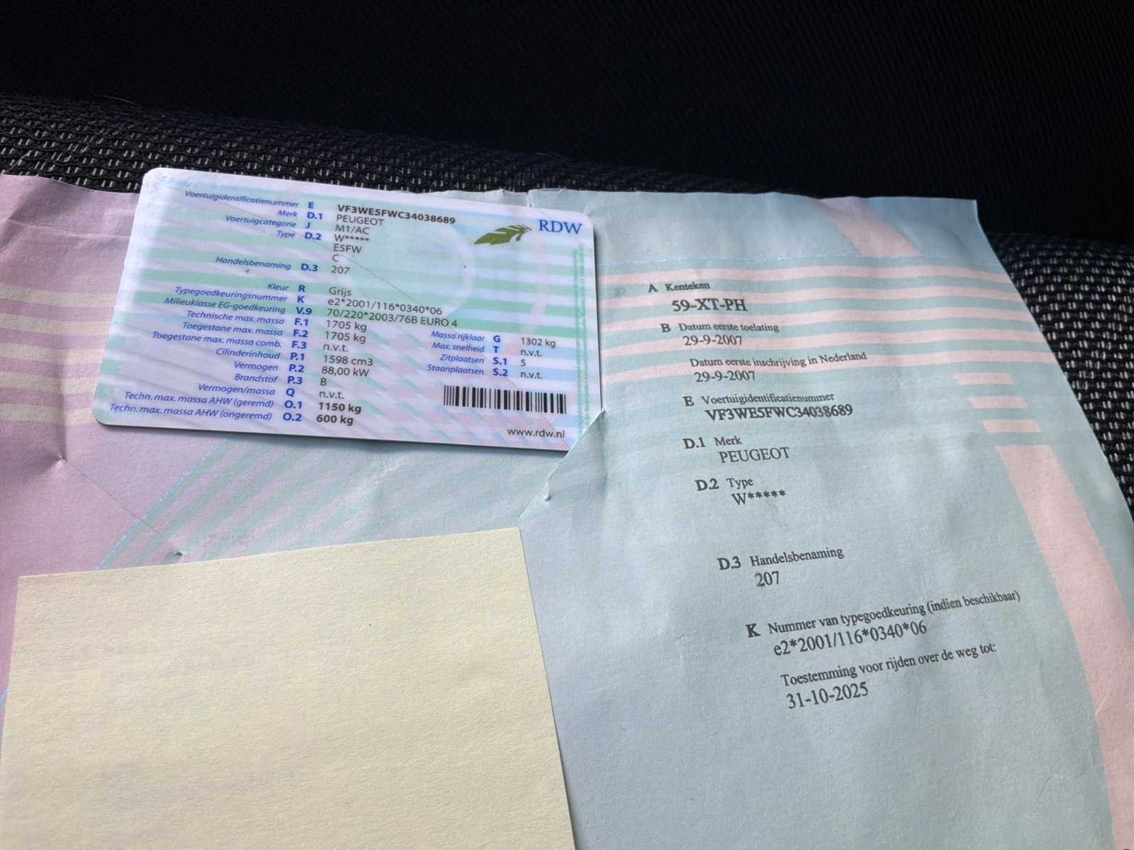 Non Merk: Peugeot Model: 207 SW Bouwjaar: 2007 Afgelezen kilometerstand: 190295km Cilinderinhoud: 1598cc Vermogen (kW): 88kW Brandstof: benzine Chassisnummer: VF3WE5FWC34038689 Datum eerste toelating (NL): 29/09/2007 Aantal zitplaatsen: 5 Transmissie: Handgeschakeld Aantal deuren: 5 Nationaliteit documenten: Nederland Start en rijdt: Ja Vavato voert geen technische keuring uit.: true Inschrijvingsbewijs - deel 1 : Aanwezig Inschrijvingsbewijs - deel 2: Aanwezig