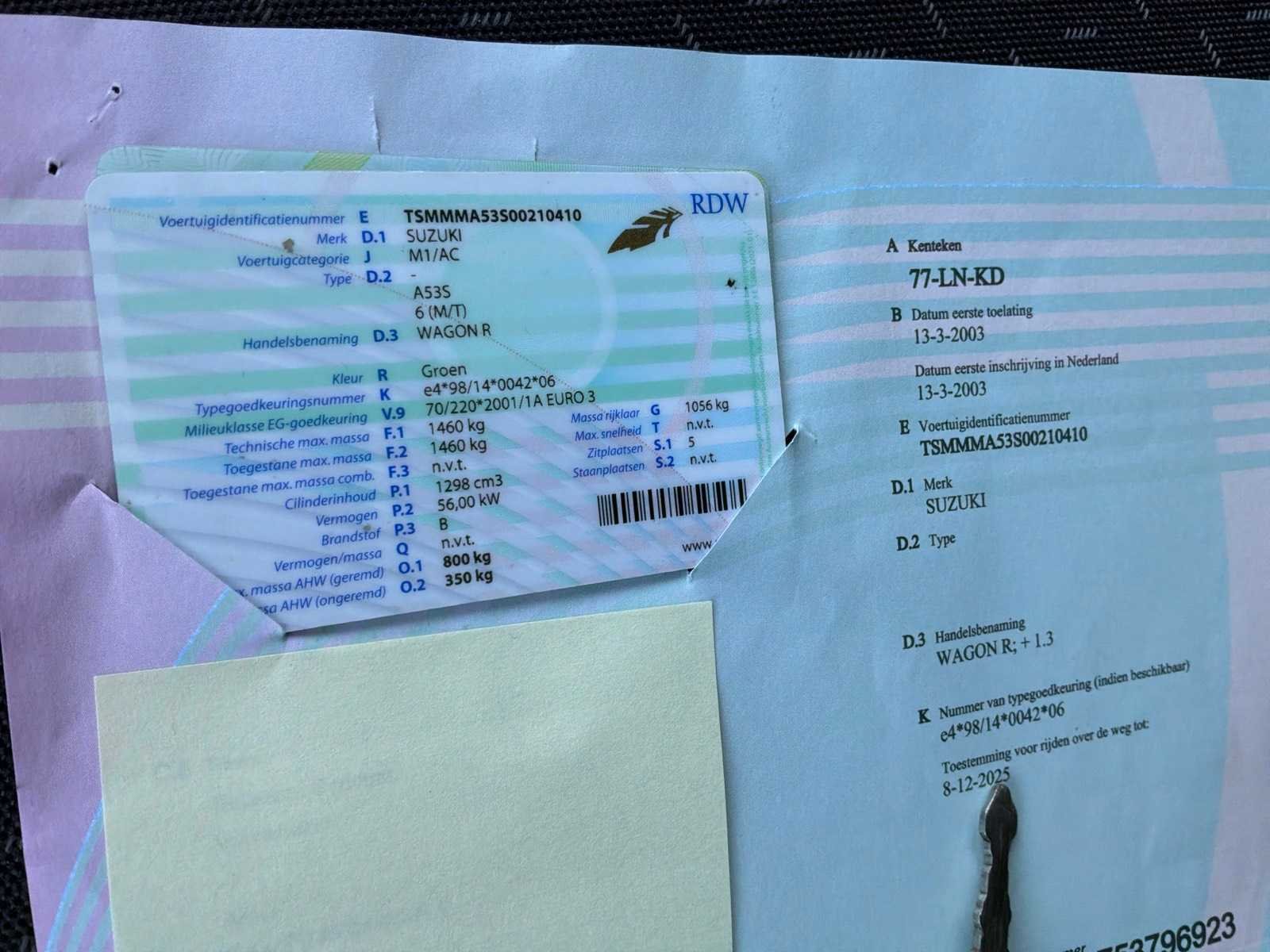 Non Merk: Suzuki Model: Wagon R Bouwjaar: 2003 Afgelezen kilometerstand: 179165km Cilinderinhoud: 1298cc Vermogen (kW): 56kW Brandstof: benzine Chassisnummer: PSMMMA53S00210410 Datum eerste toelating (NL): 13/03/2003 Aantal zitplaatsen: 5 Transmissie: Handgeschakeld Emissieklasse: Euro3 Aantal deuren: 5 Aantal sleutels: 1 Start en rijdt: Ja startinformatie : Start en rijdt Vavato voert geen technische keuring uit.: true Inschrijvingsbewijs - deel 1 : Aanwezig Inschrijvingsbewijs - deel 2: Aanwezig
