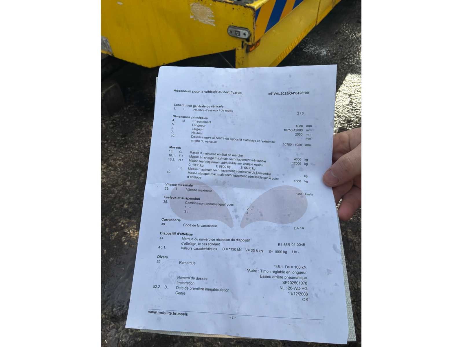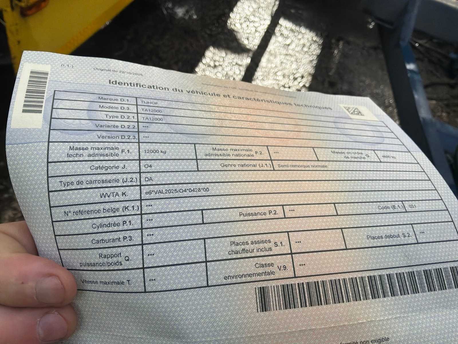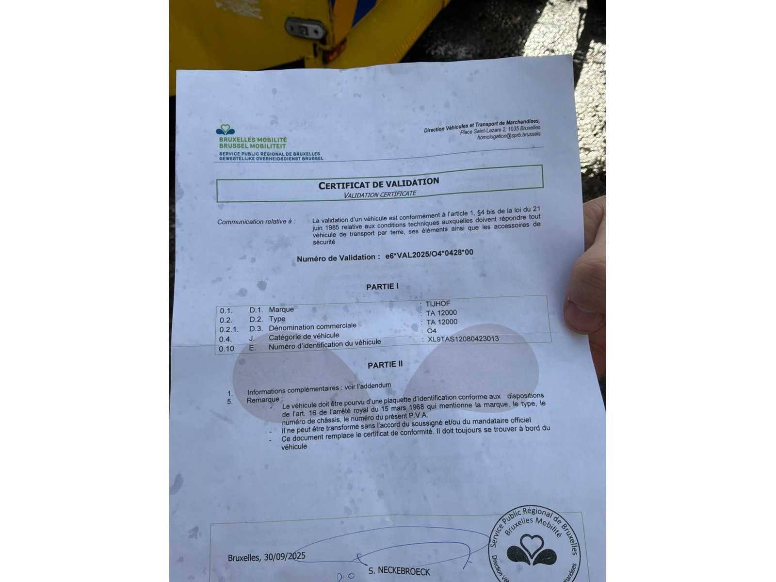 Voor 3 voertuigen, aanwezige boorddocumenten, inschrijvingsbewijs deel I en II, conformiteitscertificaat Non Merk: Tijhof Type: Ta12000 Bouwjaar: 2008 Chassisnummer VIN: XL9tas12080423013 Datum eerste toelating: 11/12/2008 Aantal assen: 2 Laadvermogen: 12000kg Totale afmeting L: 8000mm Totale afmeting Breedte: 2550mm