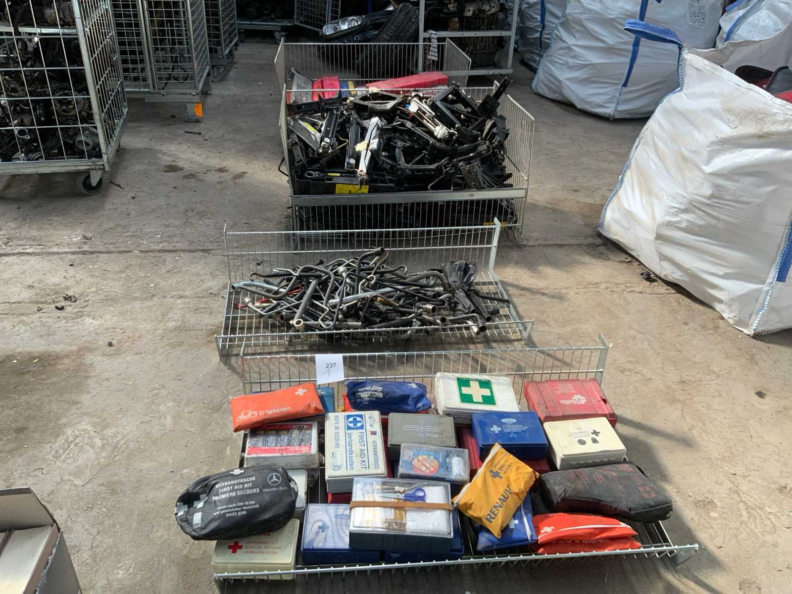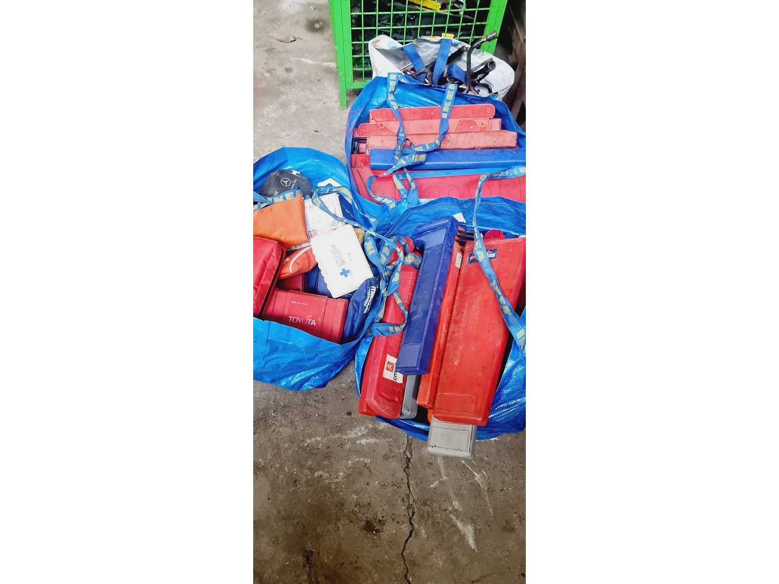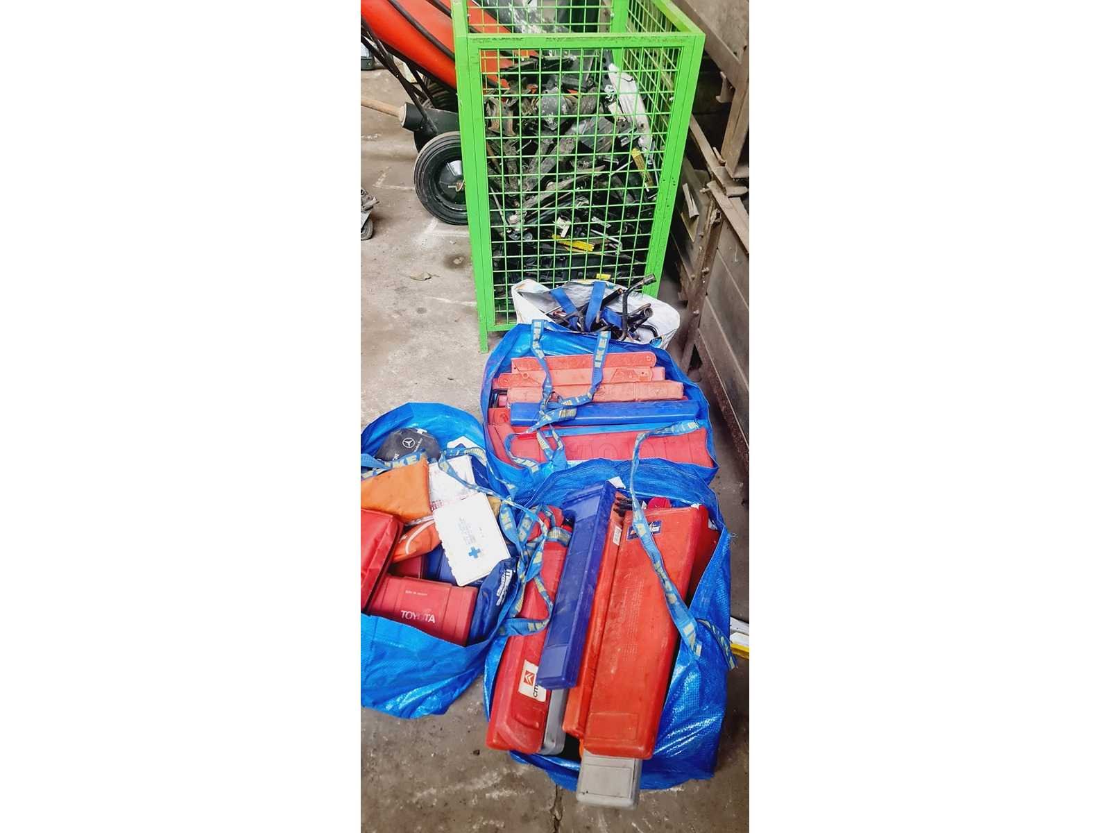Bestaande uit: partij EHBO kistjes 35x, partij auto krik’s 90x, partij gevarendriehoeken 70x, wiel sleutel +/- 100x draadmanden niet inbegrepen Non