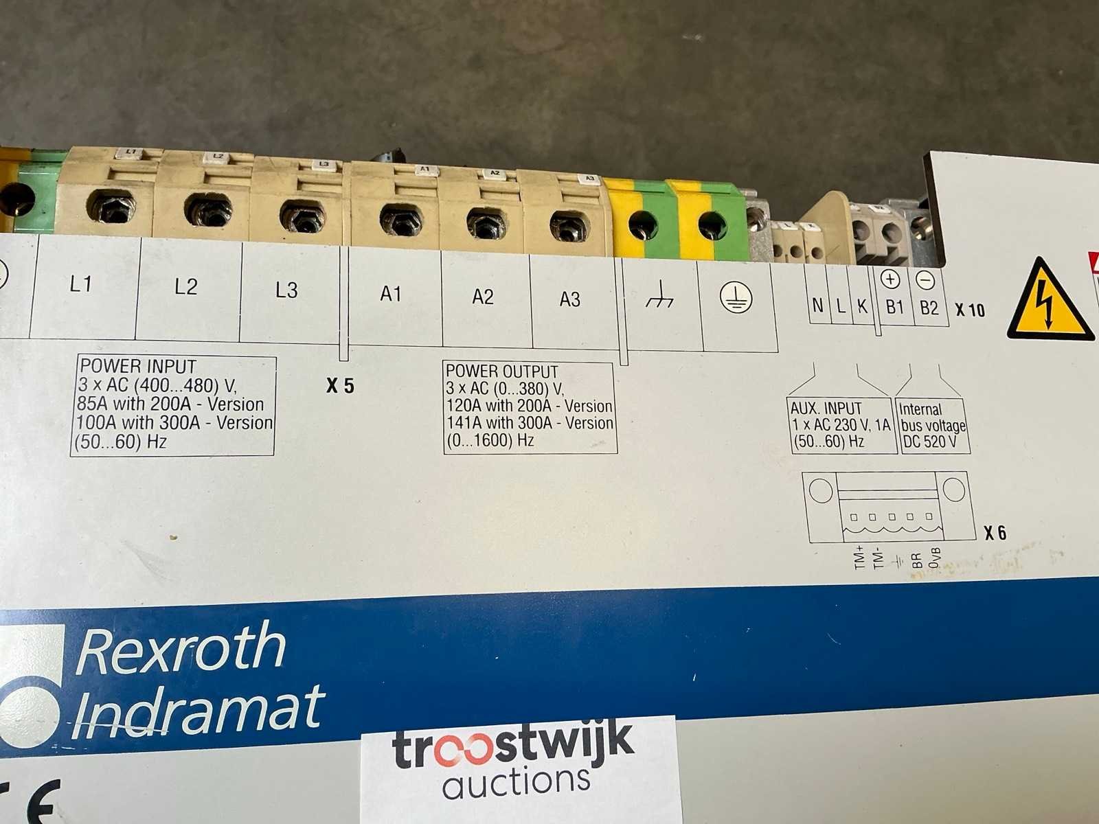 <Br> Power input: -3 x AC 400–480 V. - 85 A (200A versie). - 100 A (300A versie). - 50/60 Hz. Power output: - 3 x AC 0–380 V. - 120 A (200A versie). - 141 A (300A versie). - Frequentiebereik 0–1600 Hz. Merk: Rexroth Indramat Type: DIAX03 / DKR02 Totale afmeting L: 290mm Totale afmeting Breedte: 430mm Totale afmeting Hoogte: 1000mm