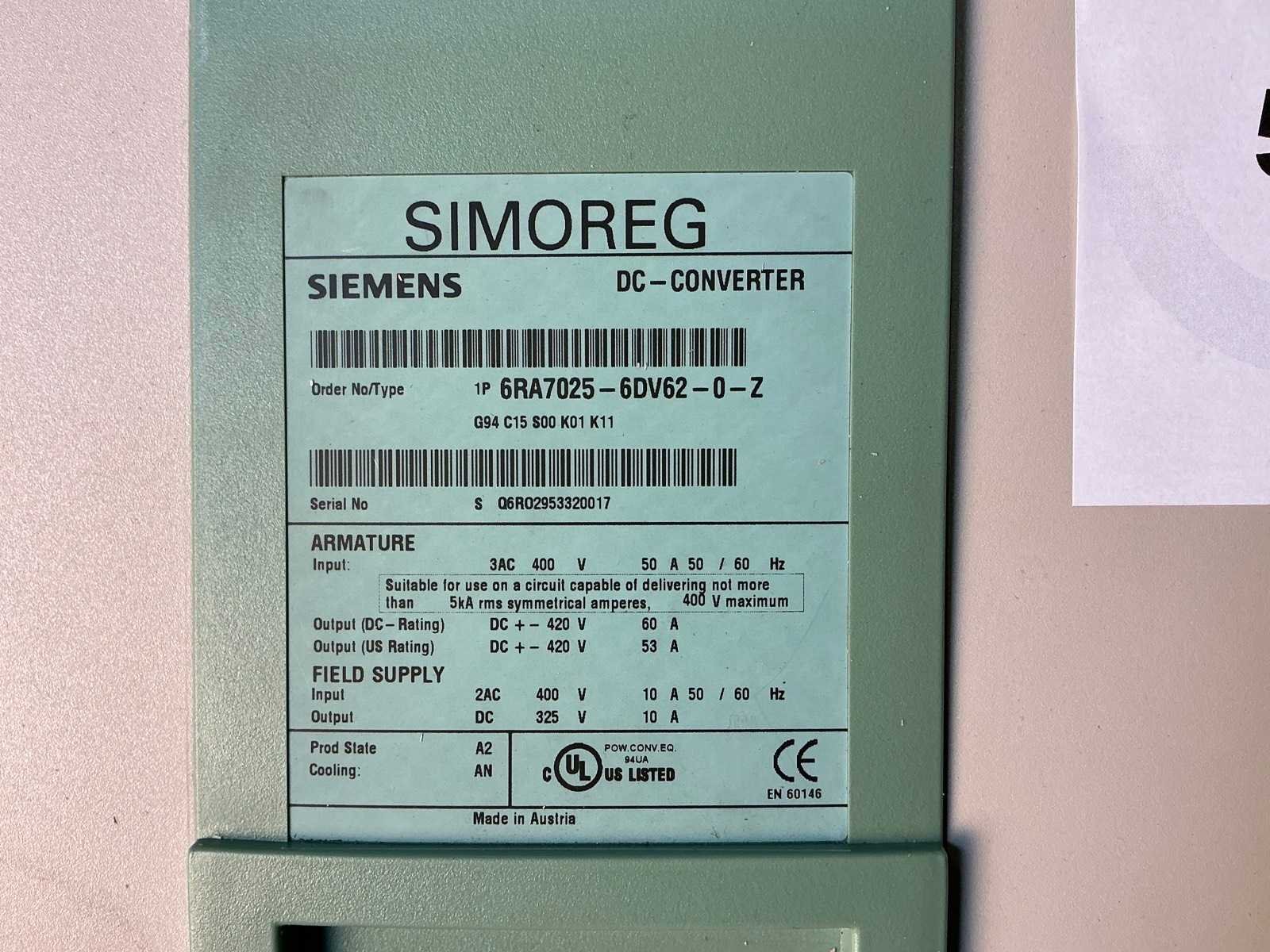<Br> - Ingang: 3AC 400V 50A. - Uitgang: DC +- 420V 60A. Merk: Siemens Model: Simoreg Product type: 6RA7025-6DV62-0-Z Digitaal: true