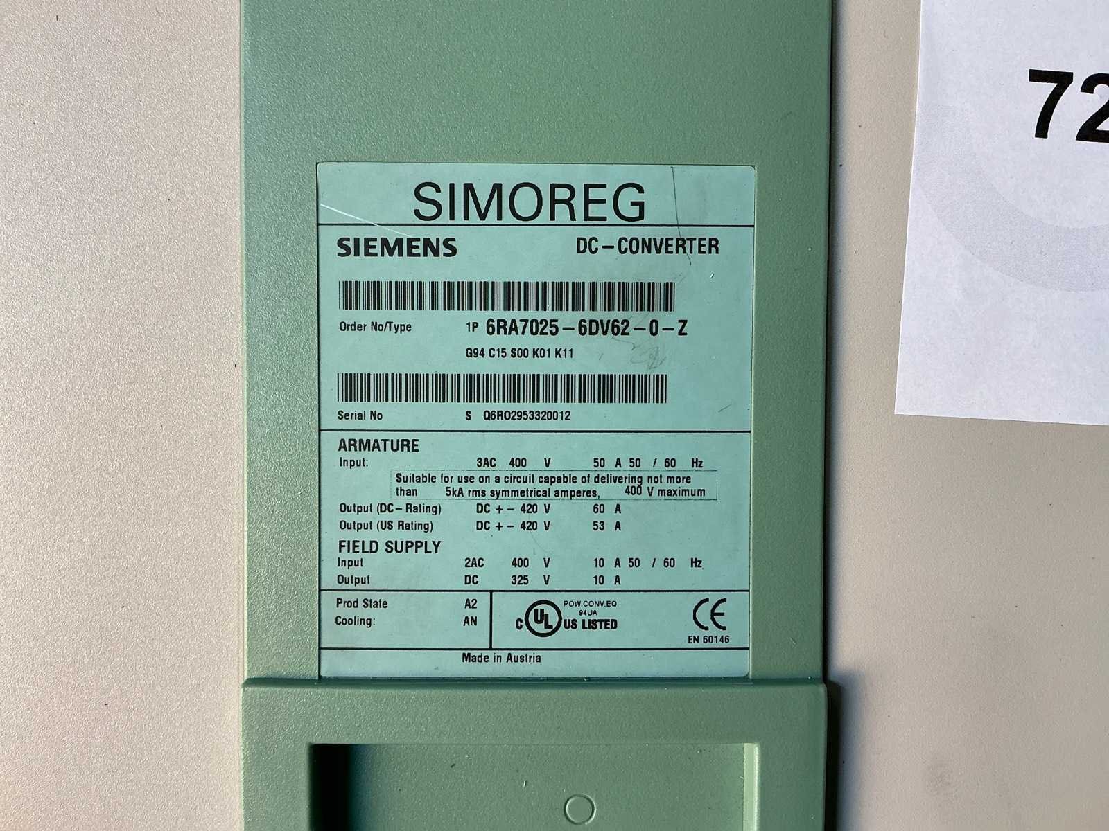 <Br> - 50A. Merk: Siemens Model: Simoreg Product type: 6RA7025-6DV62-0-Z Digitaal: true