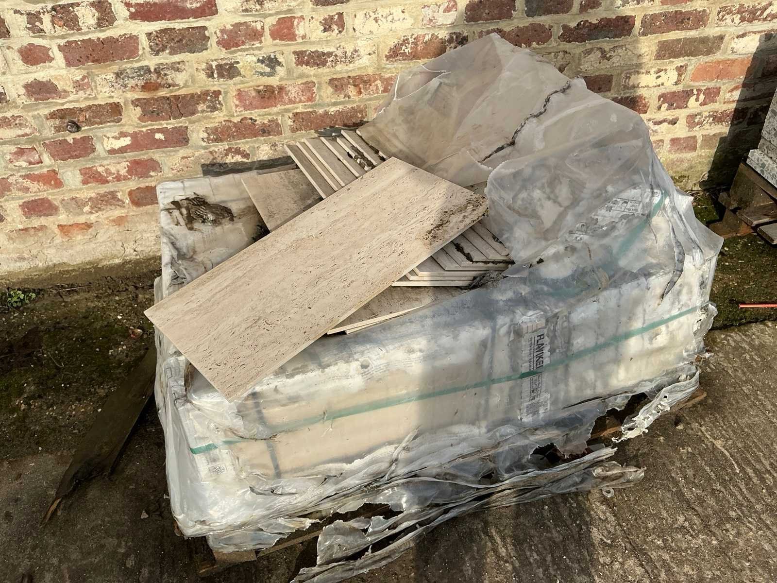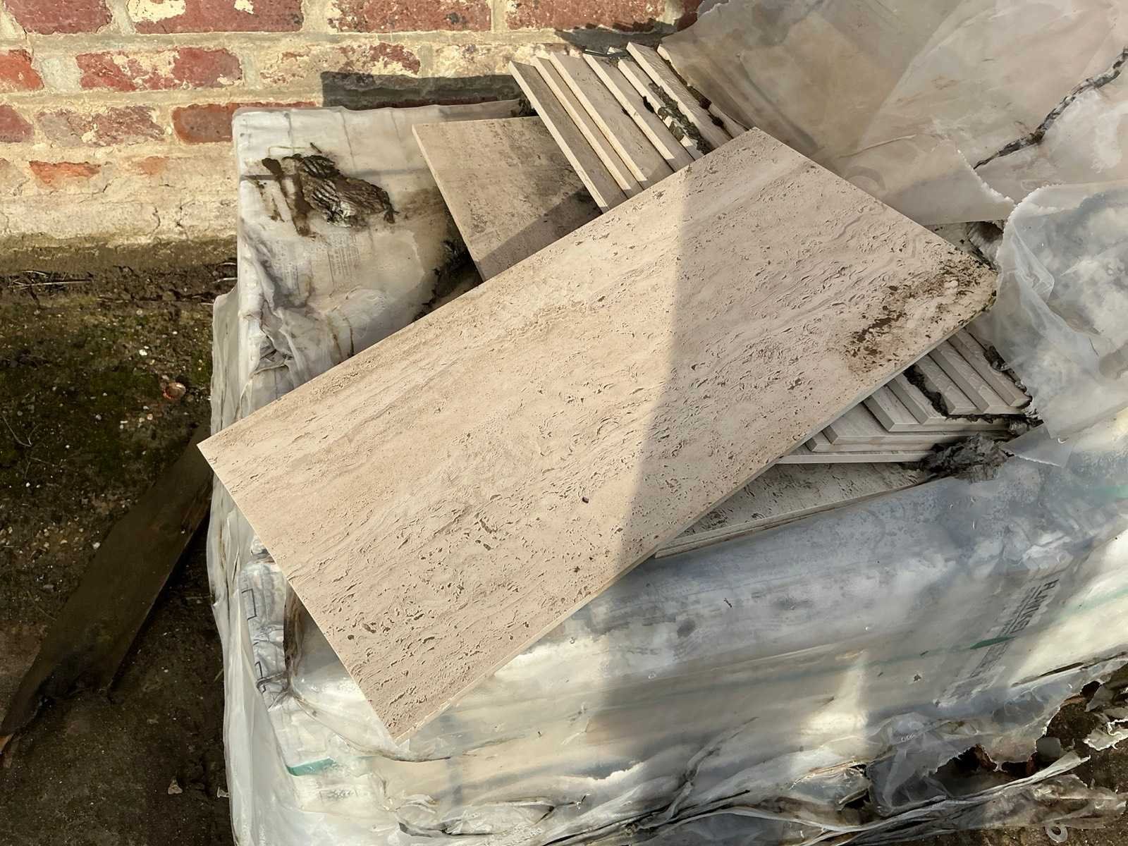 Fosil green gezandstraald. Liggende op 1x pallet. Afmeting l: 600mm Afmeting b: 300mm Afmeting h: 20mm