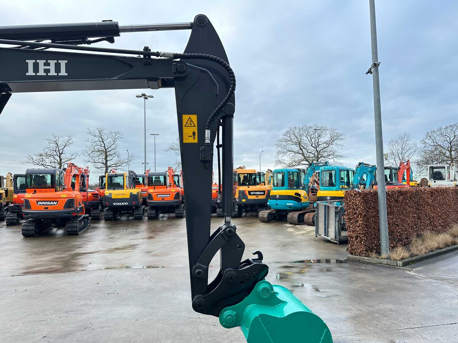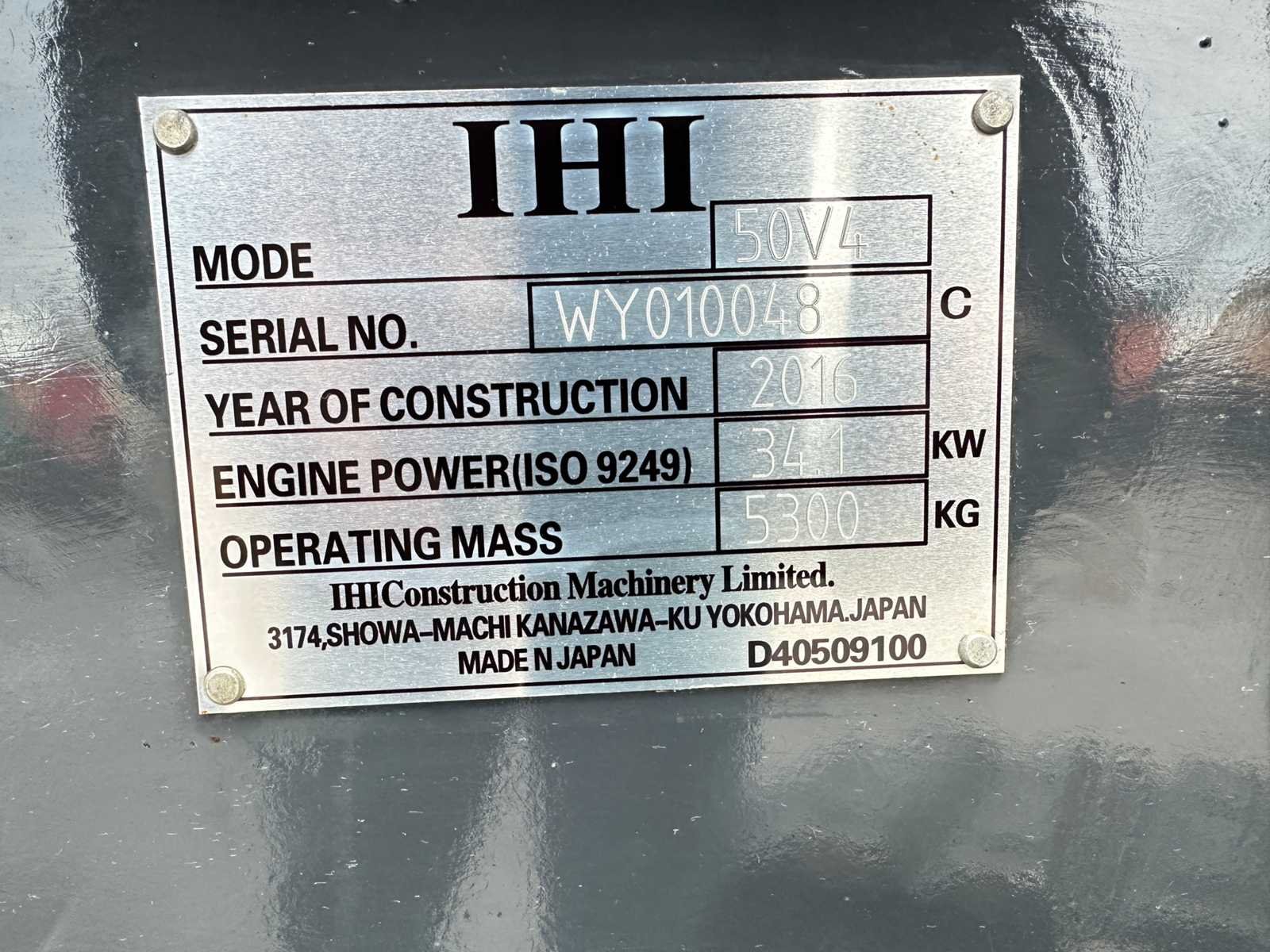 -Hamerleidingen. -Mechanische snelwissel. -Tandenbak. -Duwblad. -Rupsen met rubber pads. -Geen documenten. Merk: IHI Type: 50V4 Bouwjaar: 2016 Serienummer: WY010048 Merk motor: Kubota V2403 Motorvermogen (kW): 34.1kW Aantal cilinders: 4 Brandstof: Diesel Graafbak afm. b: 650mm Rups breedte: 400mm Afgelezen urenstand: 5456 Eigen gewicht: 5300kg Totale afmeting L: 5400mm Totale afmeting Breedte: 2000mm Totale afmeting Hoogte: 2500mm GS Code: 8429521200