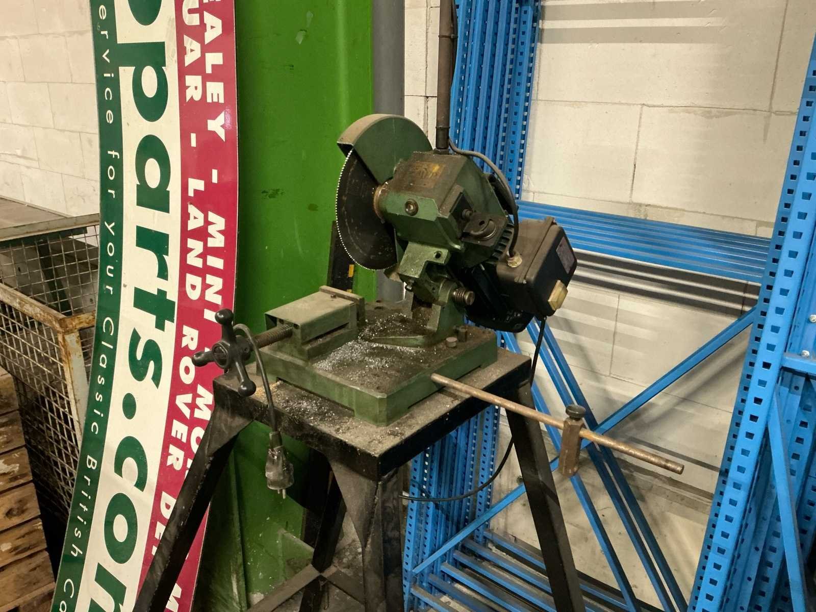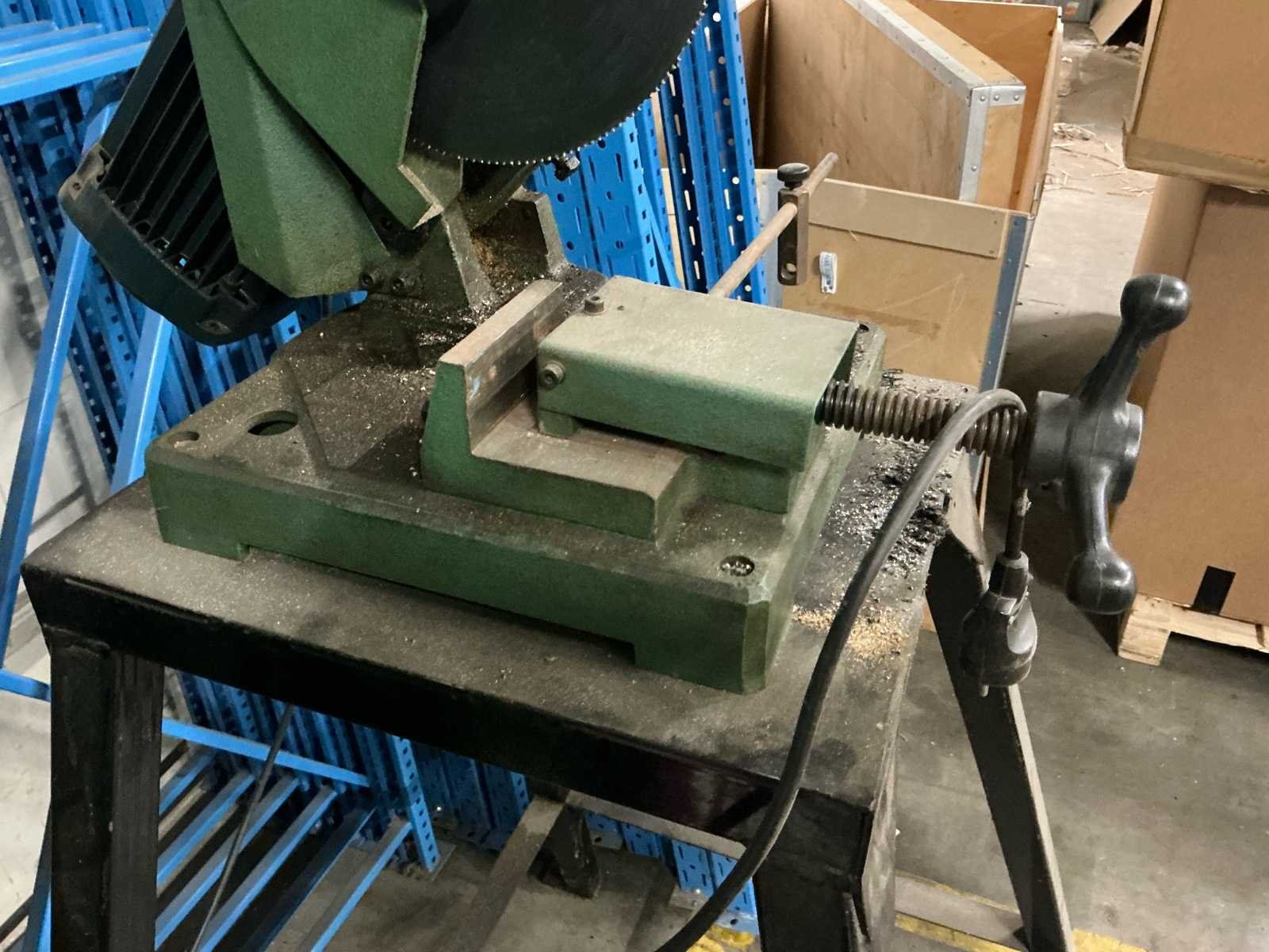 Industriële metaalafkortzaag (koudzaag) met cirkelzaagblad, geschikt voor het nauwkeurig afkorten van stalen buizen, kokers en profielen. Uitgerust met krachtige elektromotor (0,75 kW / 1 PK), verstelbare zaagkop en geïntegreerde bankschroef voor stabiele materiaalfixatie. Geplaatst op stevig stalen onderstel. Ideaal voor werkplaats- en magazijntoepassingen.