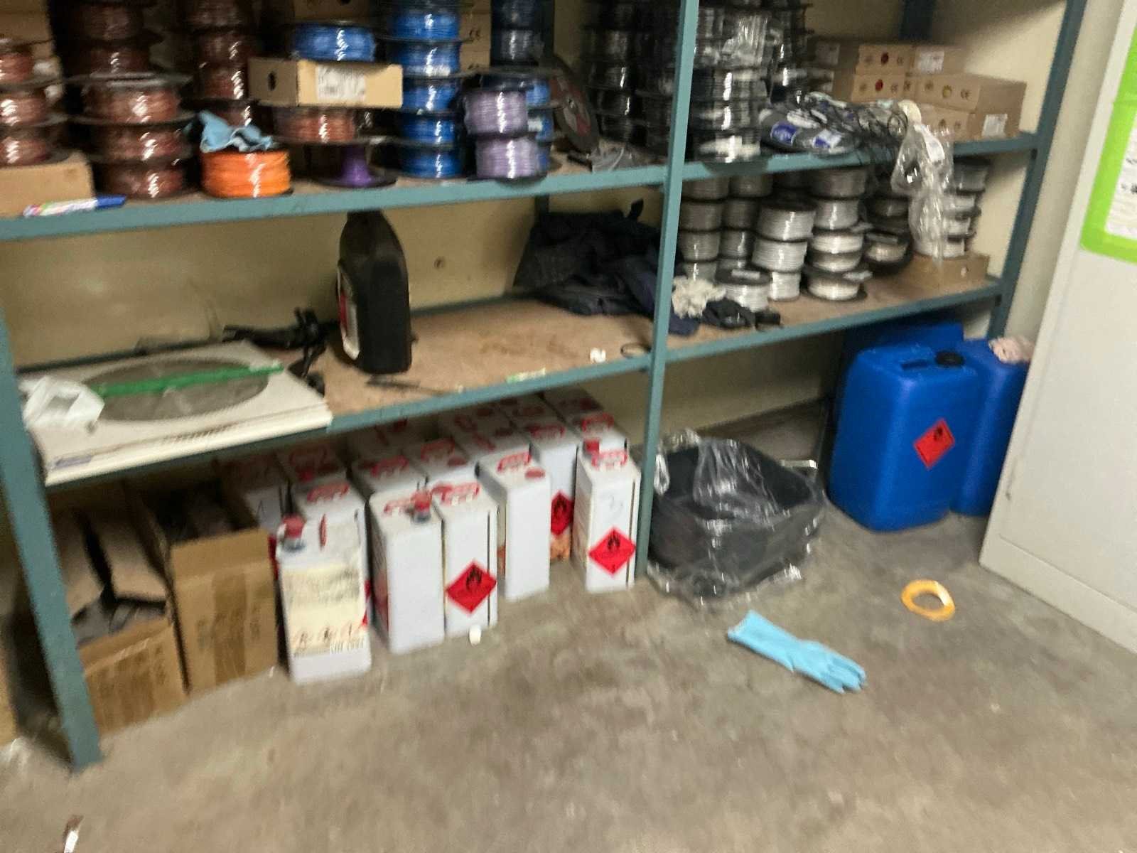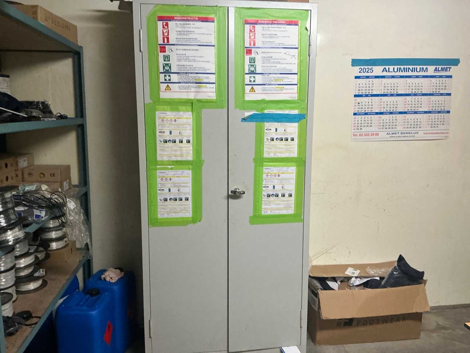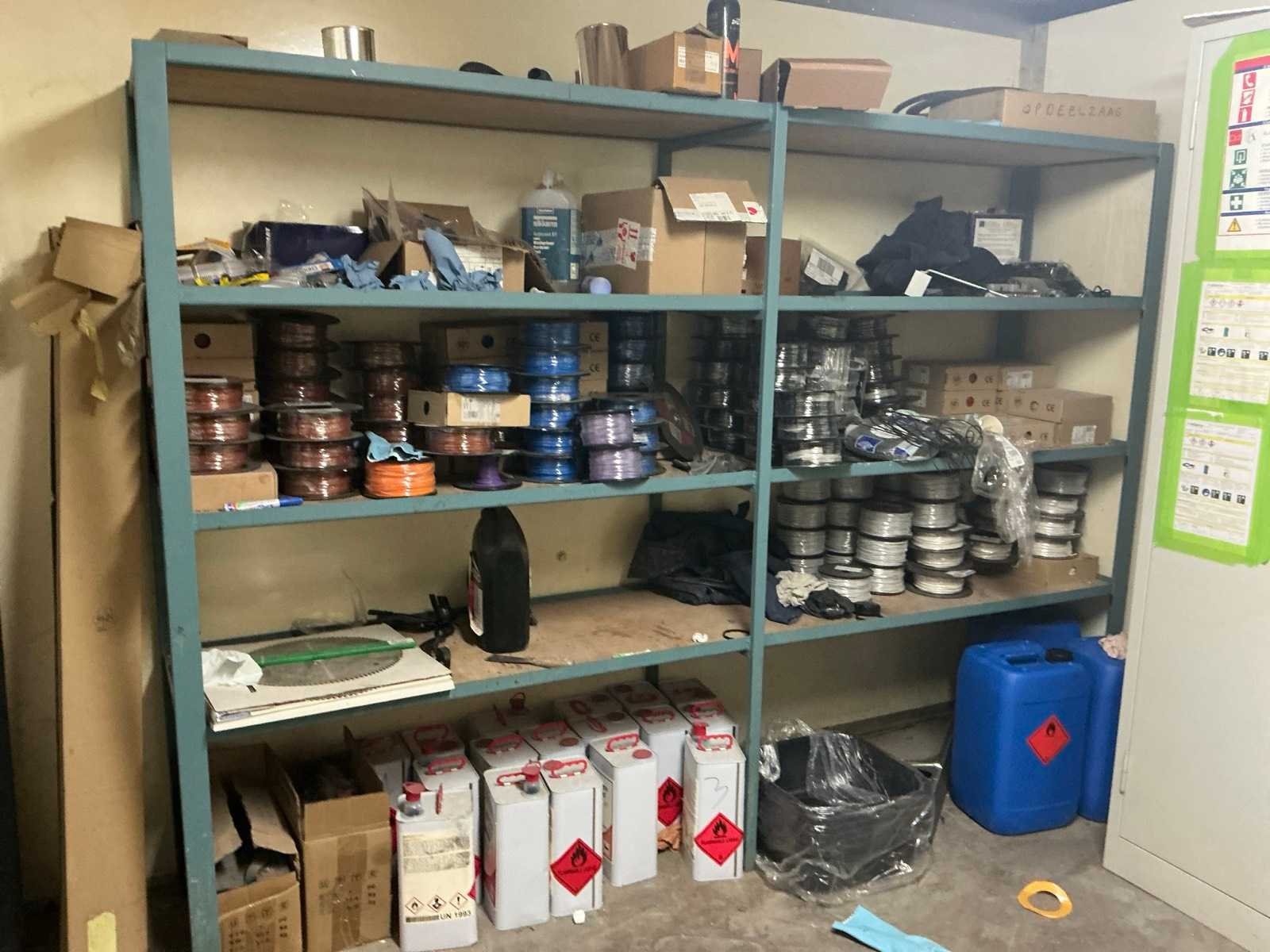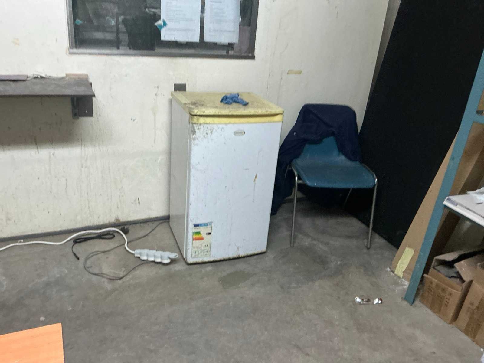 Bestaande uit: bureautafel, 3 x stoel, 2-deurs metalen kast, Magazijnstelling met inbegrip van onderhande diverse elektrokabels, koelkast