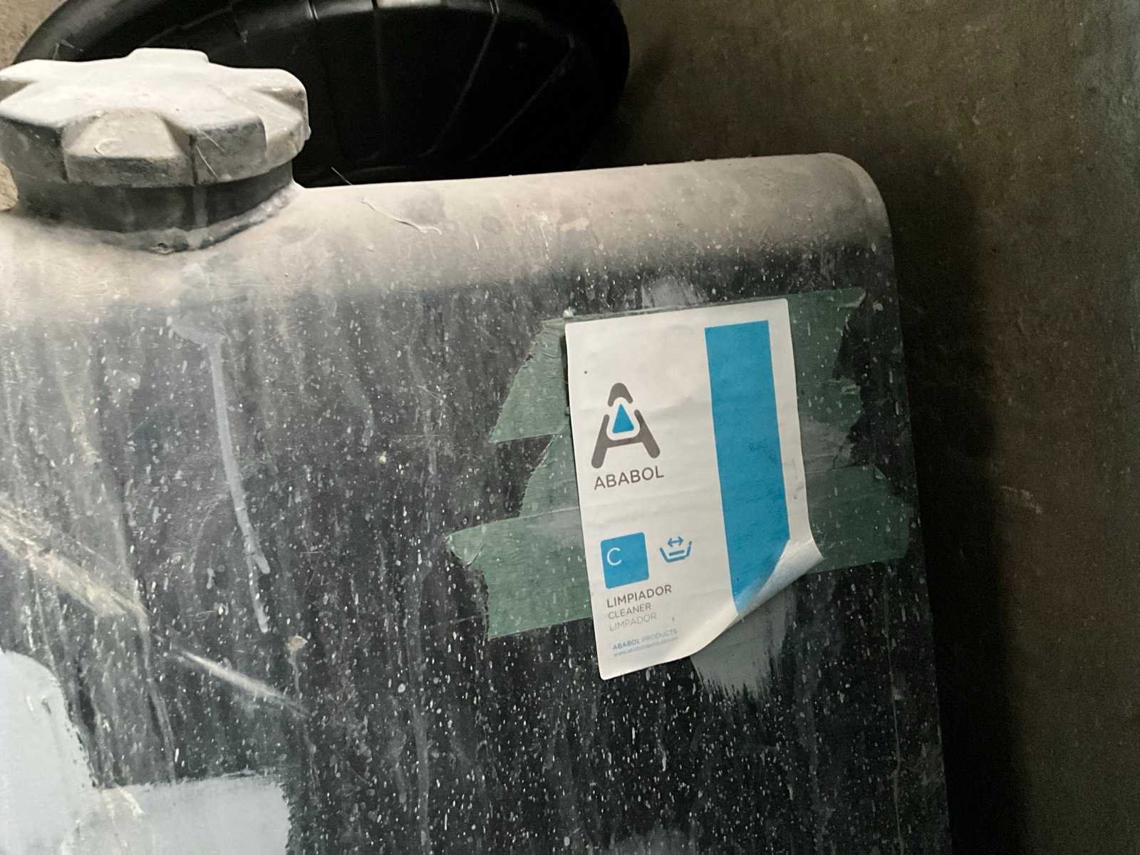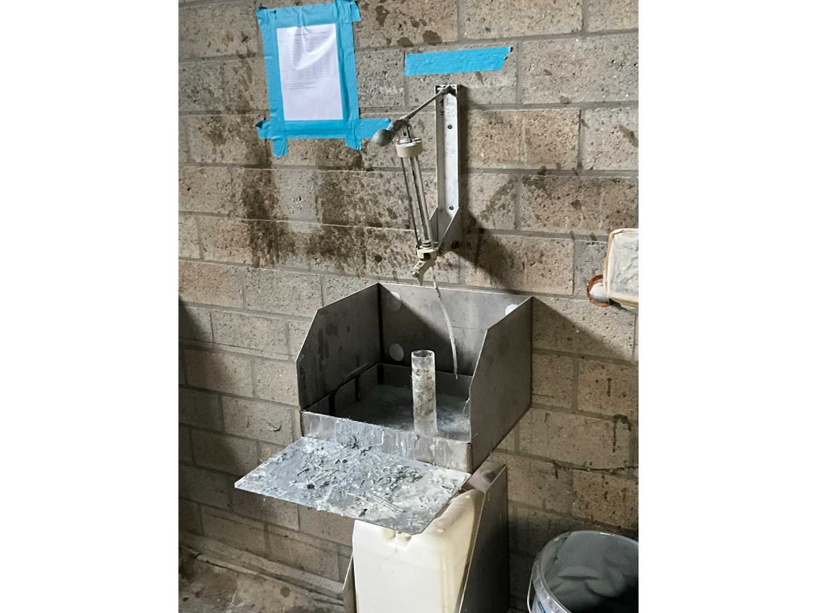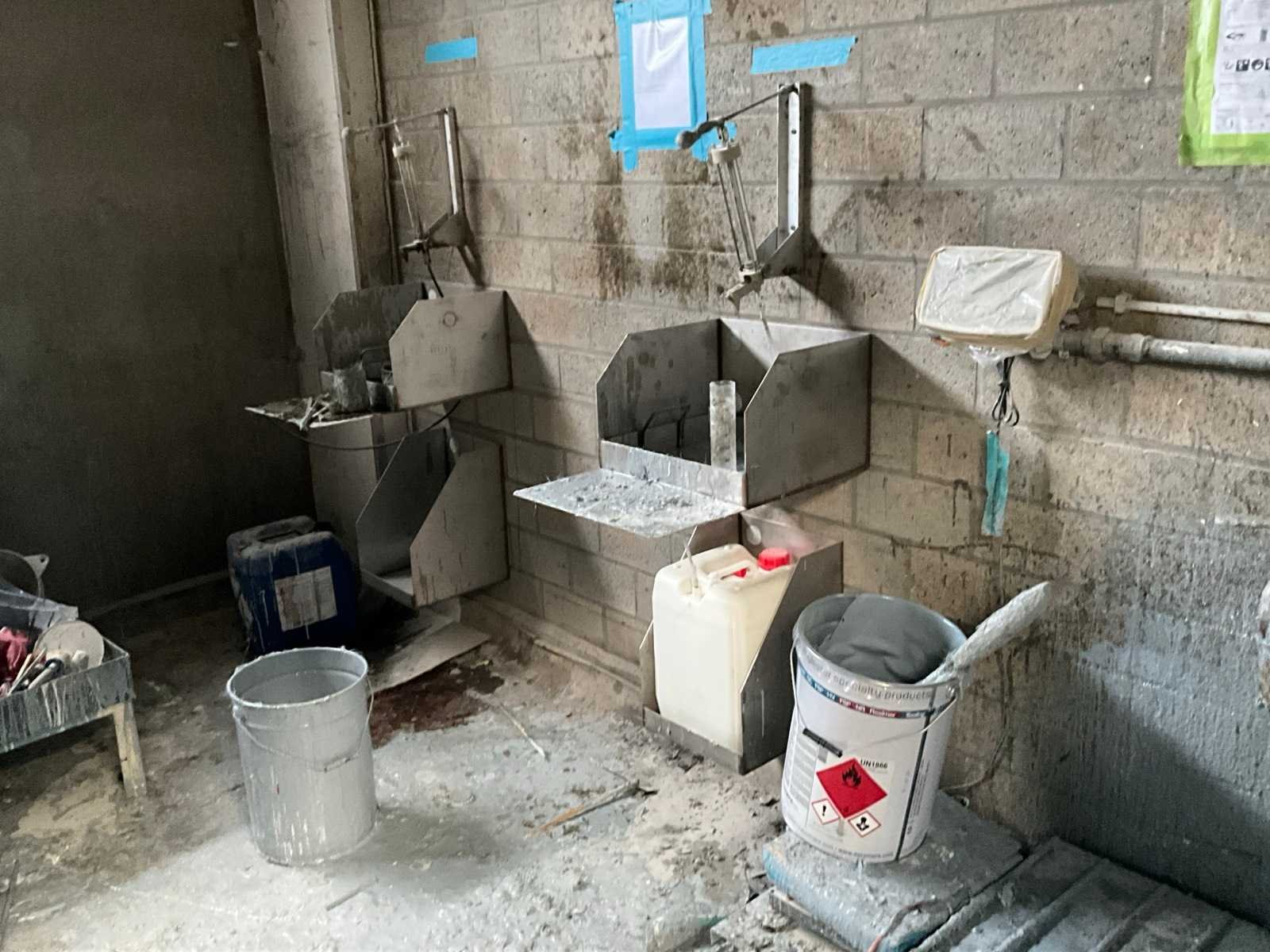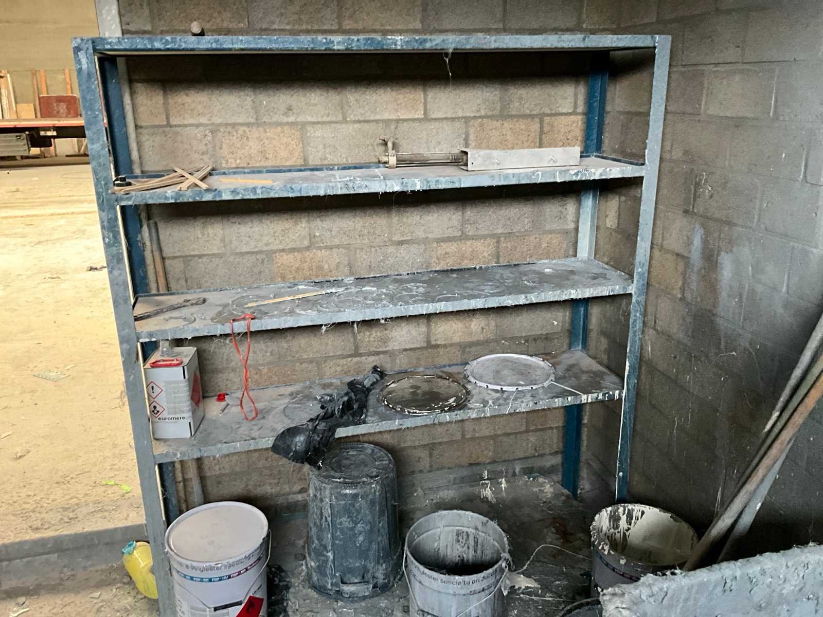 Inhoud Lokaal K, bestaande uit diverse verfmengbenodigdheden, 1x metalen rek