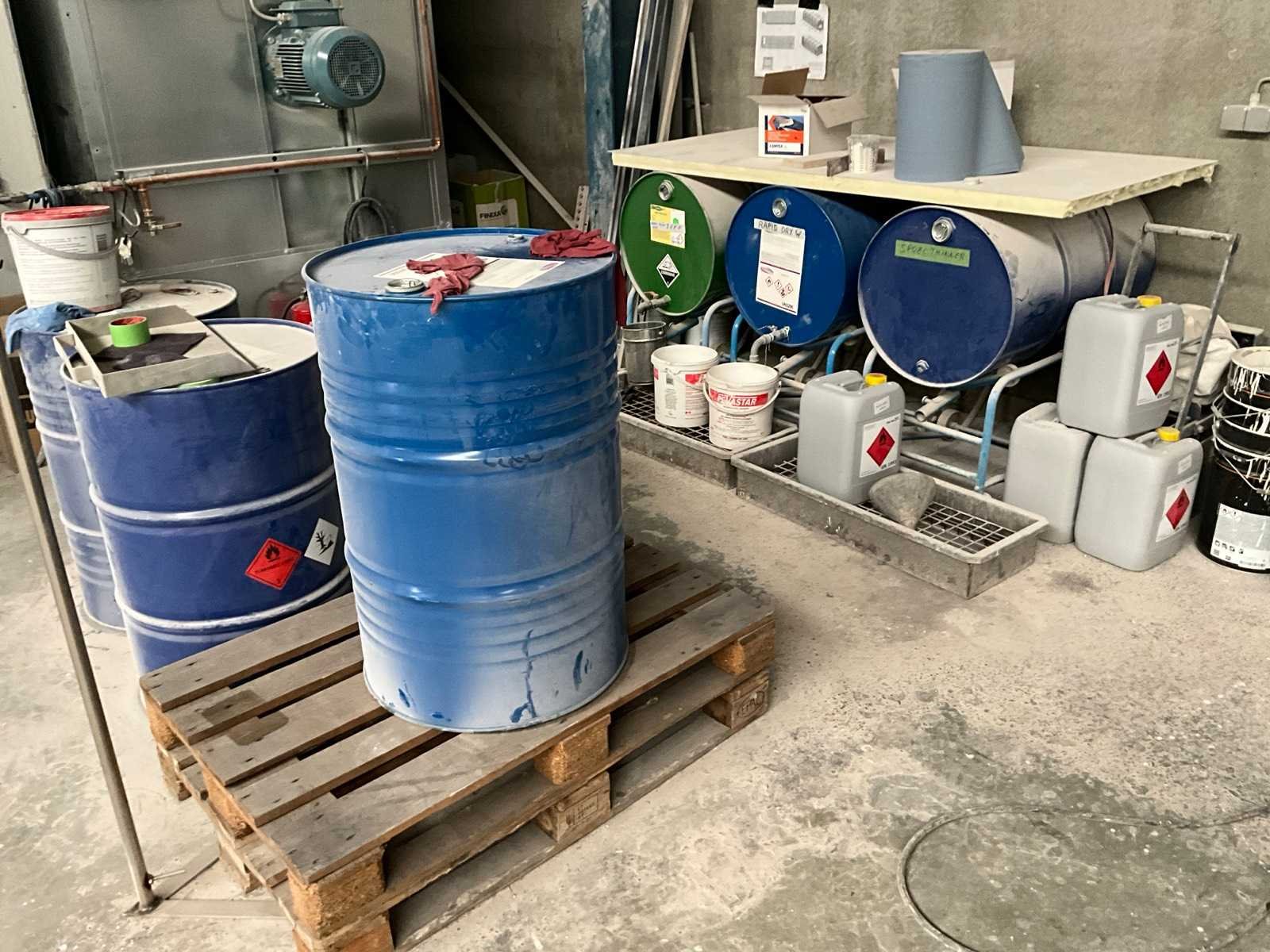 Compleet met partij lege blikken en 3 vaten mogelijk inhoudende zeep, rapid dry, spoel thinner, op 3 vatentrolleys en 3 lege vaten. Merk: Sprayco Type: RosAuto