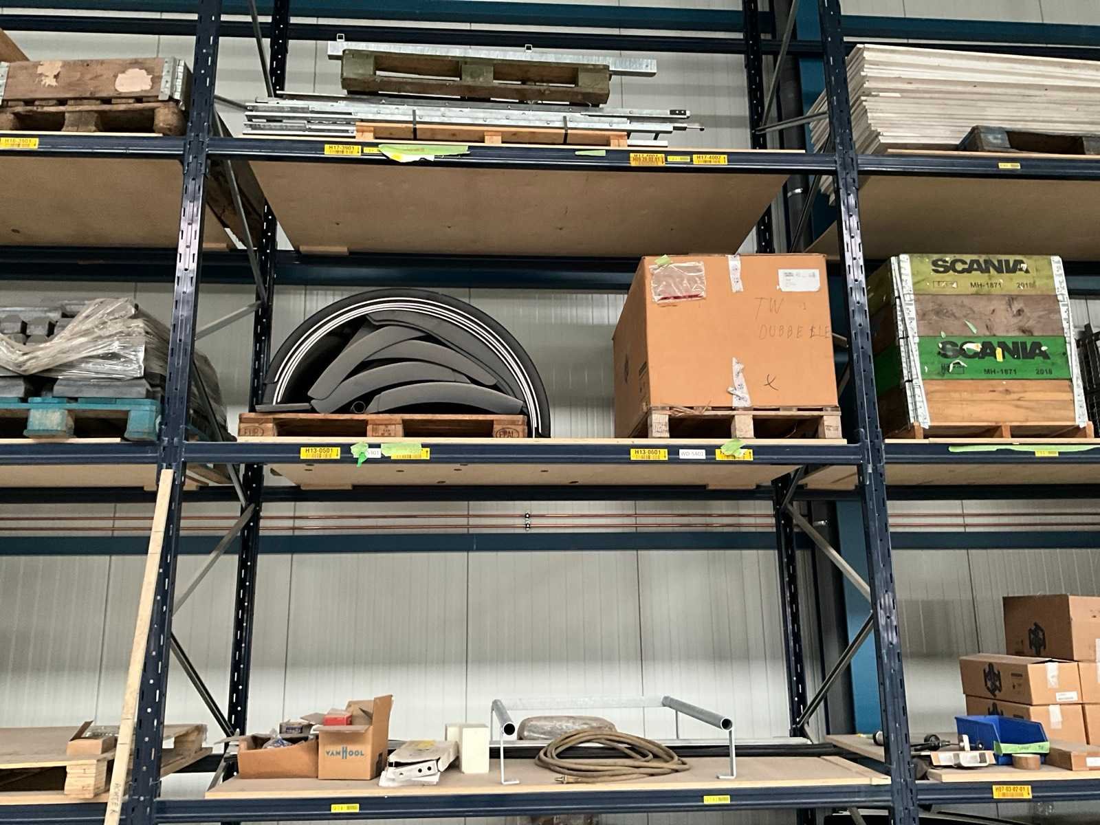 Met inhoud bestaande uit circa 12 spatborden, 7x gitterbox, isolatie platen, 3x pallet met rubber stootblokken 34x80 cm, enz.. Sectie afm. b: 2700mm Aantal staanders: 5 Aantal liggers: 40 Aantal legborden: 20 Demontabel: true Breedte: 123cm Hoogte: 500cm