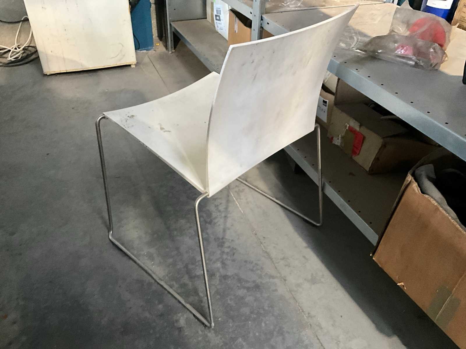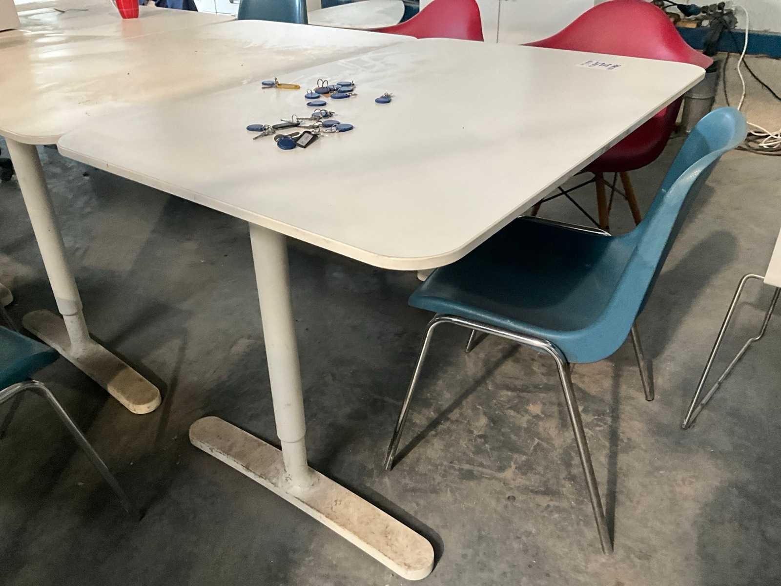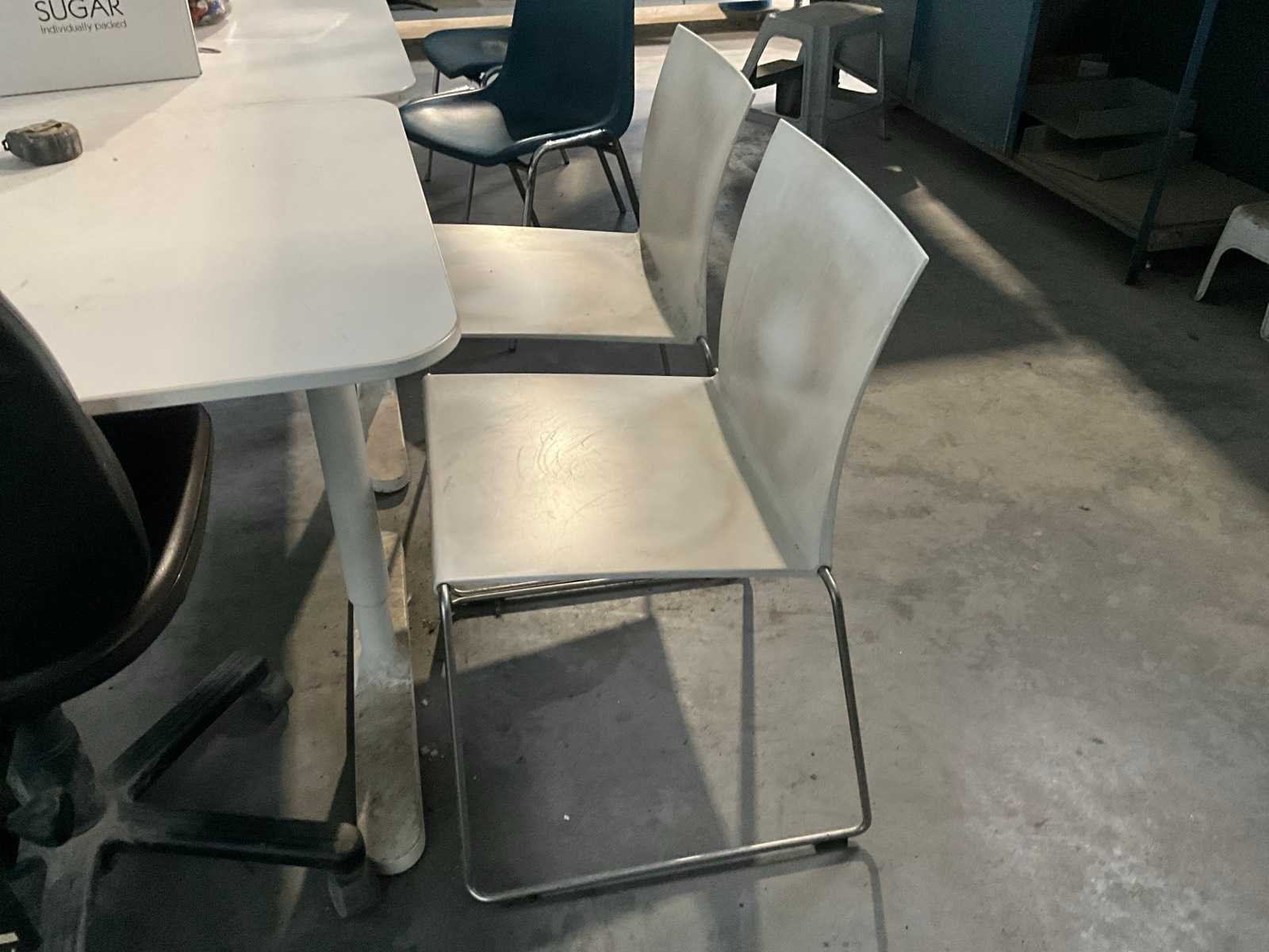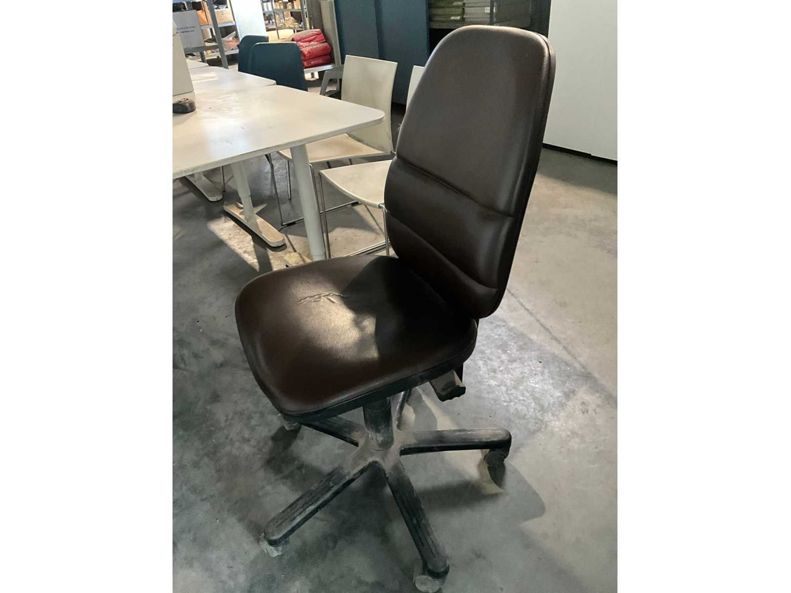 Bestaande uit: 4x bureautafel 120 x 80 x 75cm, 13 diverse bijzetstoelen, opbergkast voorzien van 2 deuren, 2x ladeblok en salontafel