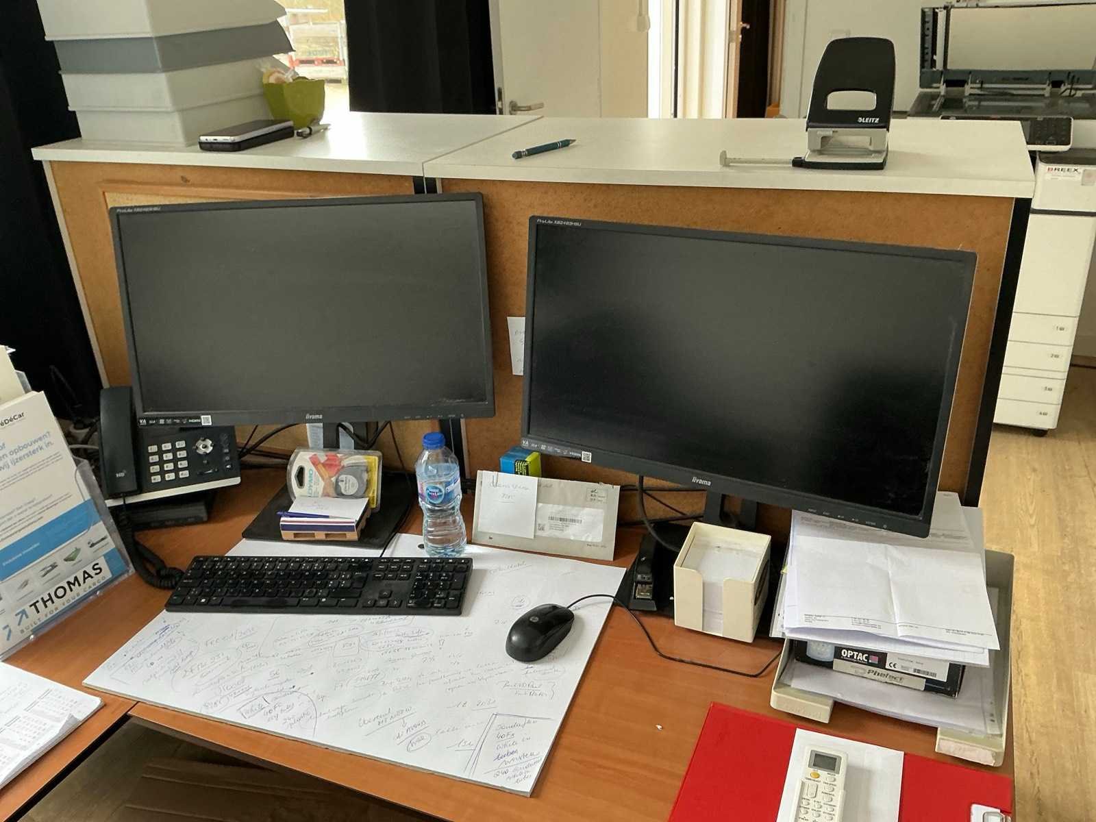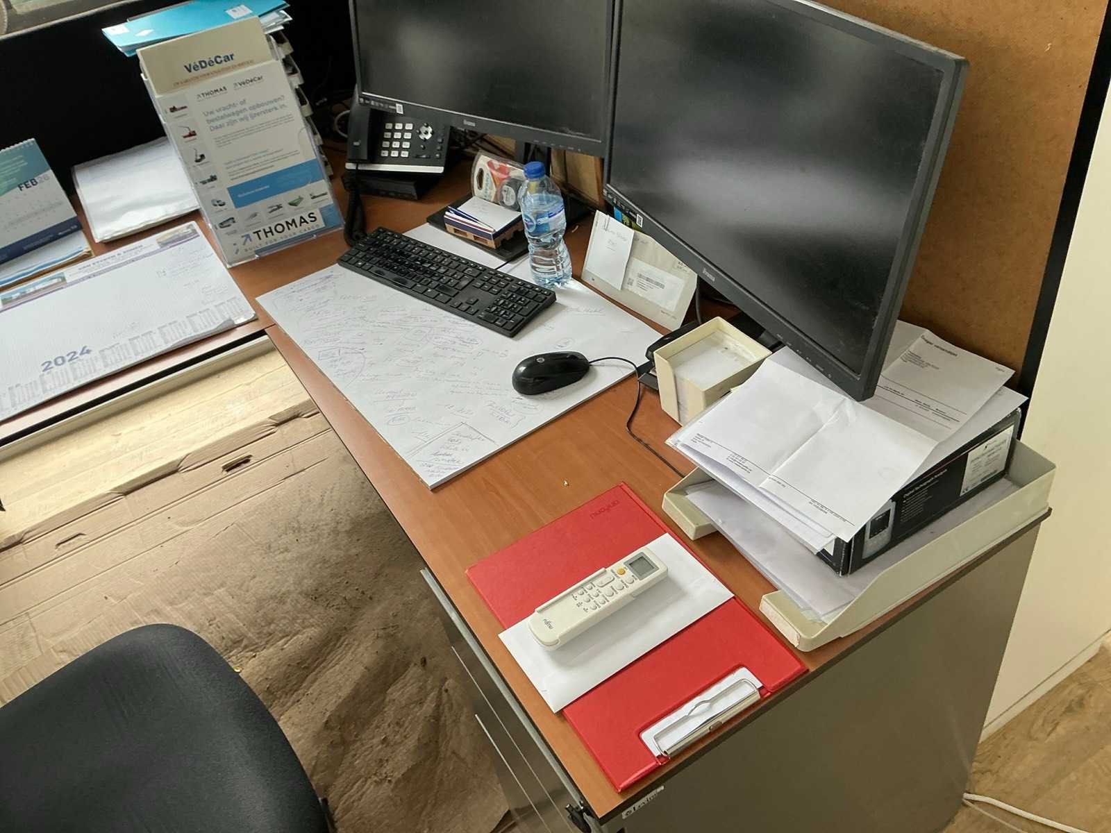 Inhoud bestaande uit: 3x hoge dossierkast 198x100 cm. 2x lage dossierkast 114x100 cm. Stofzuiger, waterkoker, Nespresso Machine, 5x dossierkast 126x80 cm. 3x dossierkast 72x80 cm. Hoekbureau. 2x computerscherm Ilyama. Bureaustoel. 2x wachtstoel, computerscherm LG….