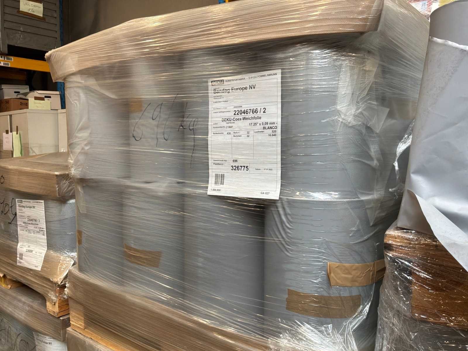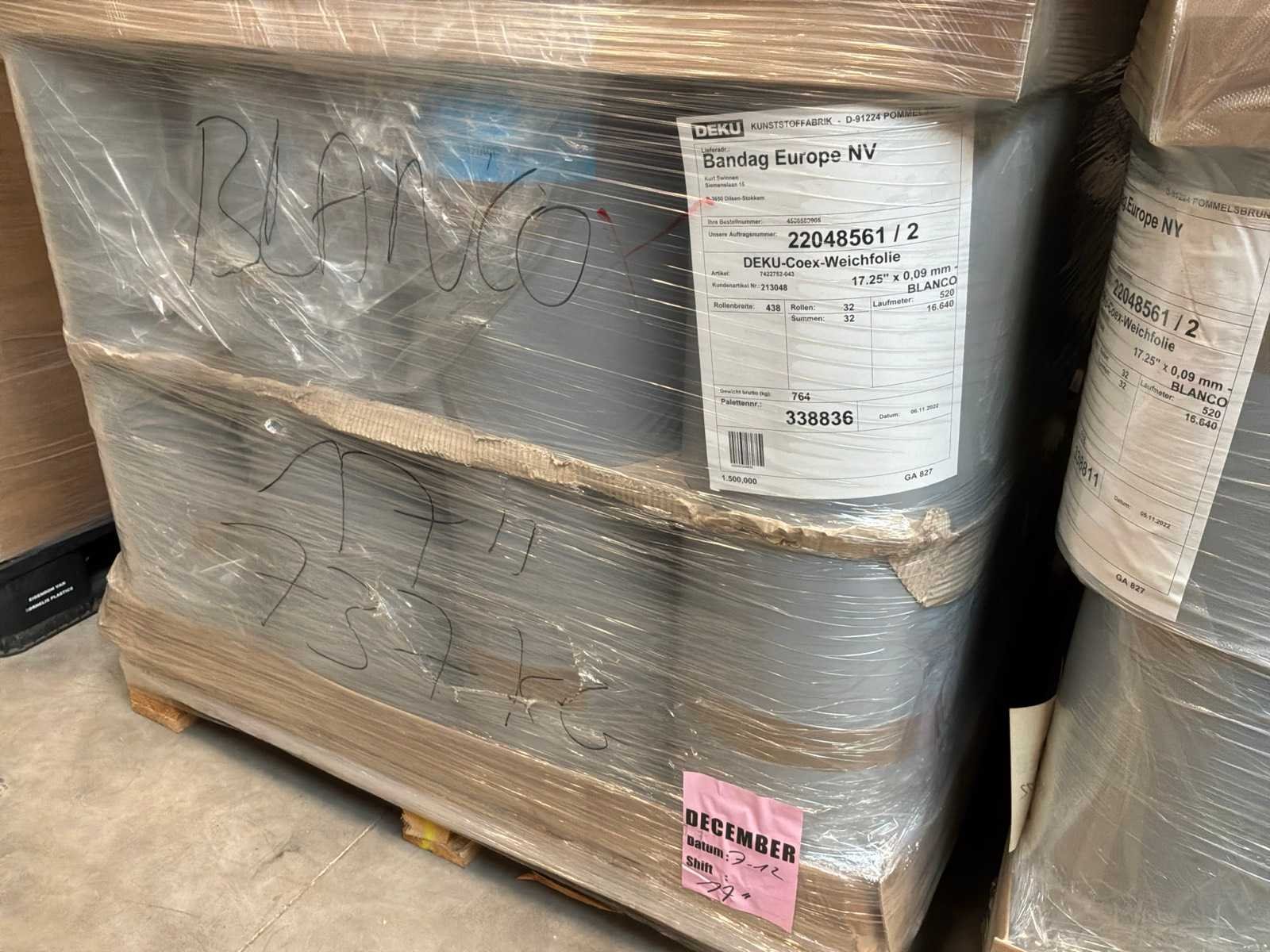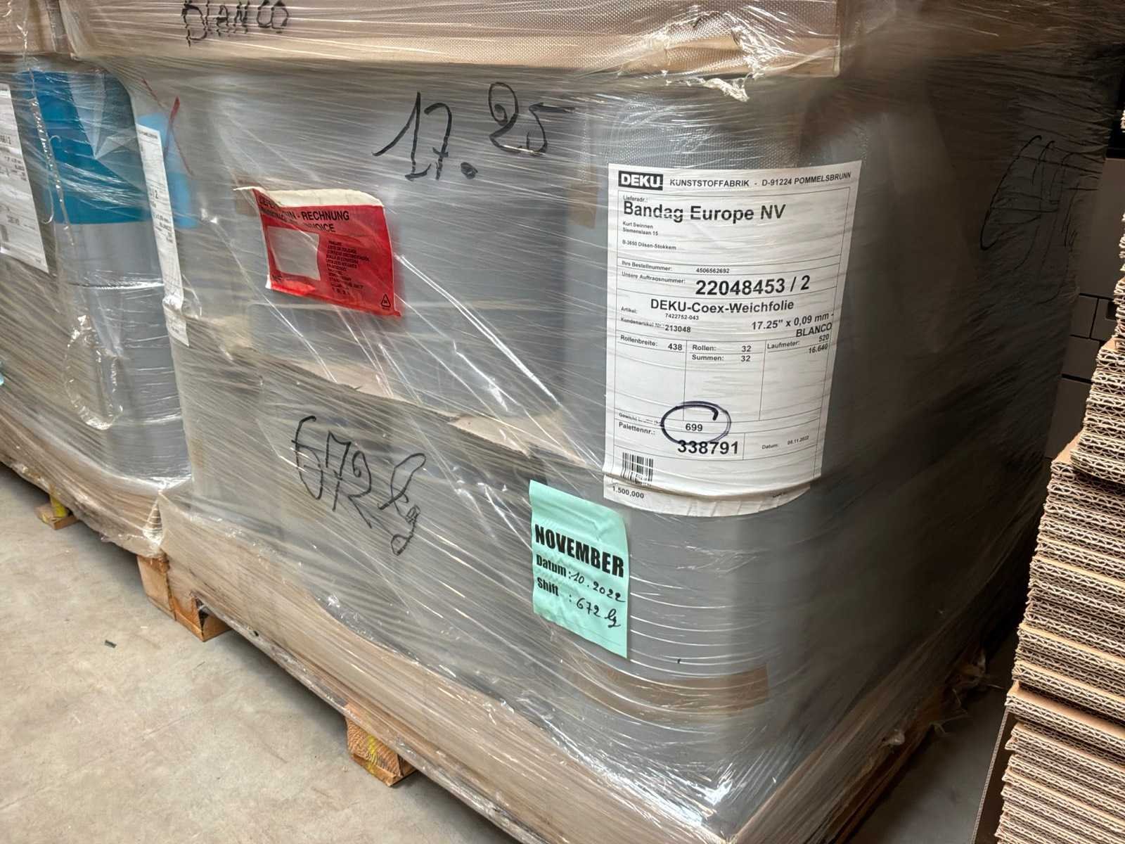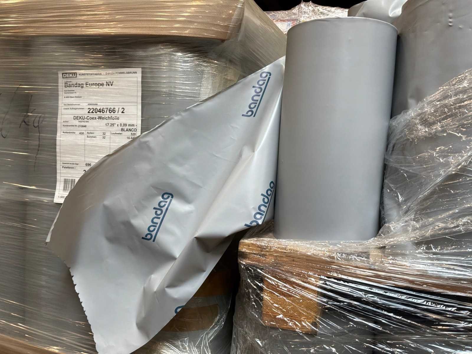 8 palletten met circa 200 volledige blanco rollen met breedte 438mm x 520 lopende meter. 2 palletten met rollen in diverse breedtes en lengtes. Langs 1 zijde bedrukt met ‘Bandag’ Merk: Deku-Coex Type: Blanco
