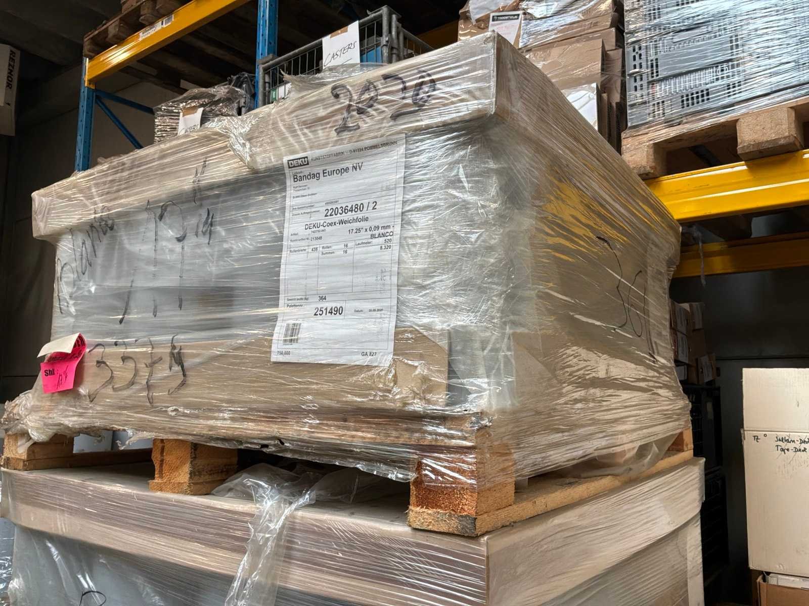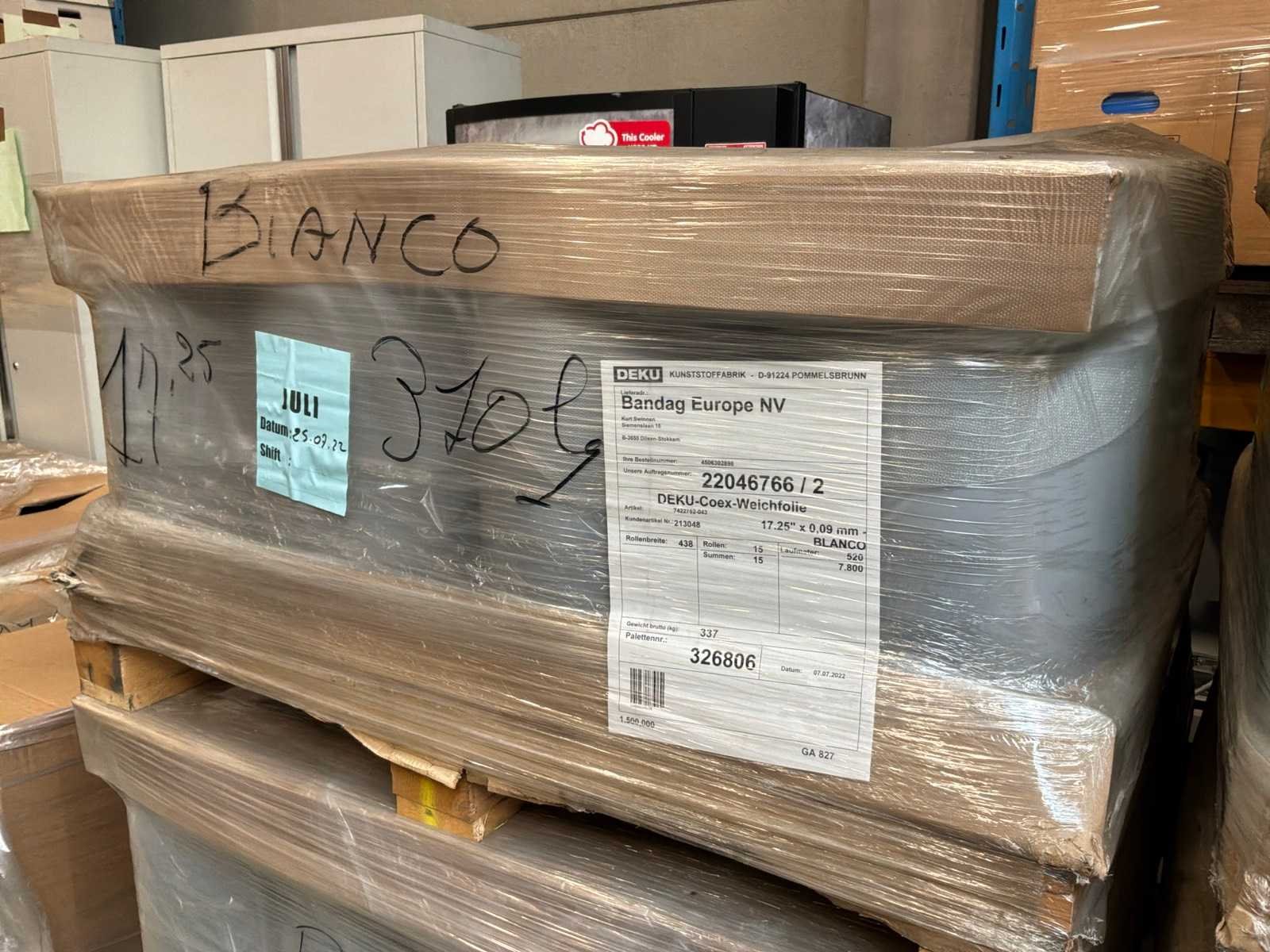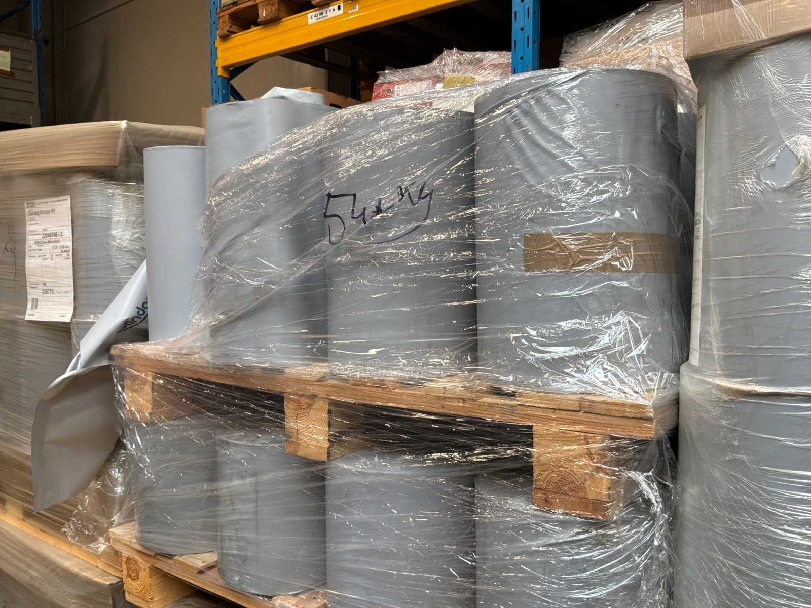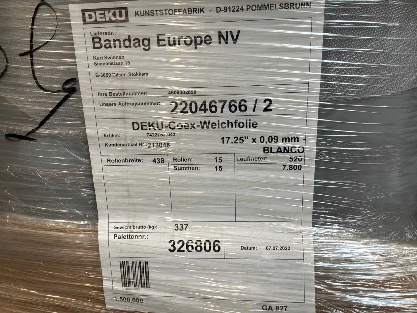 8 palletten met circa 200 volledige blanco rollen met breedte 438mm x 520 lopende meter. 2 palletten met rollen in diverse breedtes en lengtes. Langs 1 zijde bedrukt met ‘Bandag’ Merk: Deku-Coex Type: Blanco