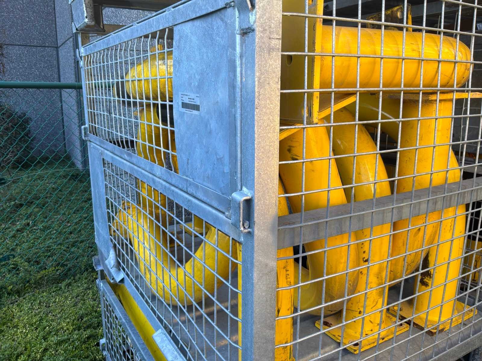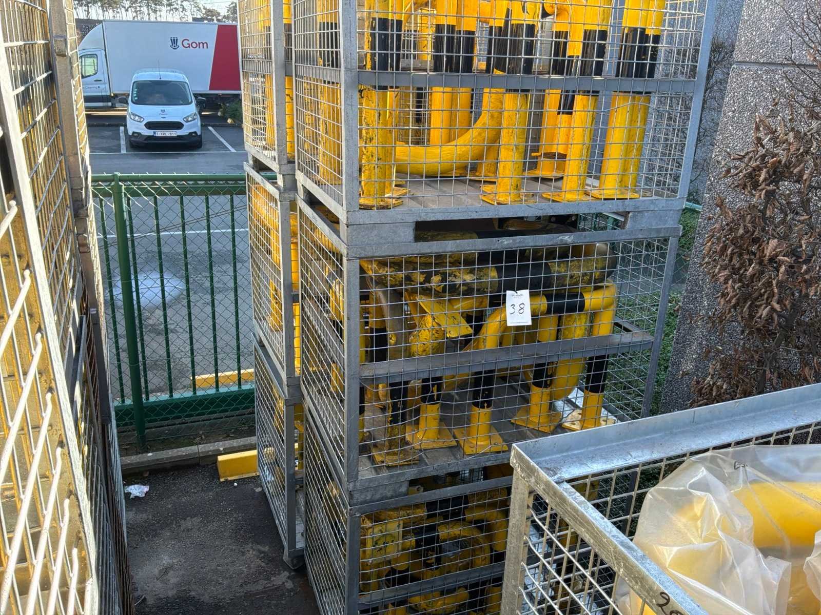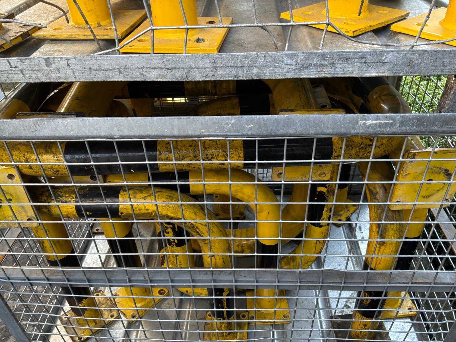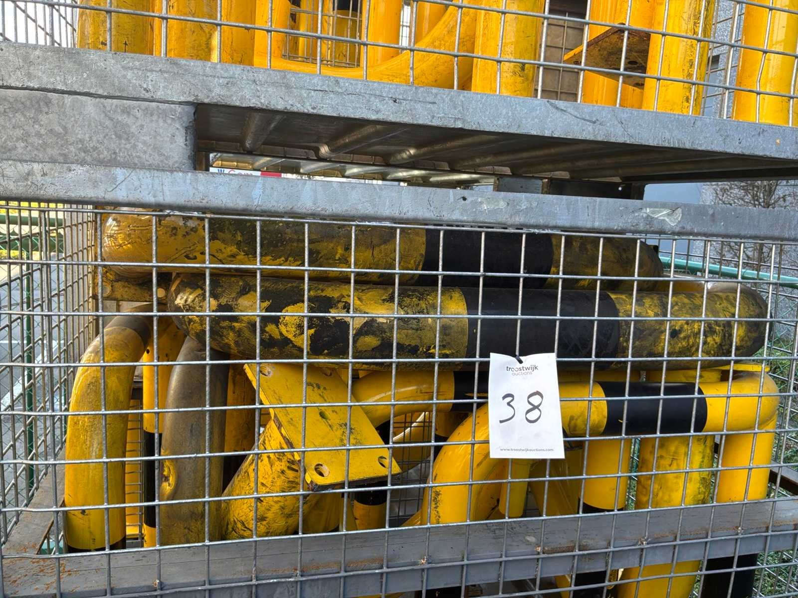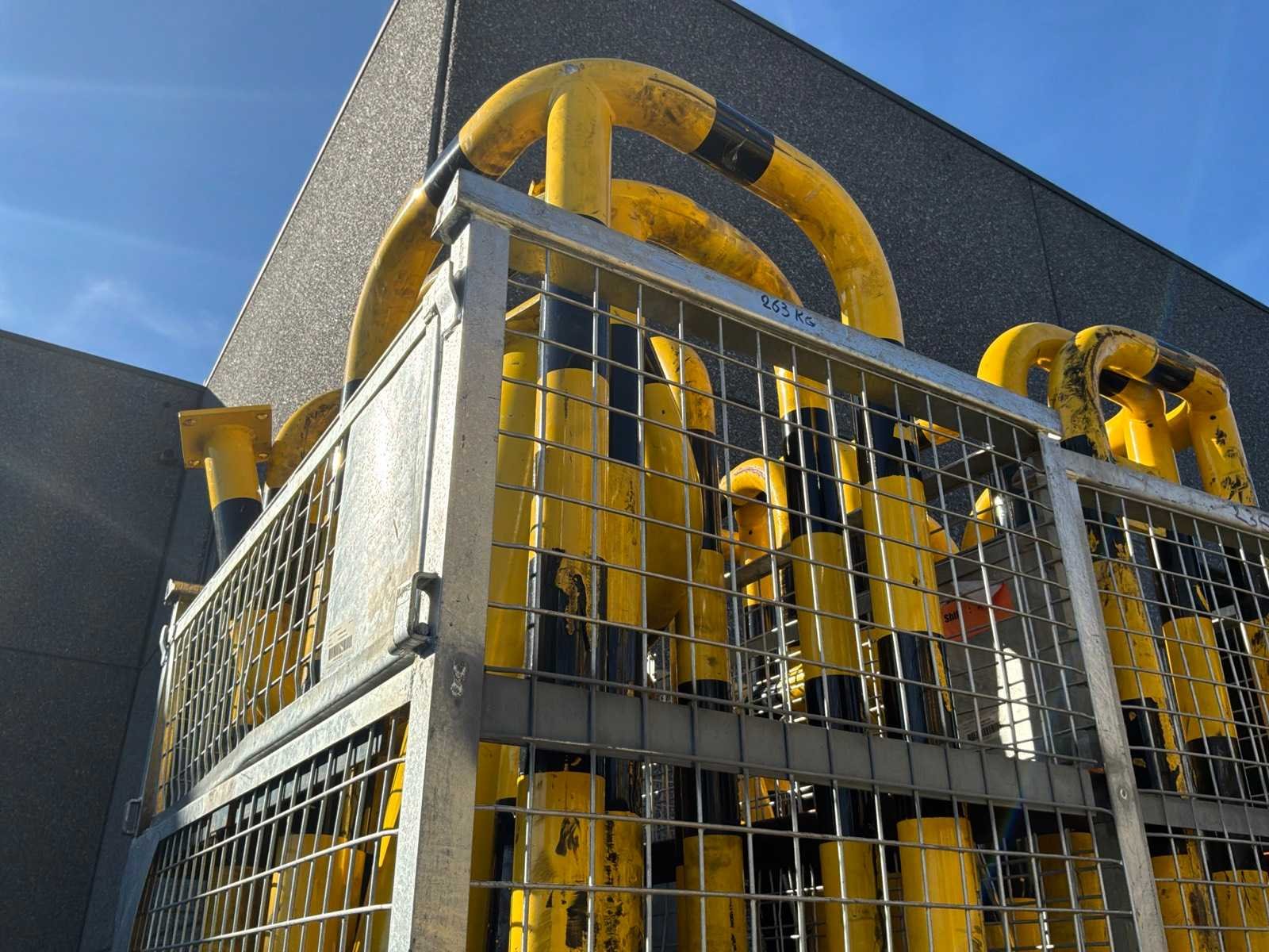6 draadcontainers met daarin diverse stootpalen, beschermbogen en -hoeken. Diverse afmetingen.
