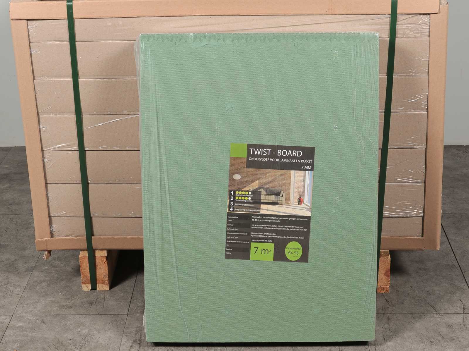 18db geluidscontactisolatie, 20 ton per m2 drukstabiliteit, egaliserend, milieu vriendelijk, 16 pakken a 7 m2 Merk: Twist Product type: Ondervloer Oppervlakte: 112m² Aantal m² per verpakking: 7m² Kleur: Isoboard