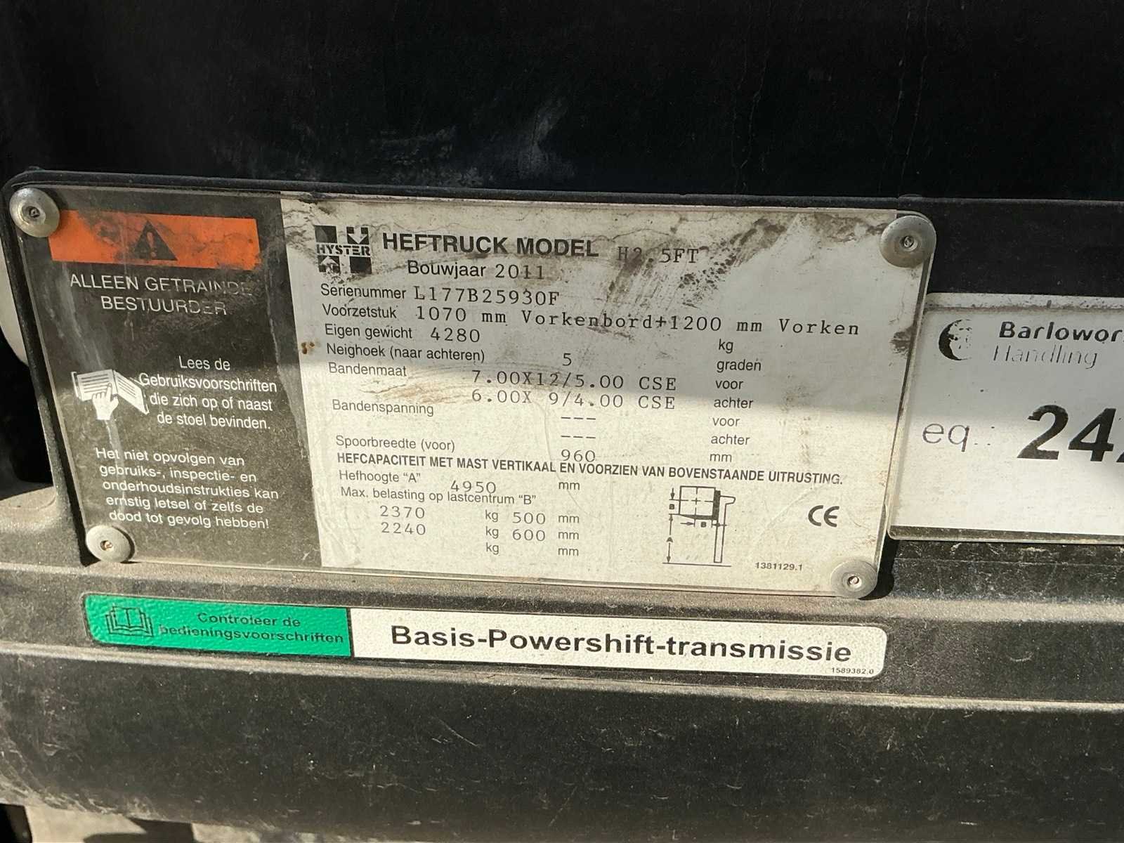 <Br> - Extra hydraulische functie. Merk: Hyster Type: H2.5FT Bouwjaar: 2011 Serienummer: L177B25930F Brandstof: Diesel Aantal wielen: 4 Free-lift: true Side-shift: true Triple mast: true Hefvermogen: 2500kg Lepellengte: 1200mm Max. hefhoogte: 4950mm Vol rubber banden: true Minimale doorrijhoogte: 2190mm