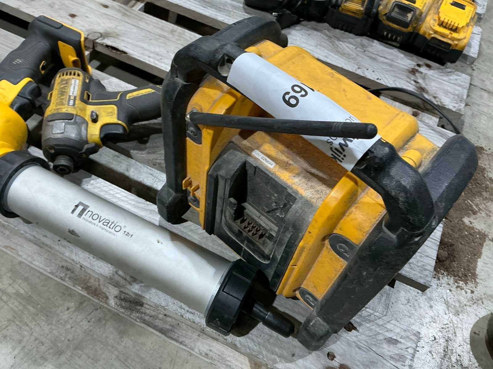 Zijnde slagschroevendraaier, werfradio DCR019 en siliconenpistool DCE580, zonder accu’s en acculader. Merk: Dewalt