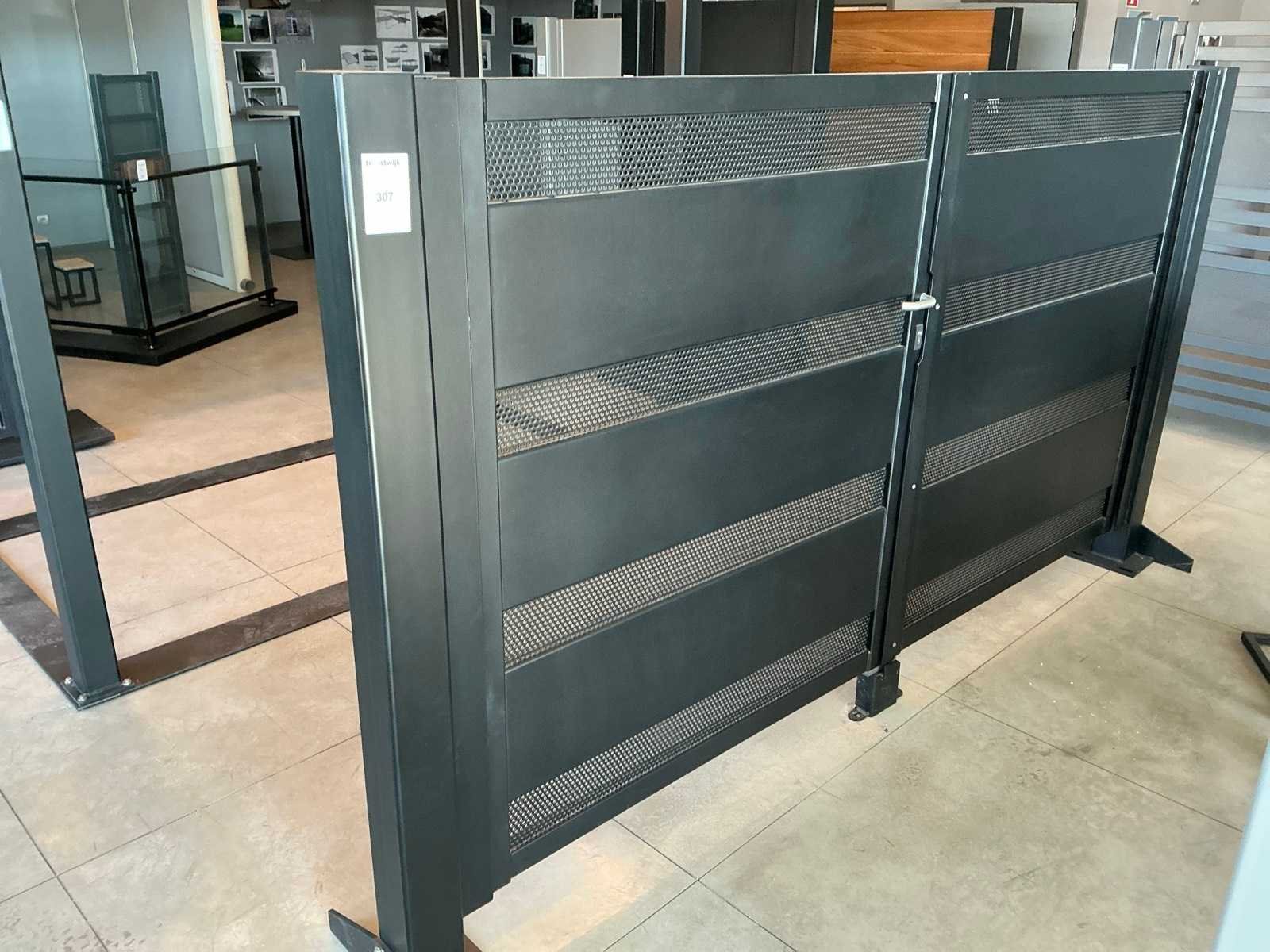 <Br> - Afmeting 1 vleugel: circa 130xH150cm. - Afmeting paal: circa 12x12xH167cm. - Totale breedte: circa 300cm. - zonder sleutel.