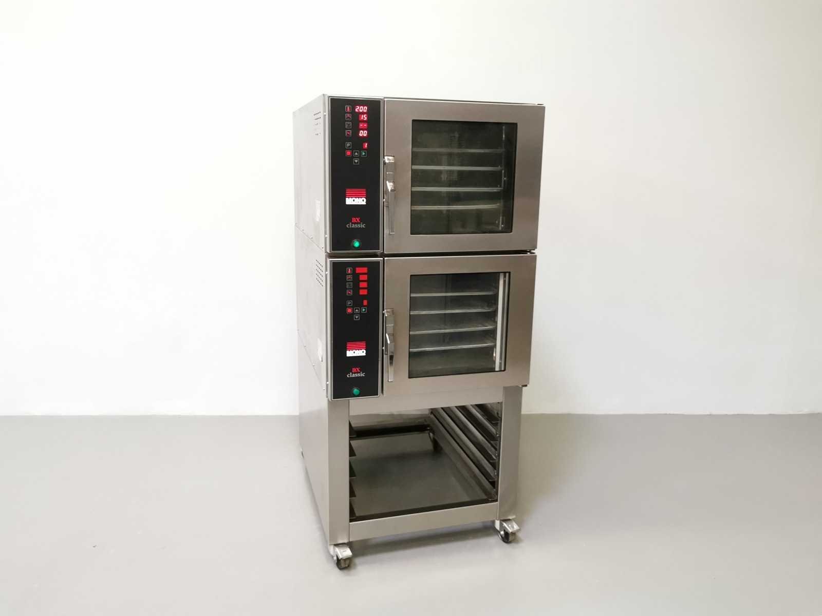 Dubbele stack op mobiele kar, uitgerust met bakplaten, extra lange capaciteit, 3 FASEN Merk: Mono Type: BX Classic Aantal niveau's: 8 Aansluiting: 380V Digitale besturing: true Elektrisch: true Rvs: true Totale afmeting L: 77cm Totale afmeting Breedte: 106cm Totale afmeting Hoogte: 76cm