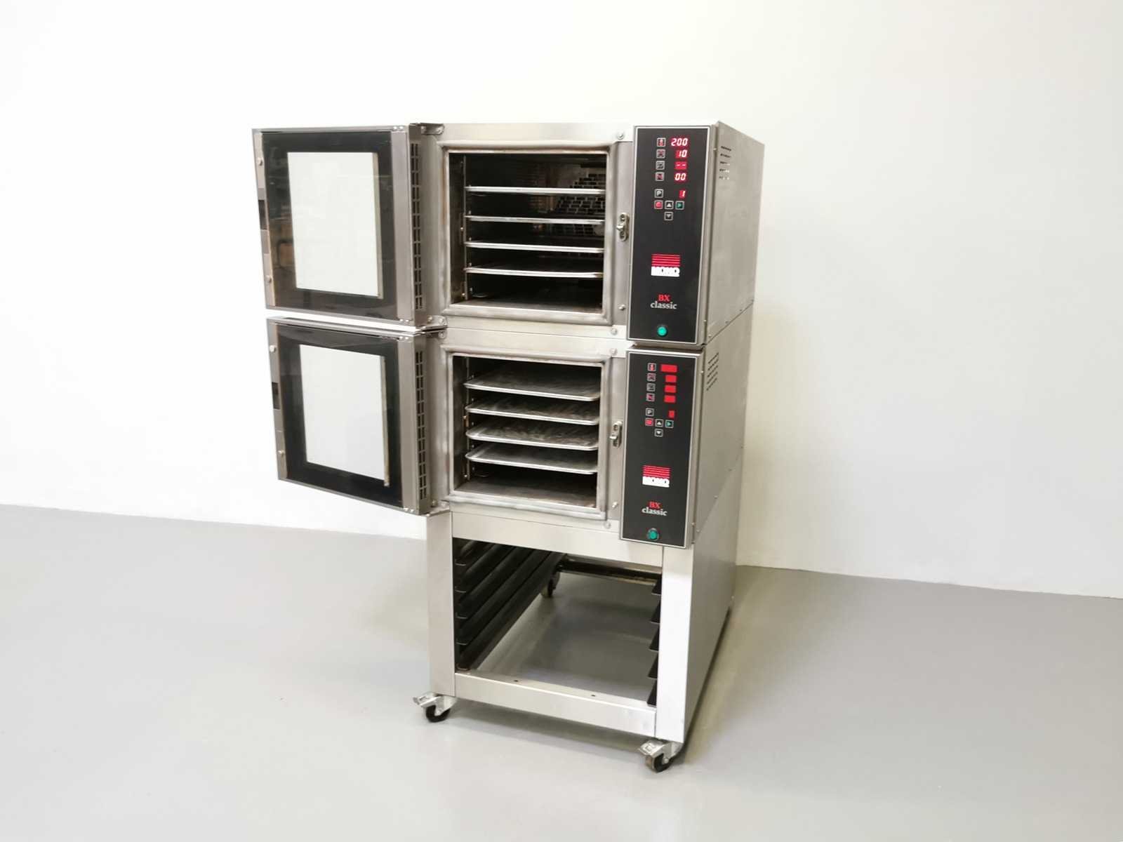 Dubbele stack op mobiele trolley, uitgerust met bakplaten, extra grote capaciteit, 3-FASIG Merk: Mono Type: BX Classic Aantal niveau's: 8 Aansluiting: 380V Digitale besturing: true Elektrisch: true Rvs: true Totale afmeting L: 77cm Totale afmeting Breedte: 106cm Totale afmeting Hoogte: 176cm