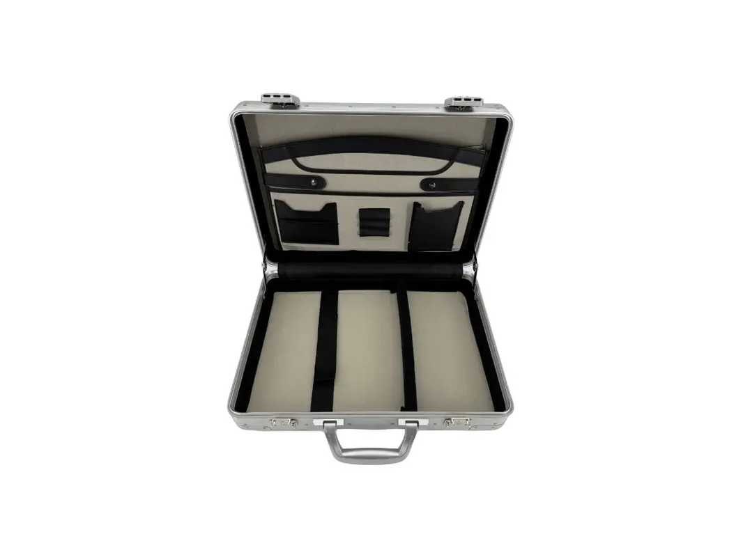 Laptopvak: 31 x 42 x 5 cm (geschikt voor laptops tot ca. 17 inch). Binnenzijde: laptopvak met smartphonevak, 3 pennenlussen, extra vakken. Sluiting: dubbele vergrendeling voor optimale veiligheid. Verstevigde randen: voor extra bescherming. Draaggreep: stevig en ergonomisch. Model: 2494zi Kleur: Zilver Gewicht: 2.3kg Lengte: 46cm Breedte: 35.5cm Hoogte: 12cm Materiaal: Aluminium GS Code: 5425003383953