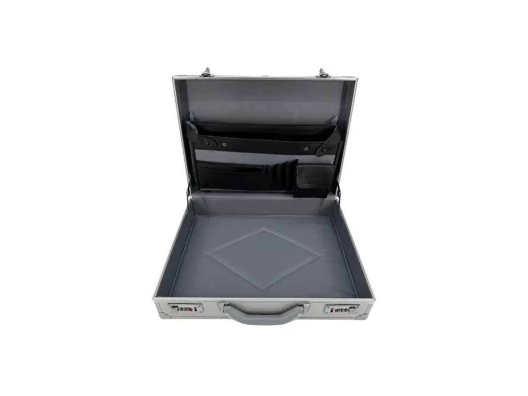 Buitenafmetingen: 45,5 x 12,5 x 35 cm (l x b x h). Binnenzijde: ruim hoofdvak met vakken voor A4-documenten en grote dossiermappen. Organiservak: vak voor mobiele telefoon, 3 pennenvakken, documentenvak, vakken voor creditcards en visitekaartjes. Sluiting: stevige kliksluitingen. Model: 2486 Kleur: Zilver Lengte: 45.5cm Breedte: 12.5cm Hoogte: 35cm Materiaal: Aluminium GS Code: 5425003384868