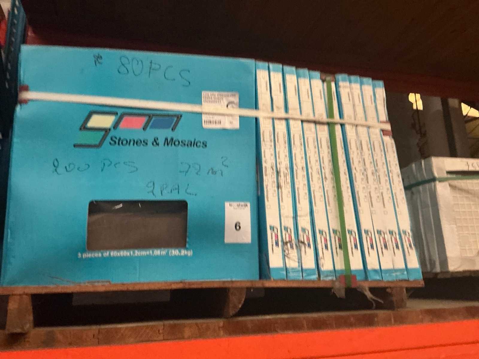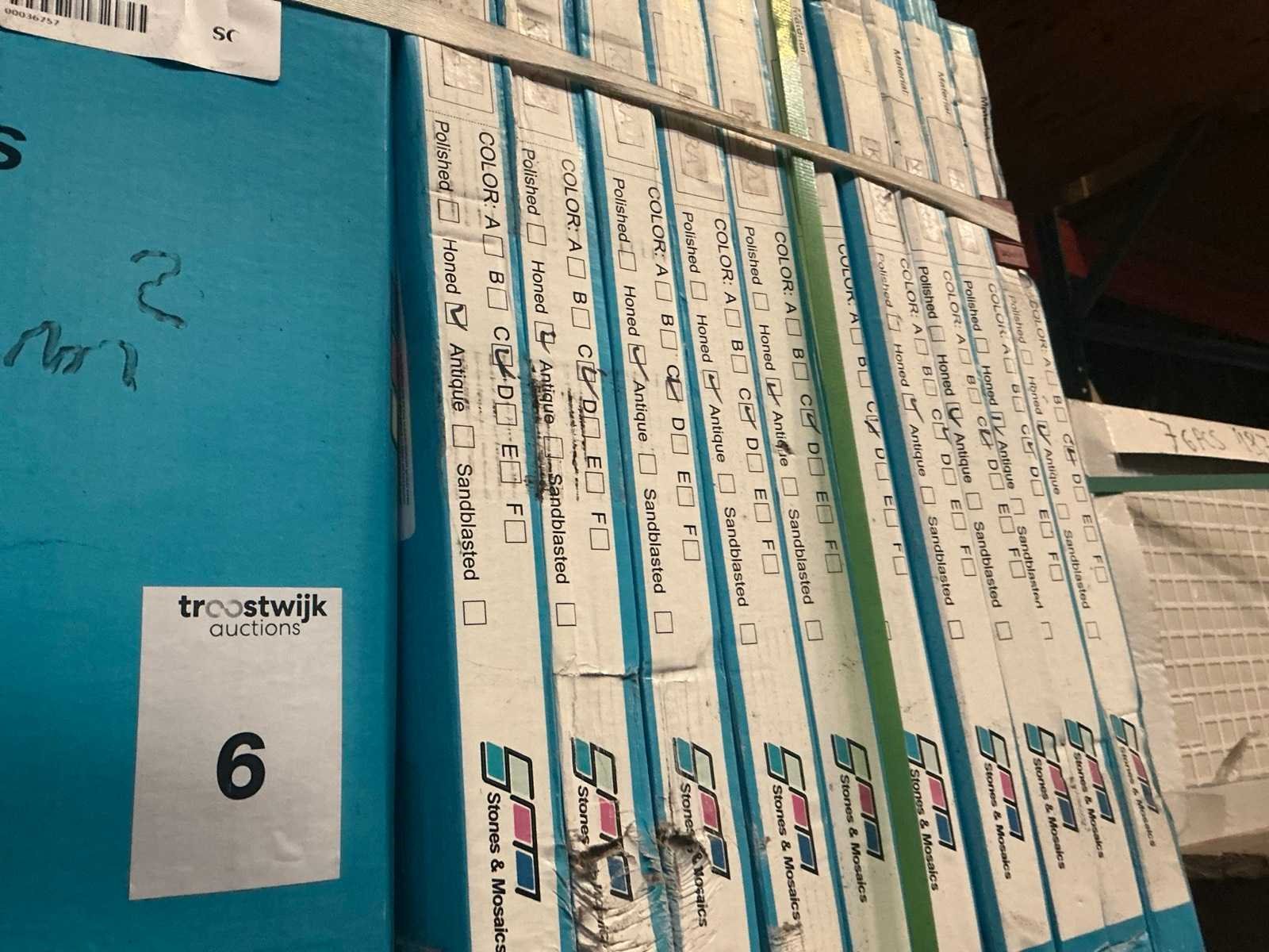 Op 2 x pallet Merk: Stones & Mosaics Lengte: 60cm Breedte: 60cm Dikte: 12mm Type: Marmocino Totaal oppervlakte: 72m²
