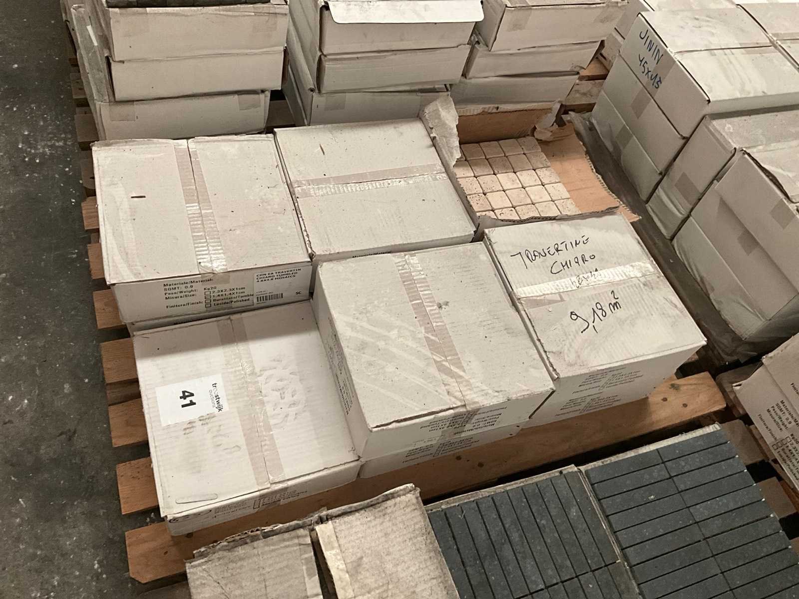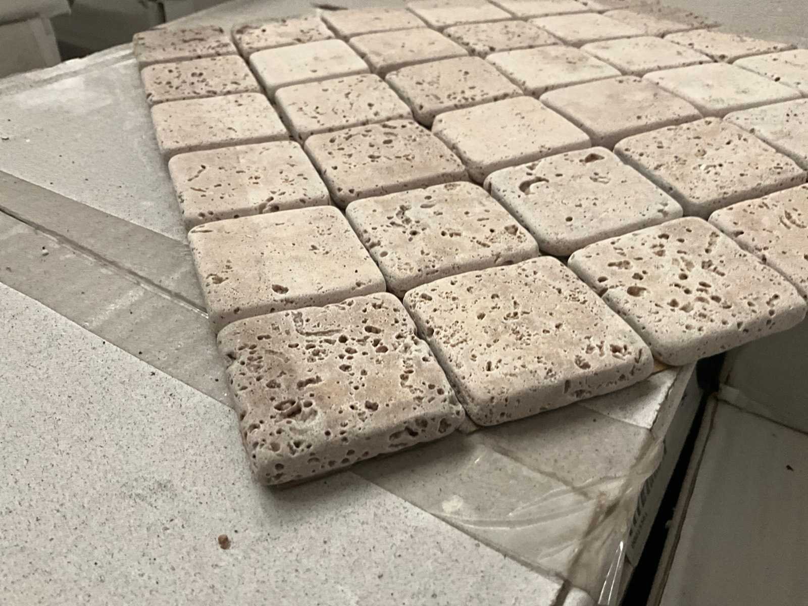 Tegels, Afmeting per tegel 30x30x1 cm, Mozaïek blokjes van 48x48 mm, op pallet Type: Basalt tranertine Chiaro Aantal pakken: 10 Totaal oppervlakte: 9.18m²