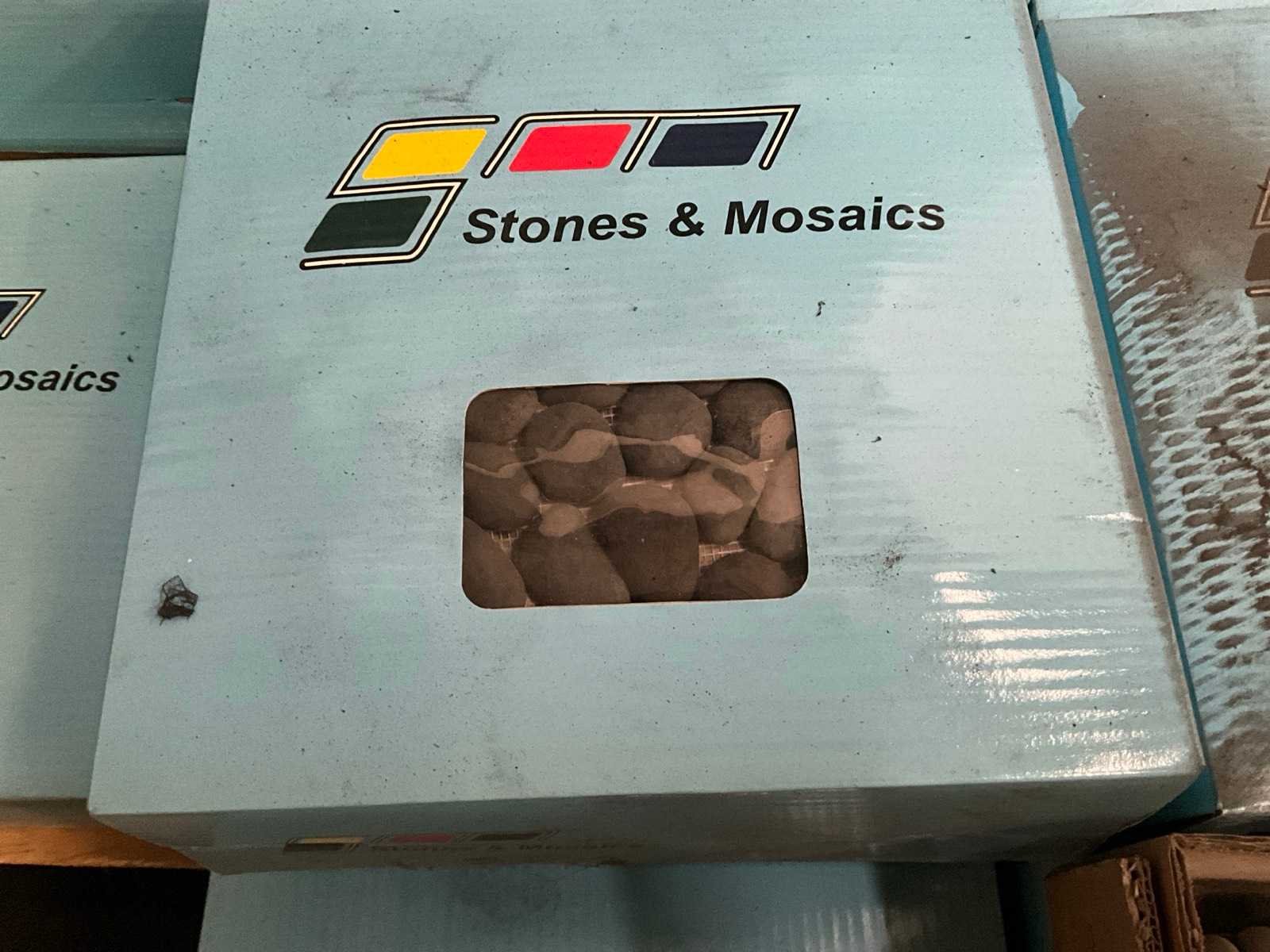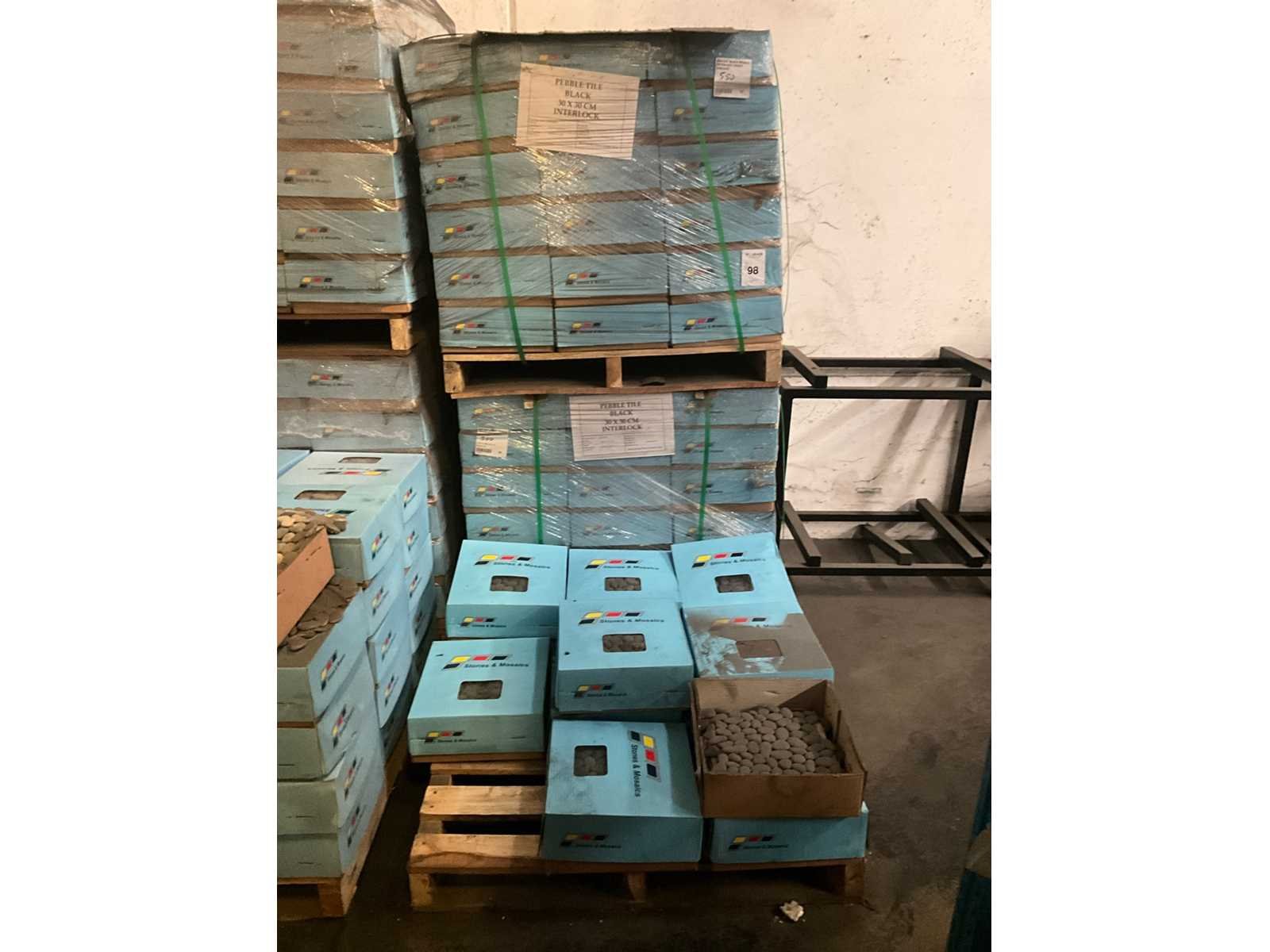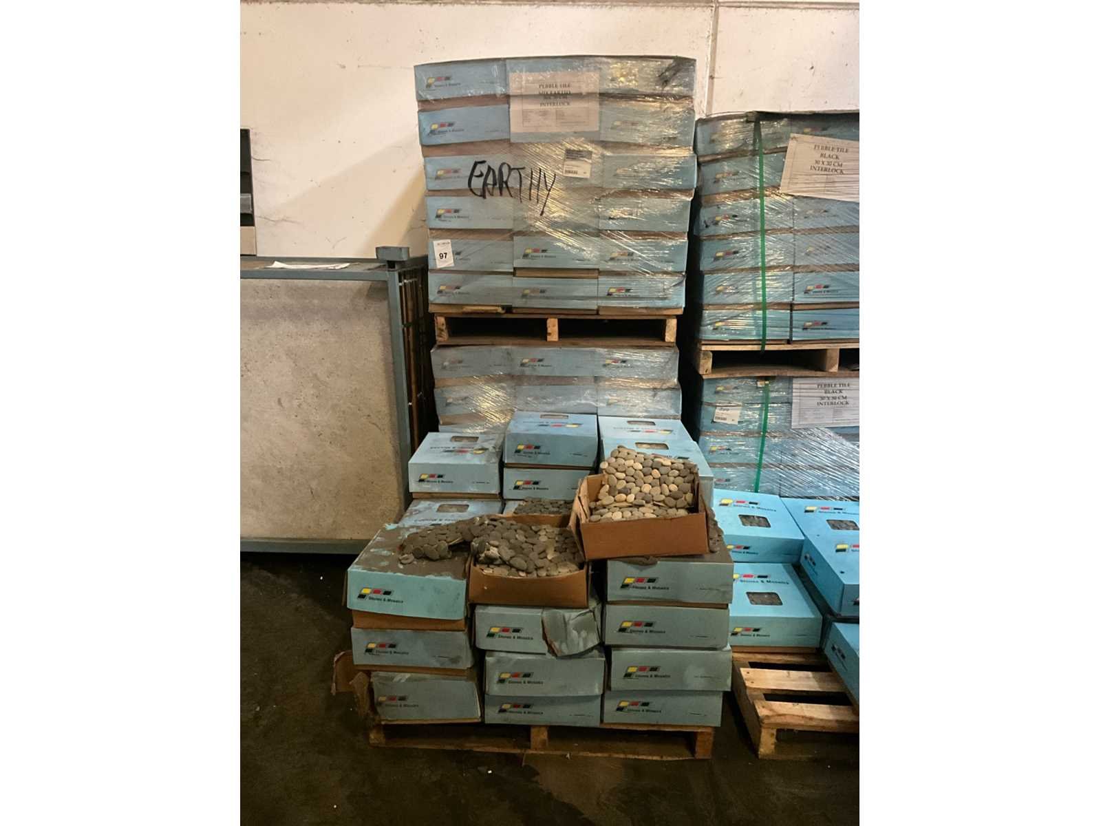 Bestaand uit 3x pallet met circa 110 dozen met 11 stuks Merk: Stones & Mosaics Lengte: 30cm Breedte: 30cm Materiaal: Keien Dikte: 10mm Type: Black interlock Totaal oppervlakte: 100m²