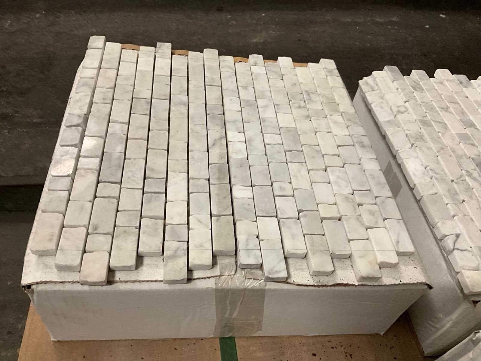 Op 2 pallet, Mosaics 18 mm breed men diverse lengtes Lengte: 30cm Breedte: 32cm Dikte: 10mm Type: Carara broken edge Totaal oppervlakte: 35m²