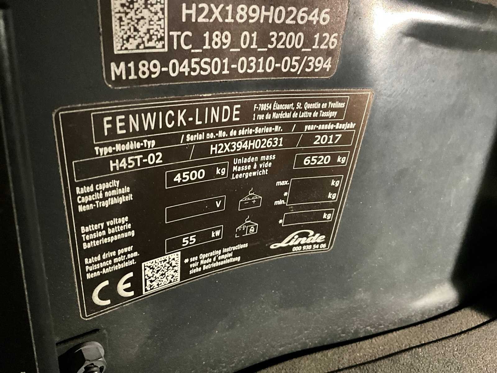 Voorzien van navulbare lpg tank, semi gesloten cabine, hydrostaat aandrijving, 4-vorkentoestel, derde en vierde hydraulisch ventiel op vorkenbord, opstartcode 011234, zonder verdere gegevens, urentellerstand niet te controleren Merk: Linde Type: H45T-02 evo Bouwjaar: 2017 Serienummer: H2X394H02631 Brandstof: LPG Soort band: Volrubber banden Aantal wielen: 4 Side-shift: true Hydraulisch verstelbare lepels: true Duplex mast: true Eigen gewicht: 6425kg Hefvermogen: 4500kg Lepellengte: 1150mm Hefhoogte: 3000mm Vol rubber banden: true Minimale doorrijhoogte: 2450mm Totale afmeting L: 4200mm Totale afmeting Breedte: 1400mm Totale afmeting Hoogte: 2450mm LPG: true