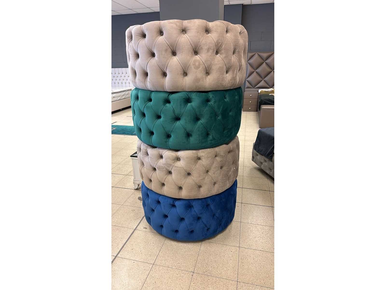 Type: ronde poef diverse kleuren kleur: beige, groen, blauw stof; staat: showroom modellen;